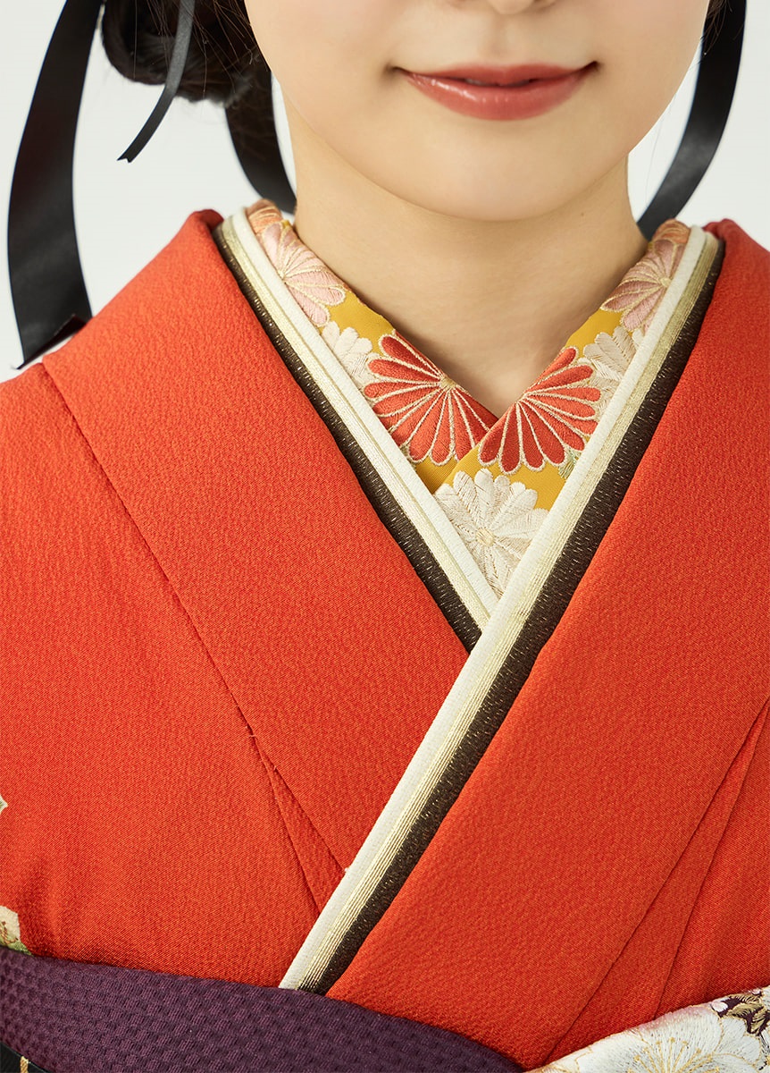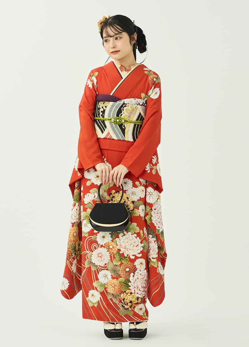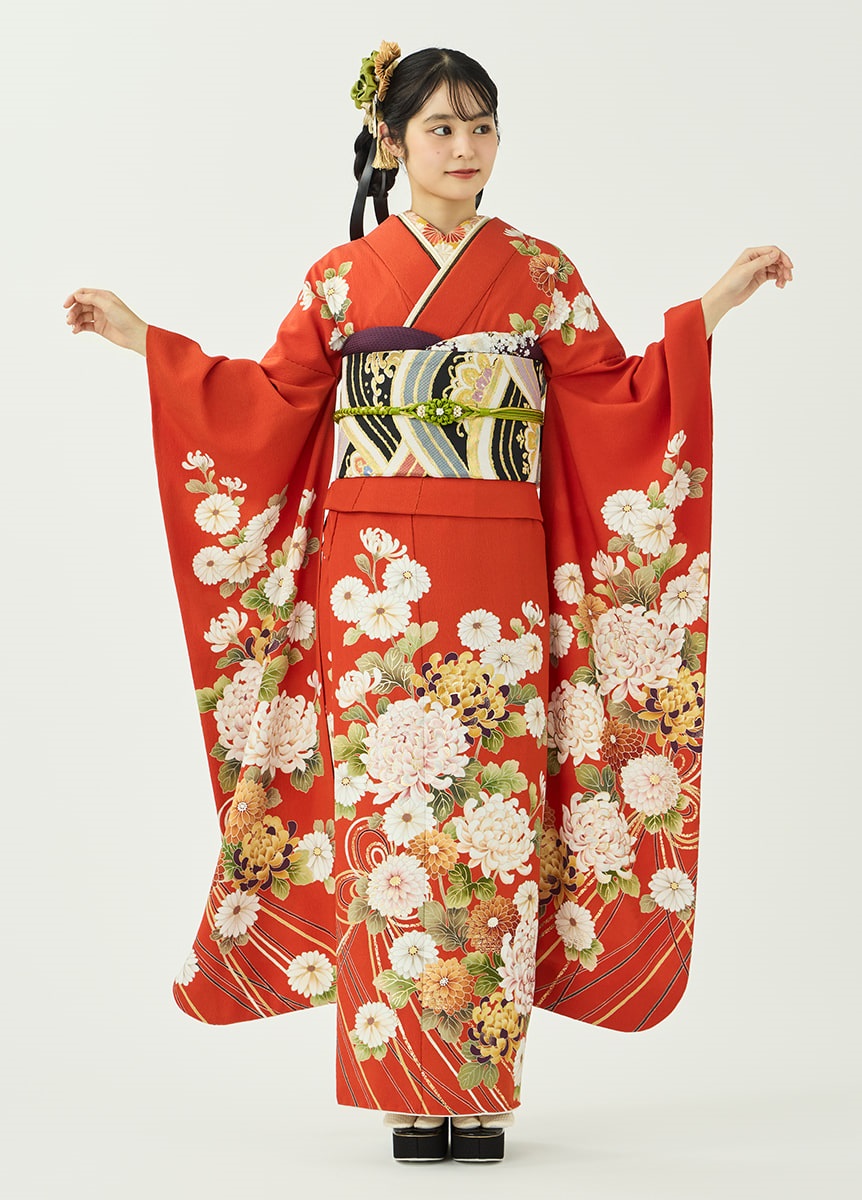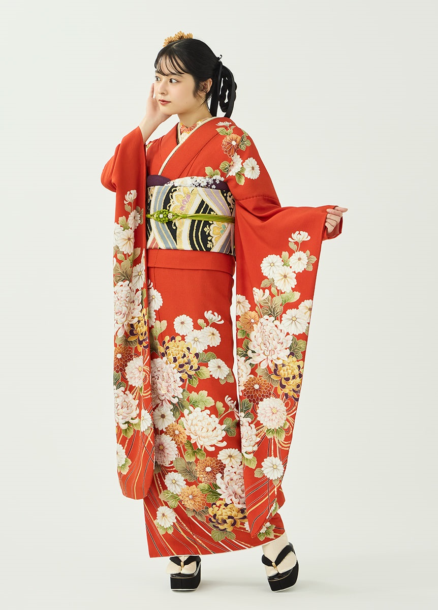 きものやまとオリジナルデザインの振袖です。 華やかで、クラシックな品の良さがただよう振袖です。両肩に柄を配し、アンティークのような雰囲気に仕上げました。地色の紅緋(べにひ)は菊の白を引き立てます。スタイリングは格式を感じさせるコーディネートにしました。