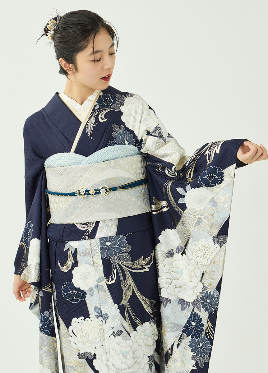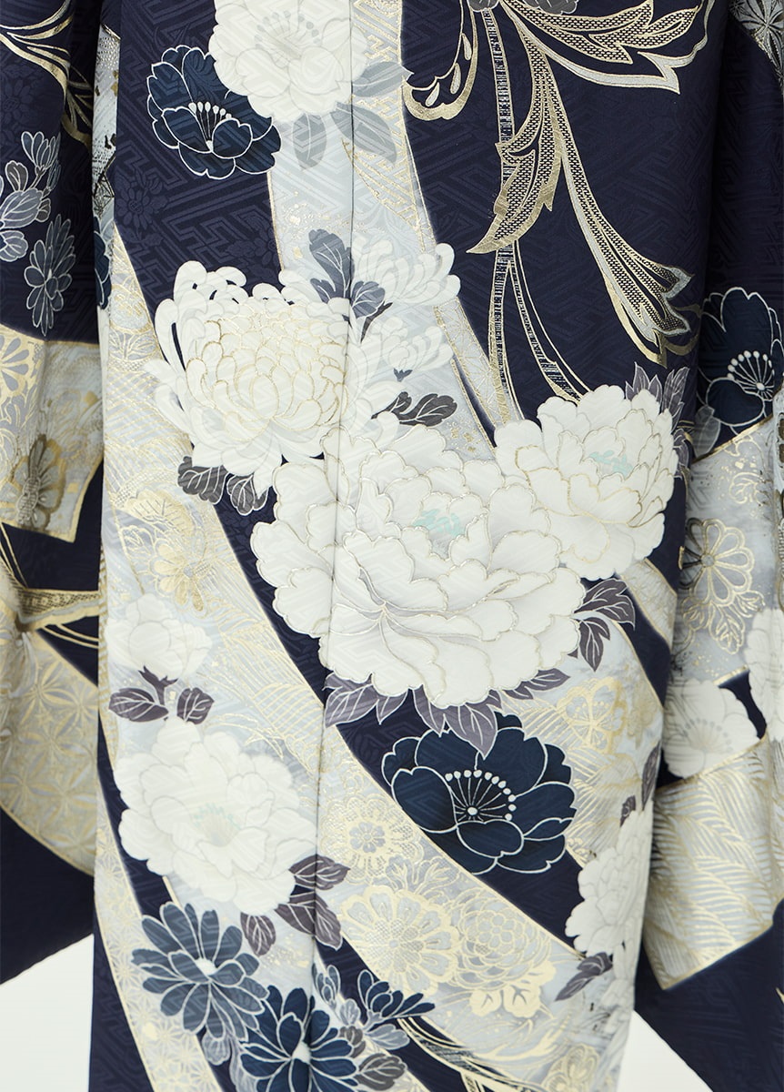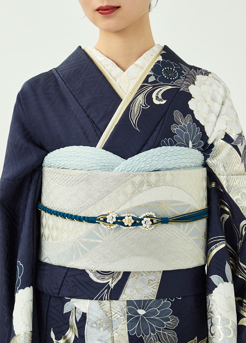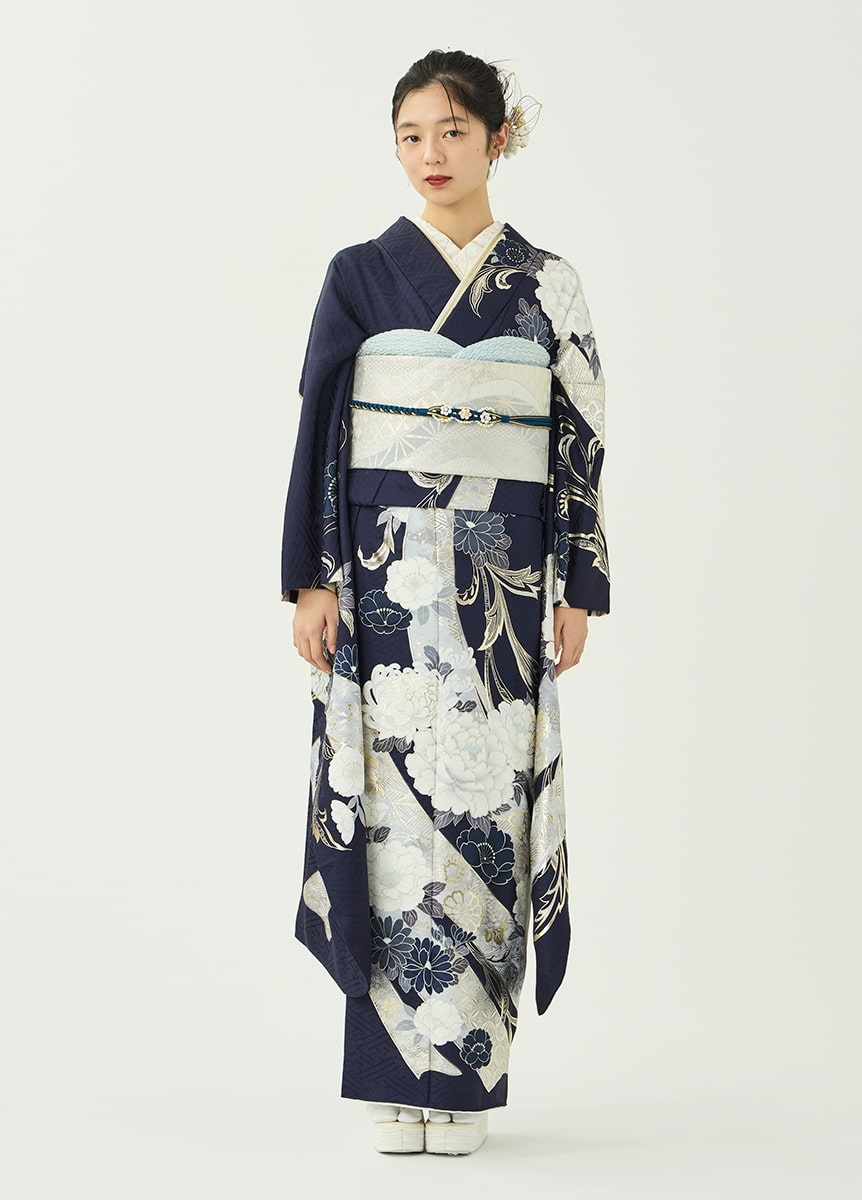 白い熨斗と牡丹に、プラチナ箔の品ある輝きを添えました。落ち着きのある紺の地色が柄の白を際立たせ、凛とした美しさを演出します。スタイリングはシルバーの帯に同系色の小物を合わせ、統一感のある装いに仕上げました。