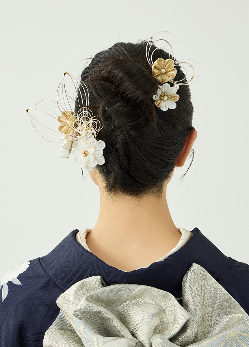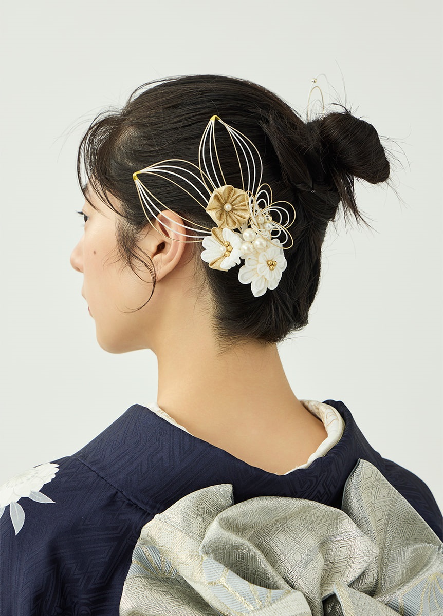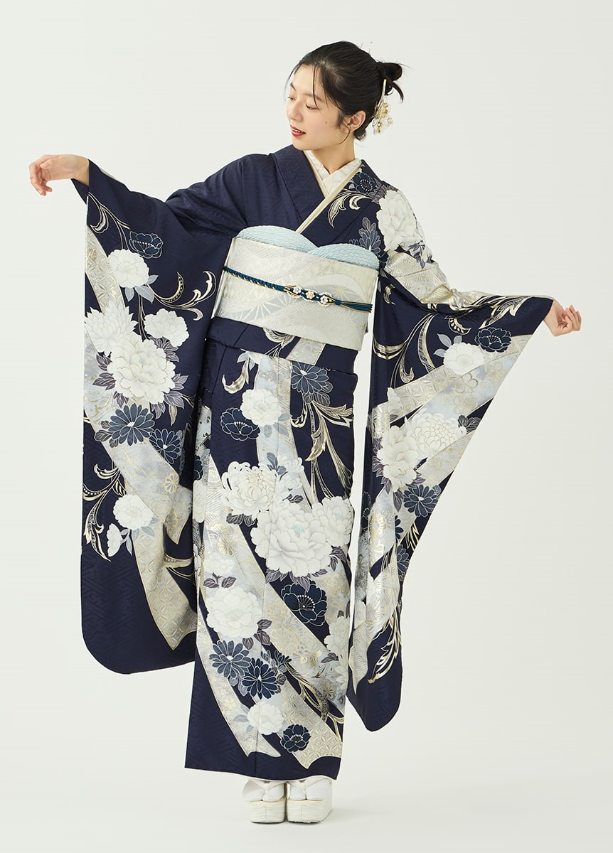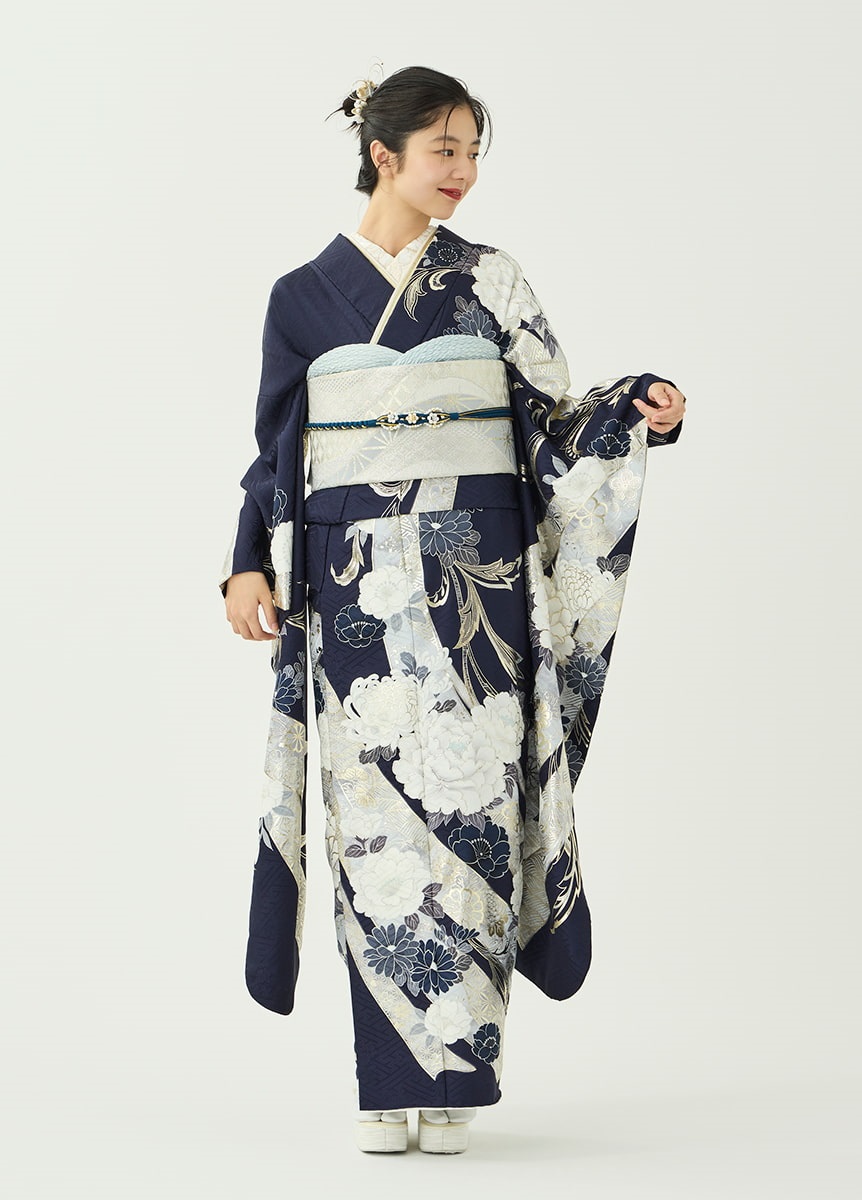 白い熨斗と牡丹に、プラチナ箔の品ある輝きを添えました。落ち着きのある紺の地色が柄の白を際立たせ、凛とした美しさを演出します。スタイリングはシルバーの帯に同系色の小物を合わせ、統一感のある装いに仕上げました。