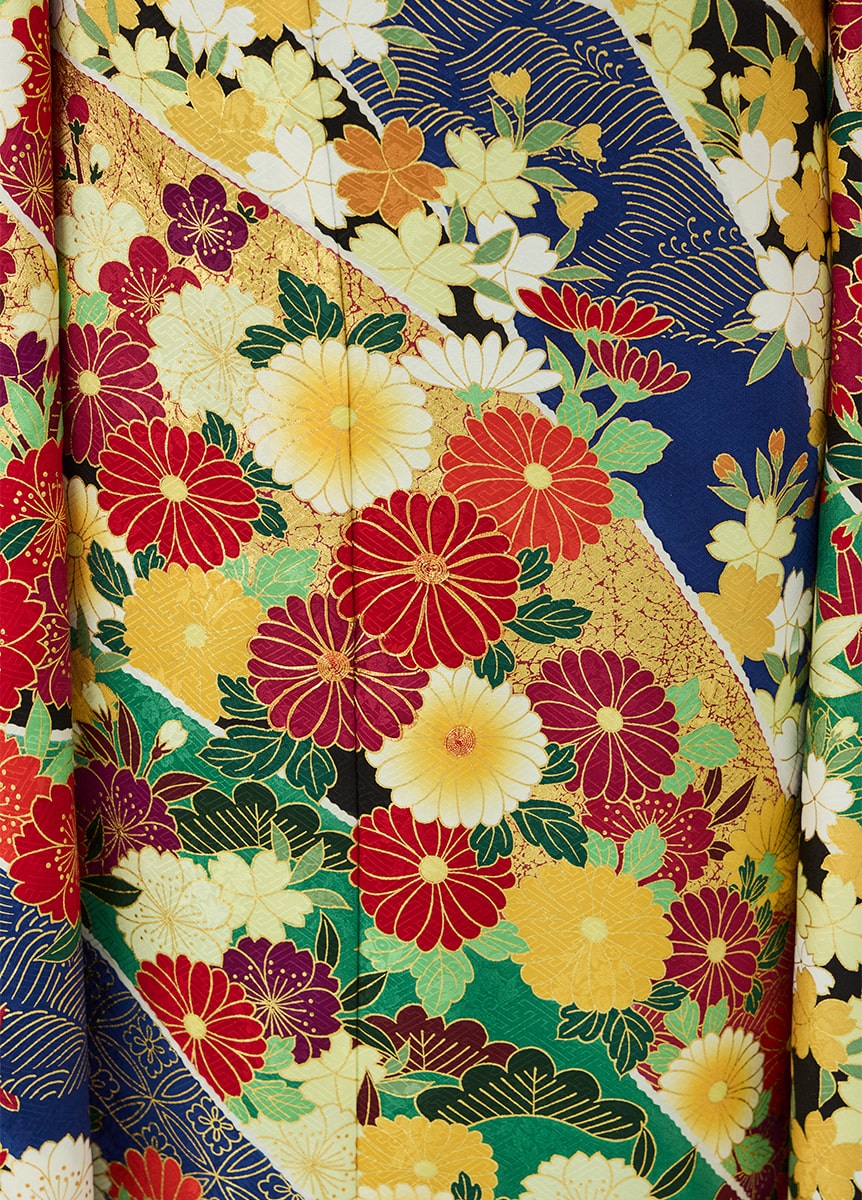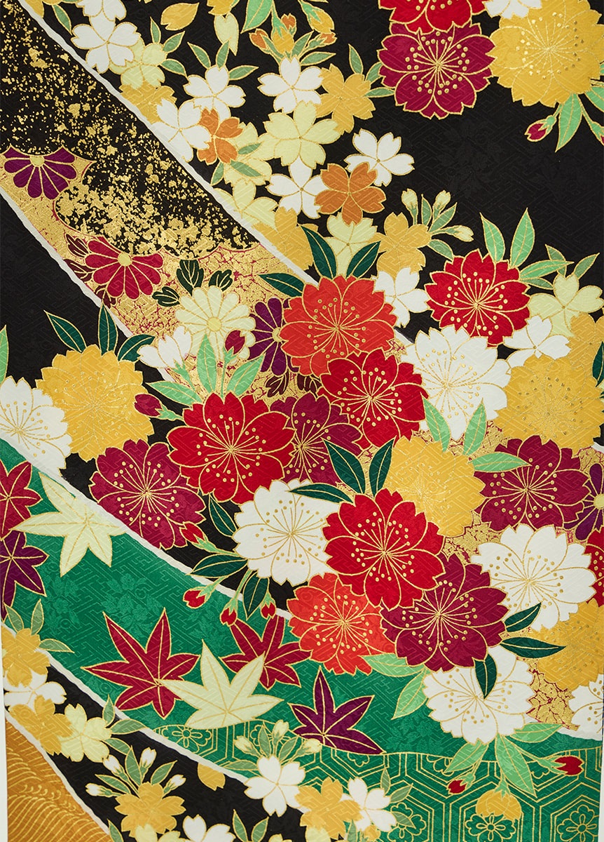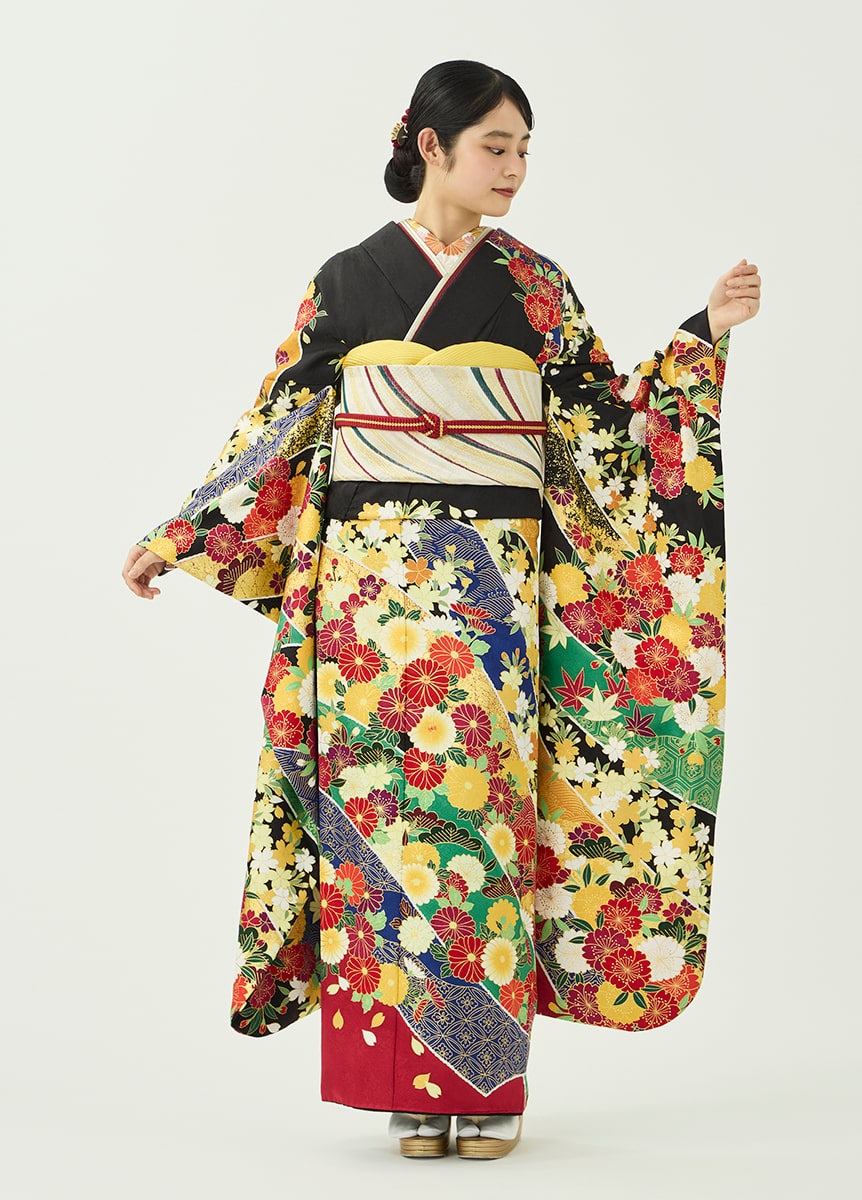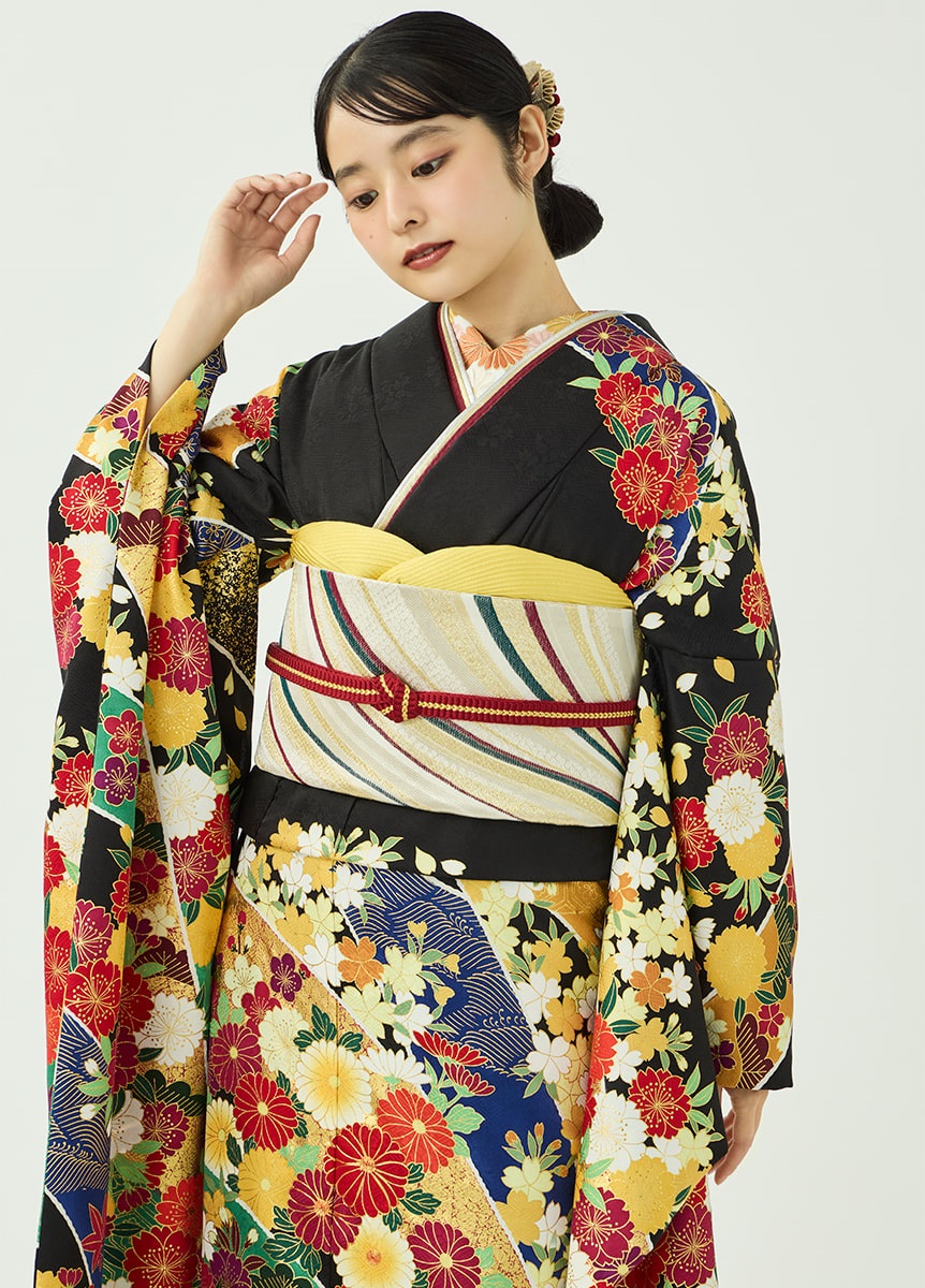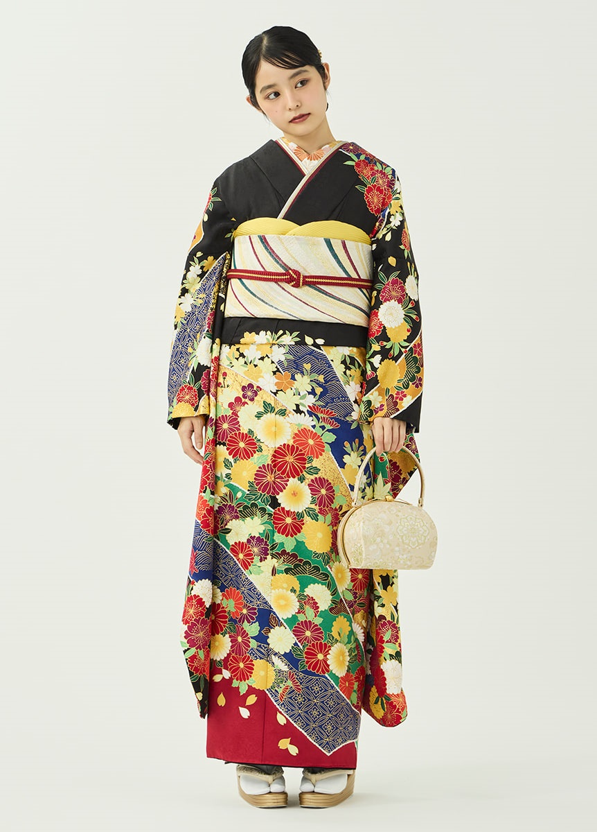格式高く絢爛豪華な振袖です。菊・松・梅・橘などの吉祥文様を配しており、地色の黒が色とりどりの花を鮮やかに引き立てます。振袖に合わせ、帯は控えめに、小物は柄の色を拾って統一感を出しました。