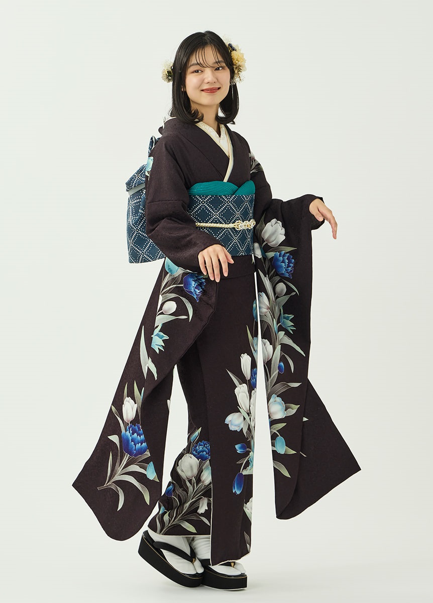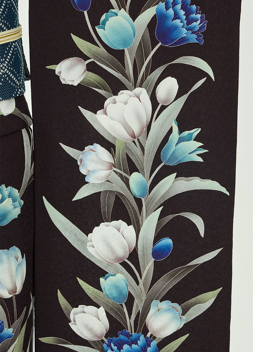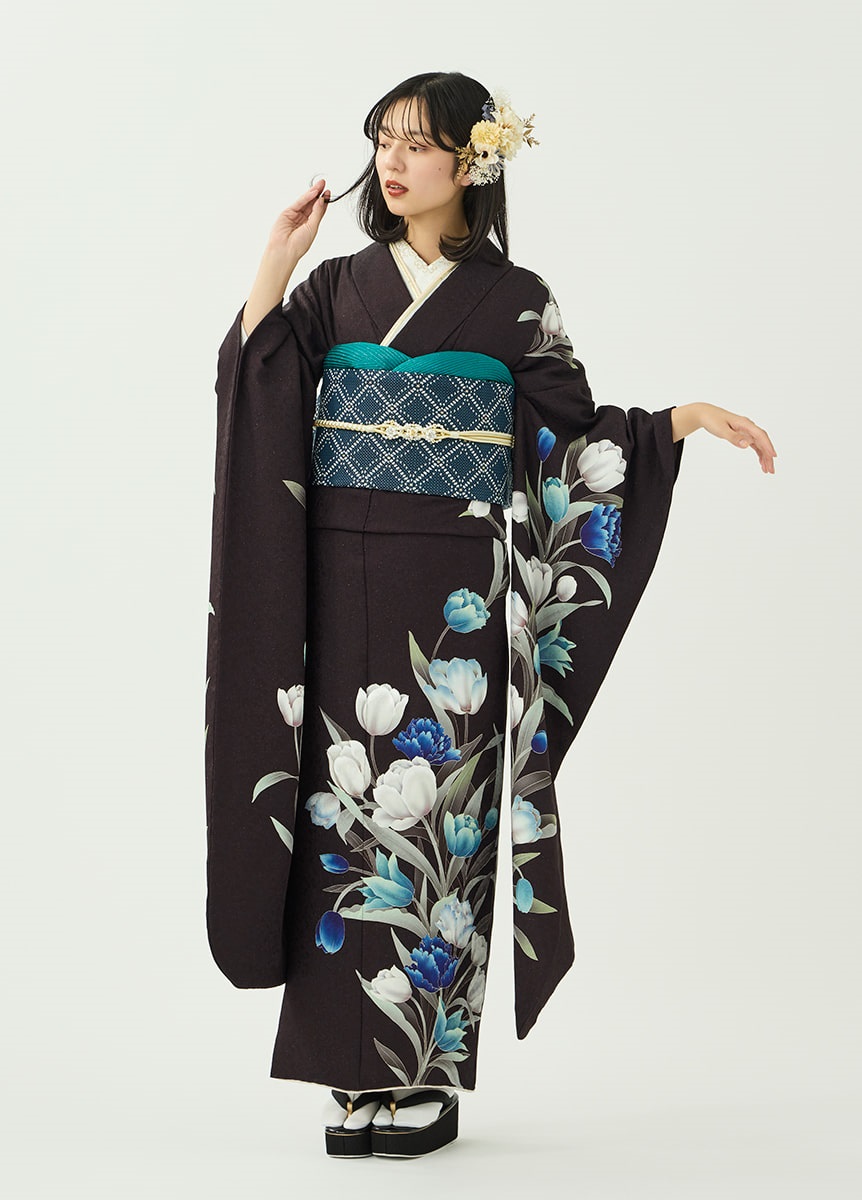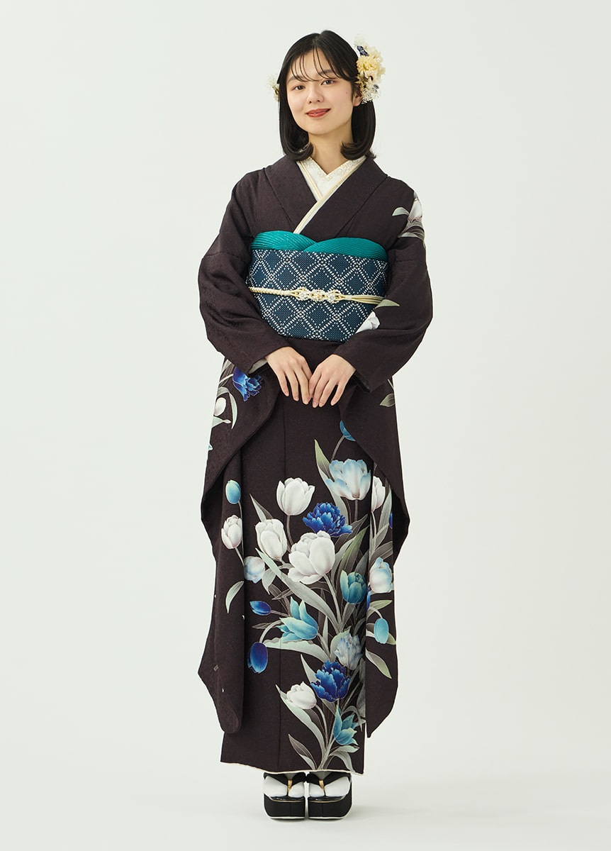 洗練された印象の振袖です。咲き誇るチューリップが柔らかに揺れるように描かれ、可憐な表情を添えています。ビターブラウンの地色は花々を引き立てつつ、銀通しの生地で重さを感じさせない仕上がりに。帯と帯揚にはチューリップの色を取り入れ、統一感をもたせました。