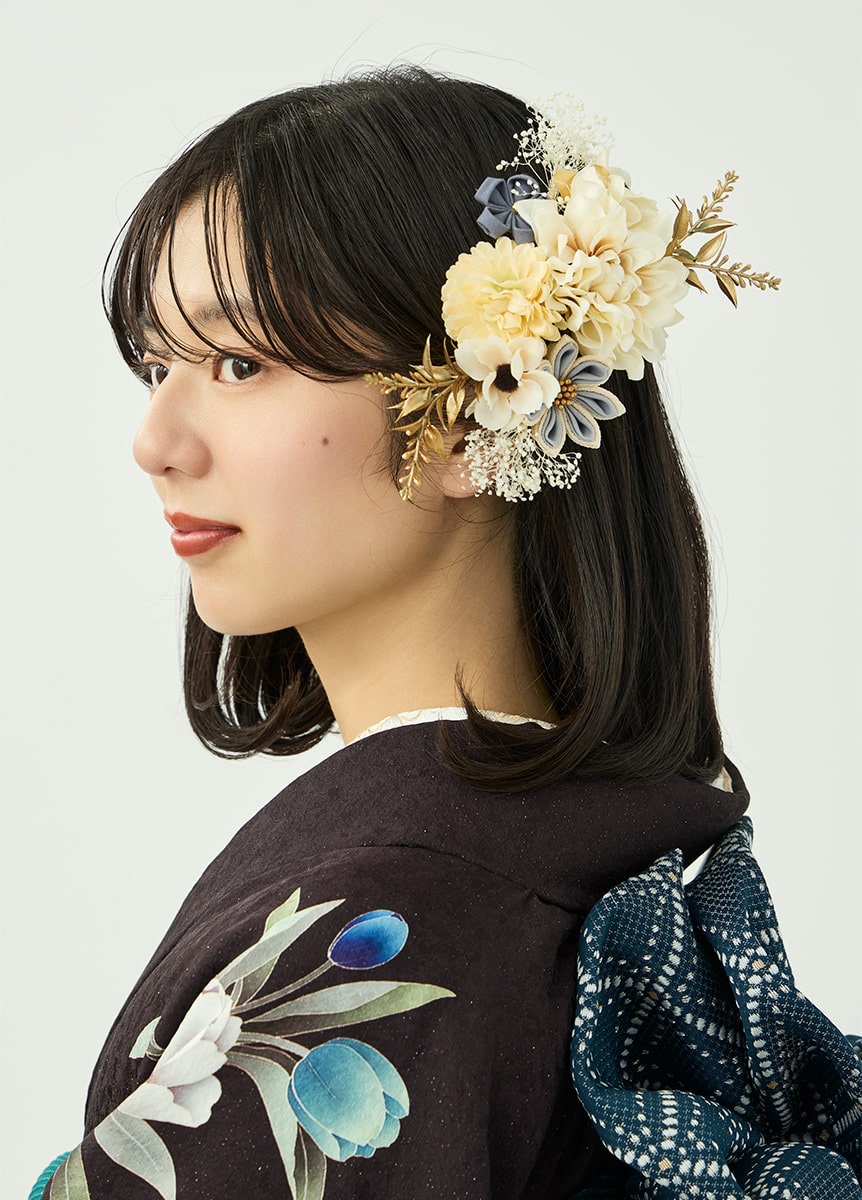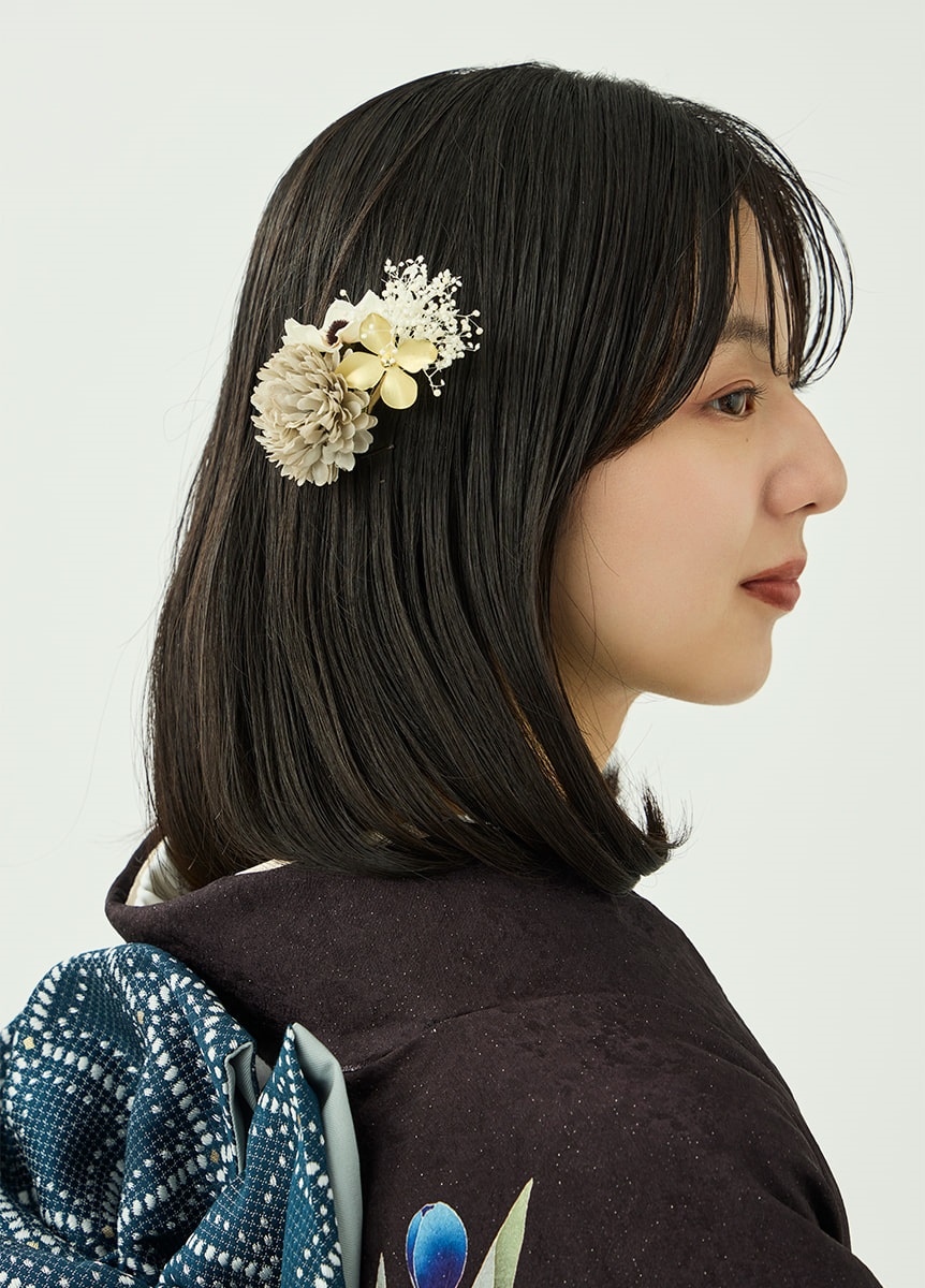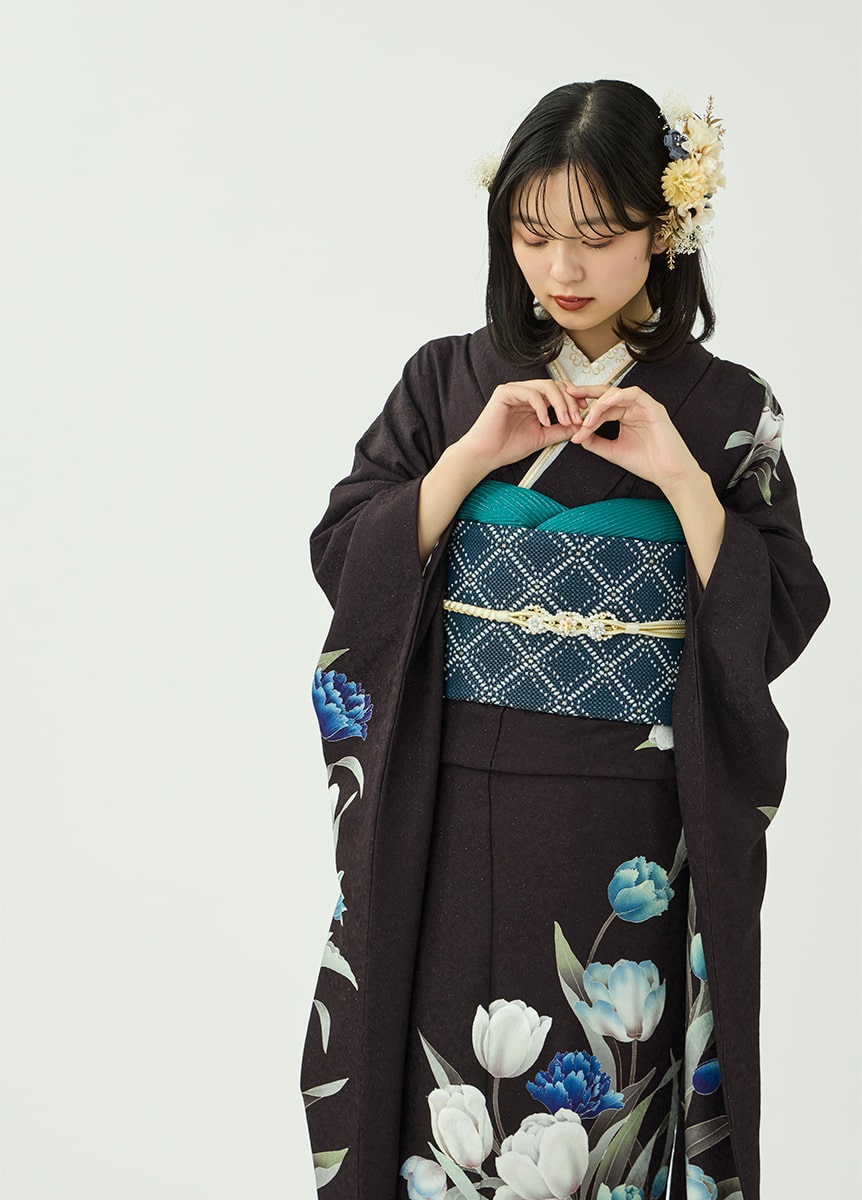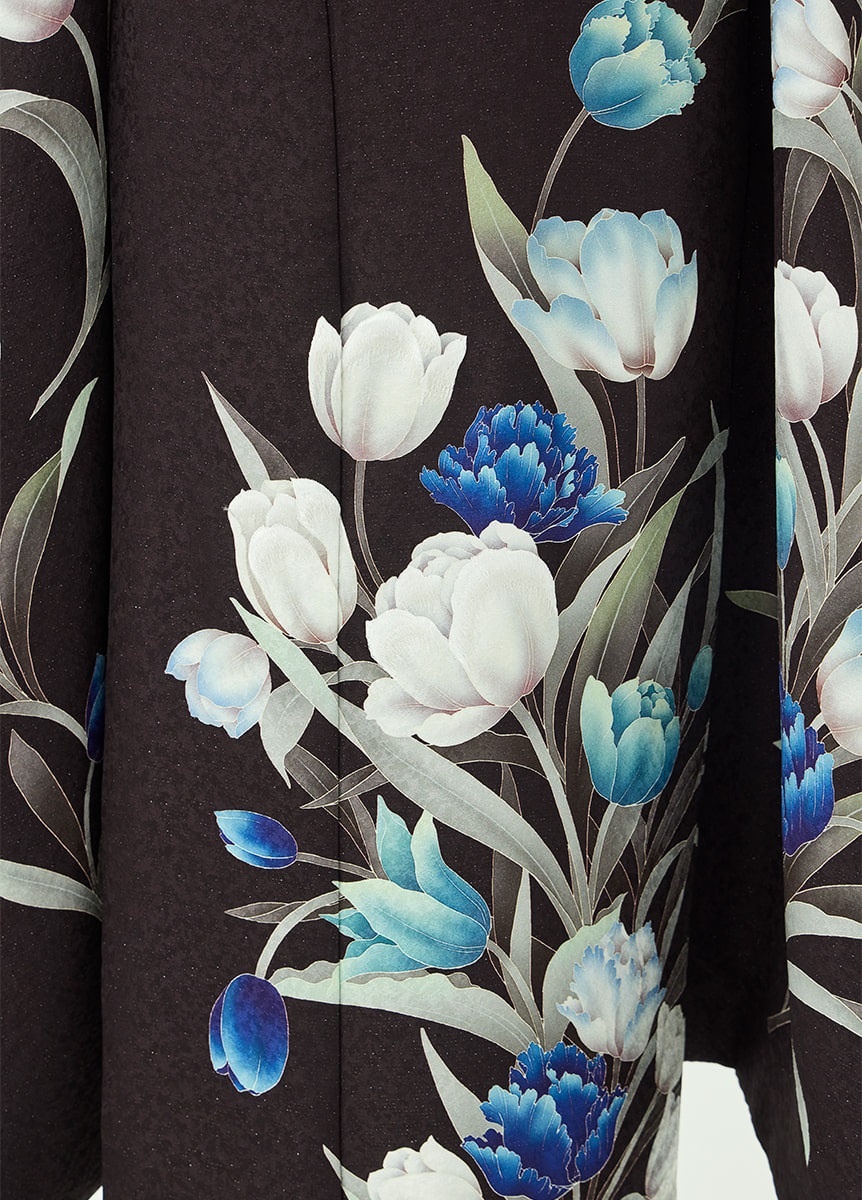洗練された印象の振袖です。咲き誇るチューリップが柔らかに揺れるように描かれ、可憐な表情を添えています。ビターブラウンの地色は花々を引き立てつつ、銀通しの生地で重さを感じさせない仕上がりに。帯と帯揚にはチューリップの色を取り入れ、統一感をもたせました。