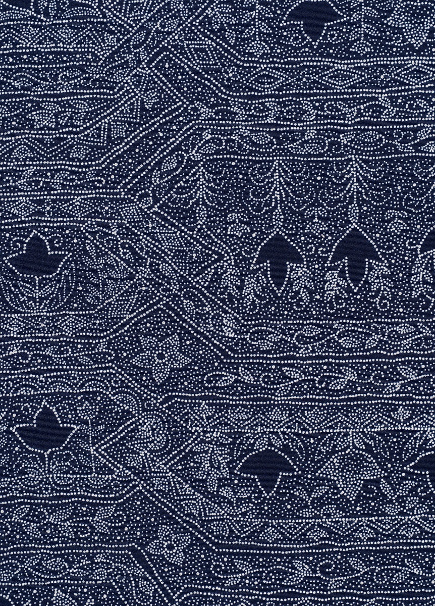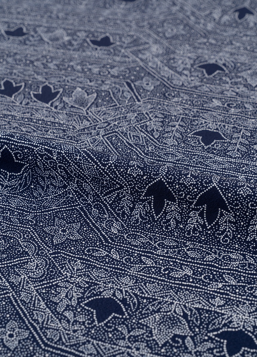 生地は丹後ちりめん。シワになりにくく、しなやかな風合いに優れている上、シボ(凹凸)の乱反射によって深みのある色を醸し出します。濃紺に異国情緒あふれる更紗模様が美しく浮かび上がる一枚。