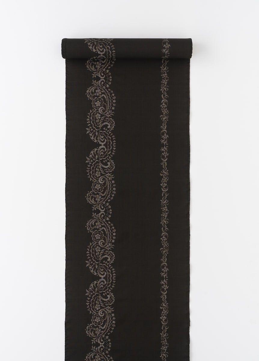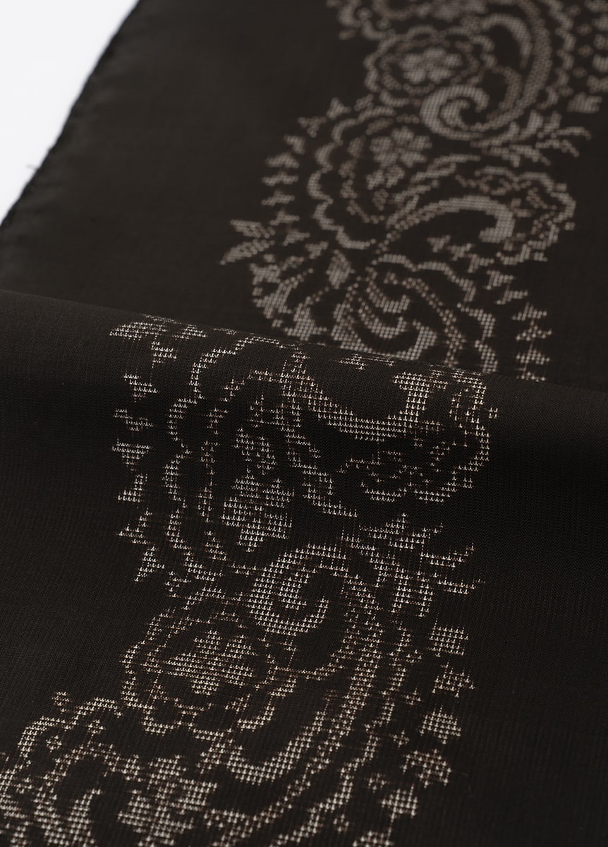 複雑に絡み合った更紗柄を縦に連ねて表現し、エキゾチックな印象で着飾る一枚です。柄の陰影や点表現など多彩な絣技法を駆使して織り出しています。泥染の濃淡で見せる洒落感のあるデザインです。