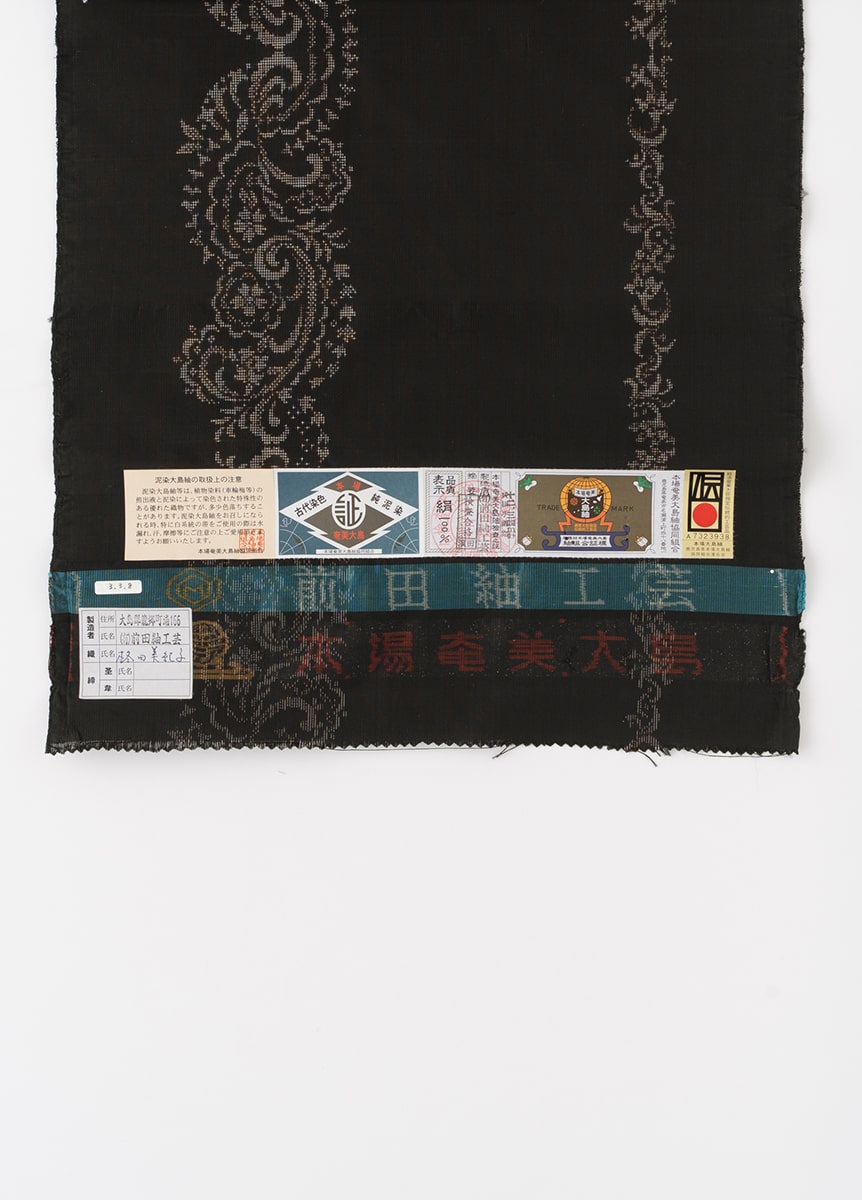 大島紬を代表する泥染めは、糸の束をテーチ木染めと泥染めで繰り返し染色することで、白の糸を茶色から黒へと染め上げる工程ですが、延べ70~100回程度の染色を繰り返してやっと漆黒が完成します。糸精製、染め、織すべてに手間暇のかかった大島紬は、カジュアルな着物ですが、最高峰の技術が詰まった逸品と言えます。裏地のない単衣仕立てです。裏地のついた袷仕立てや居敷当ての追加をご希望される場合はご相談ください。