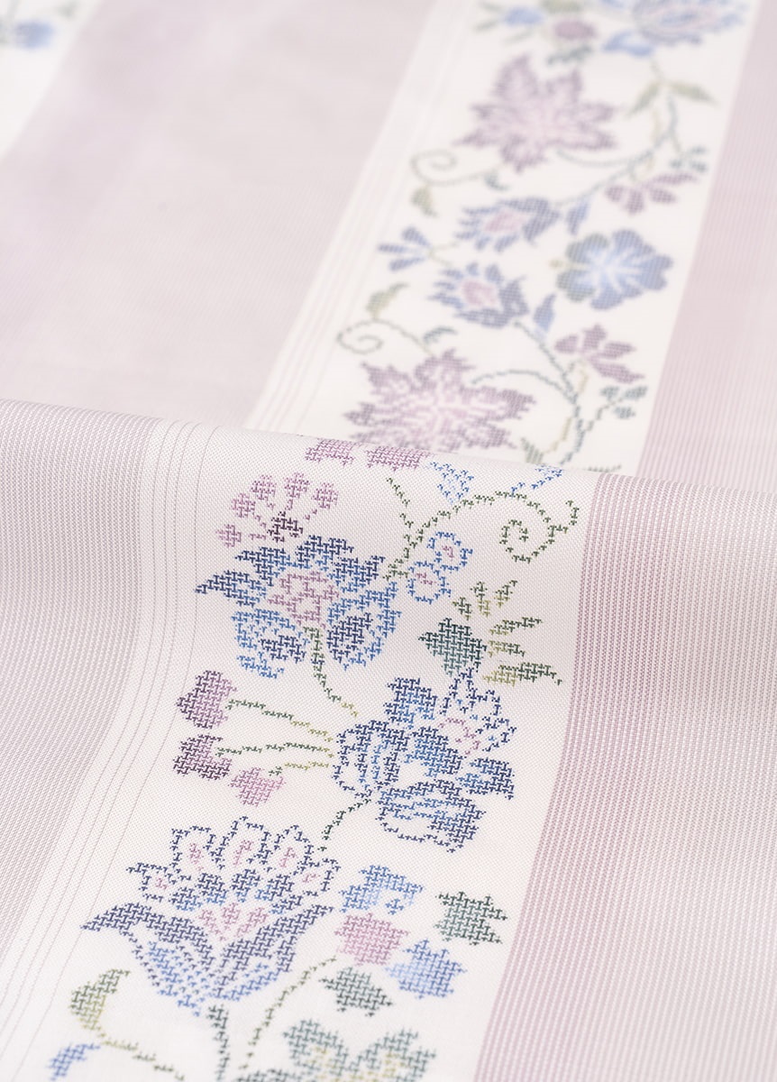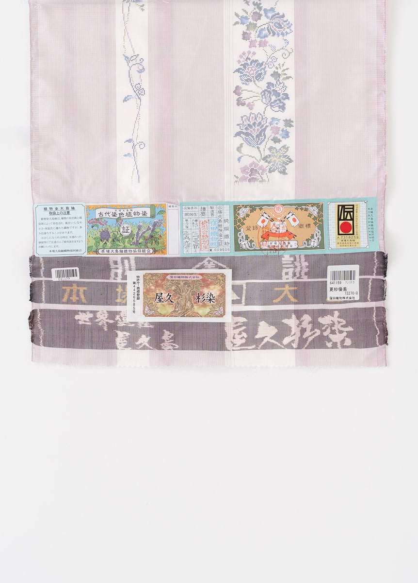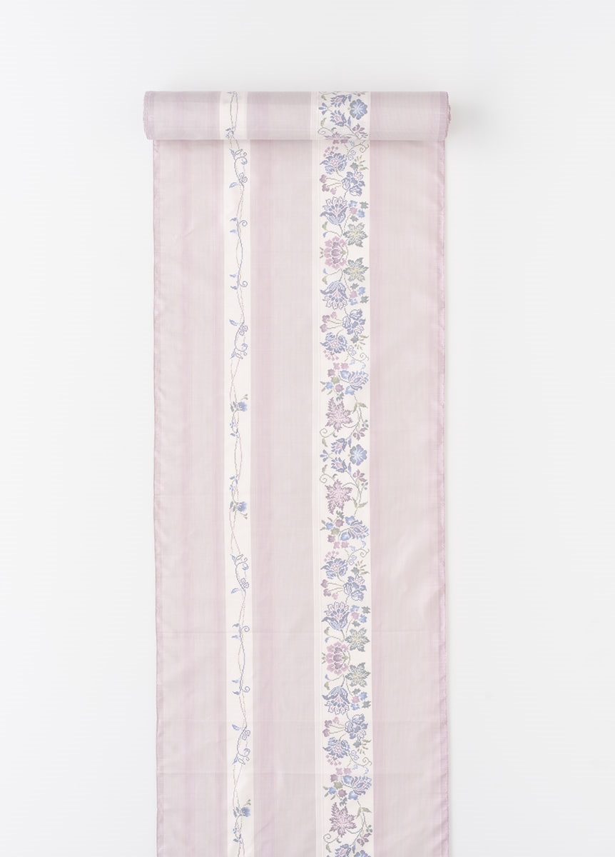 紫、青、緑を基調とした色彩豊かな更紗模様を、縦に配したデザイン。淡い紫色の繊細な縞を背景に、絣柄が際立ち華やかな着姿を演出します。多彩な刷り込み技法によって織り出された一枚です。