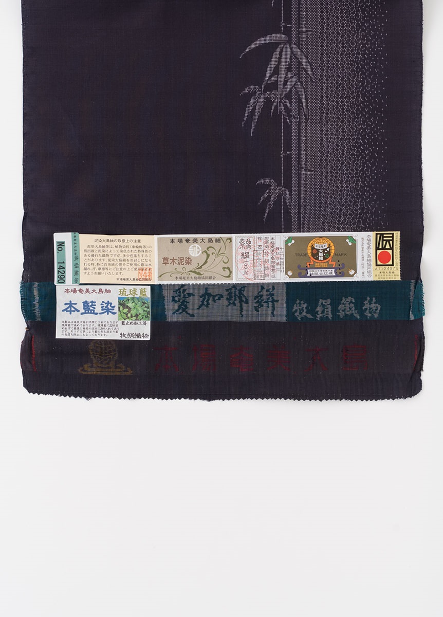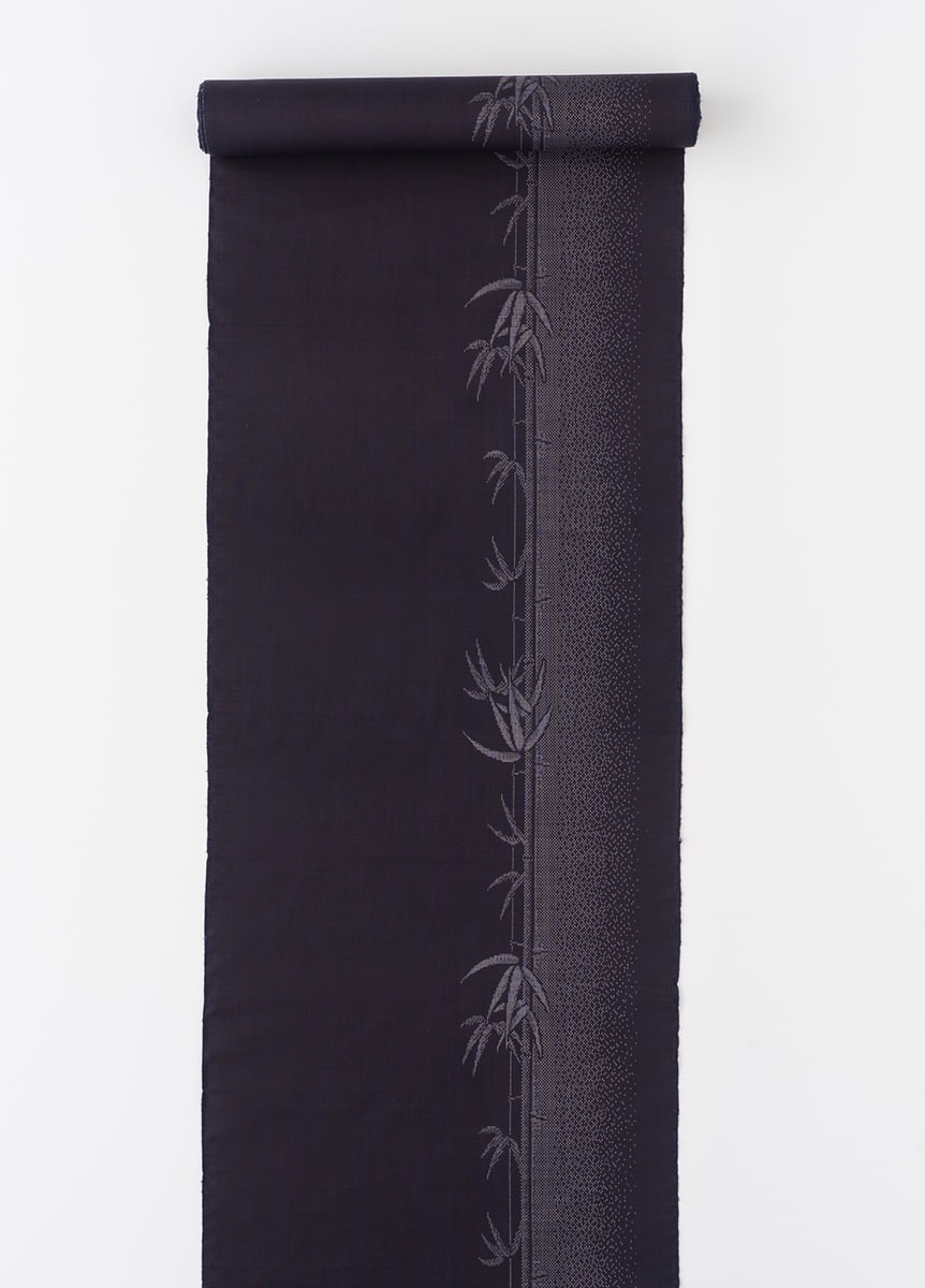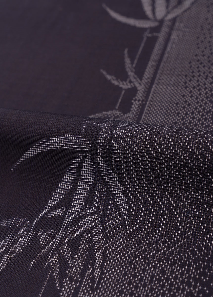 縦にすっと伸びた竹が清々しく、凛とした着姿を演出するデザイン。地色は深みのある青が美しい泥正藍で表現しました。直線的なラインや、柄の陰影表現など、多彩な絣表現で織り出した一枚です。