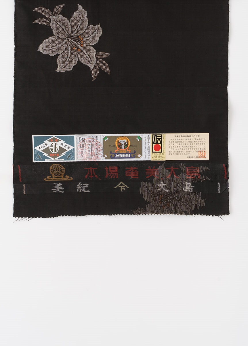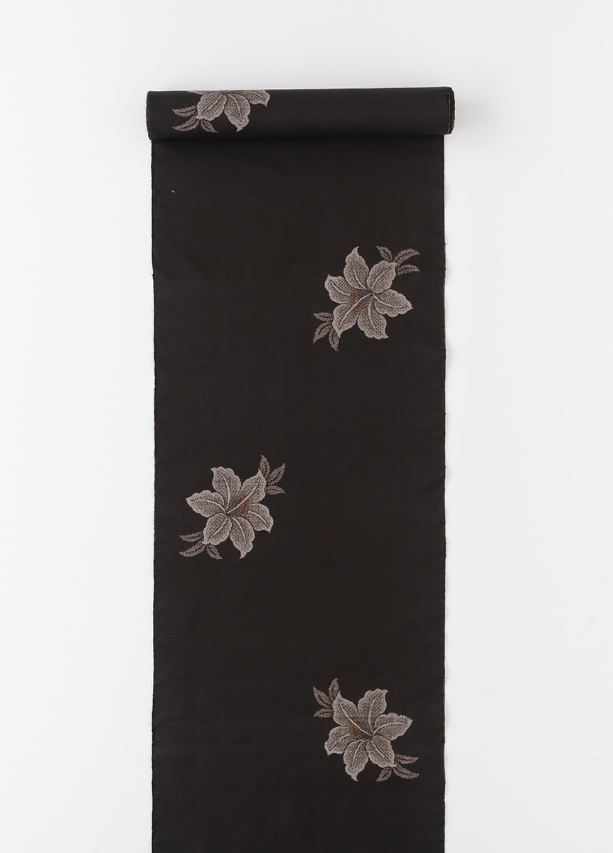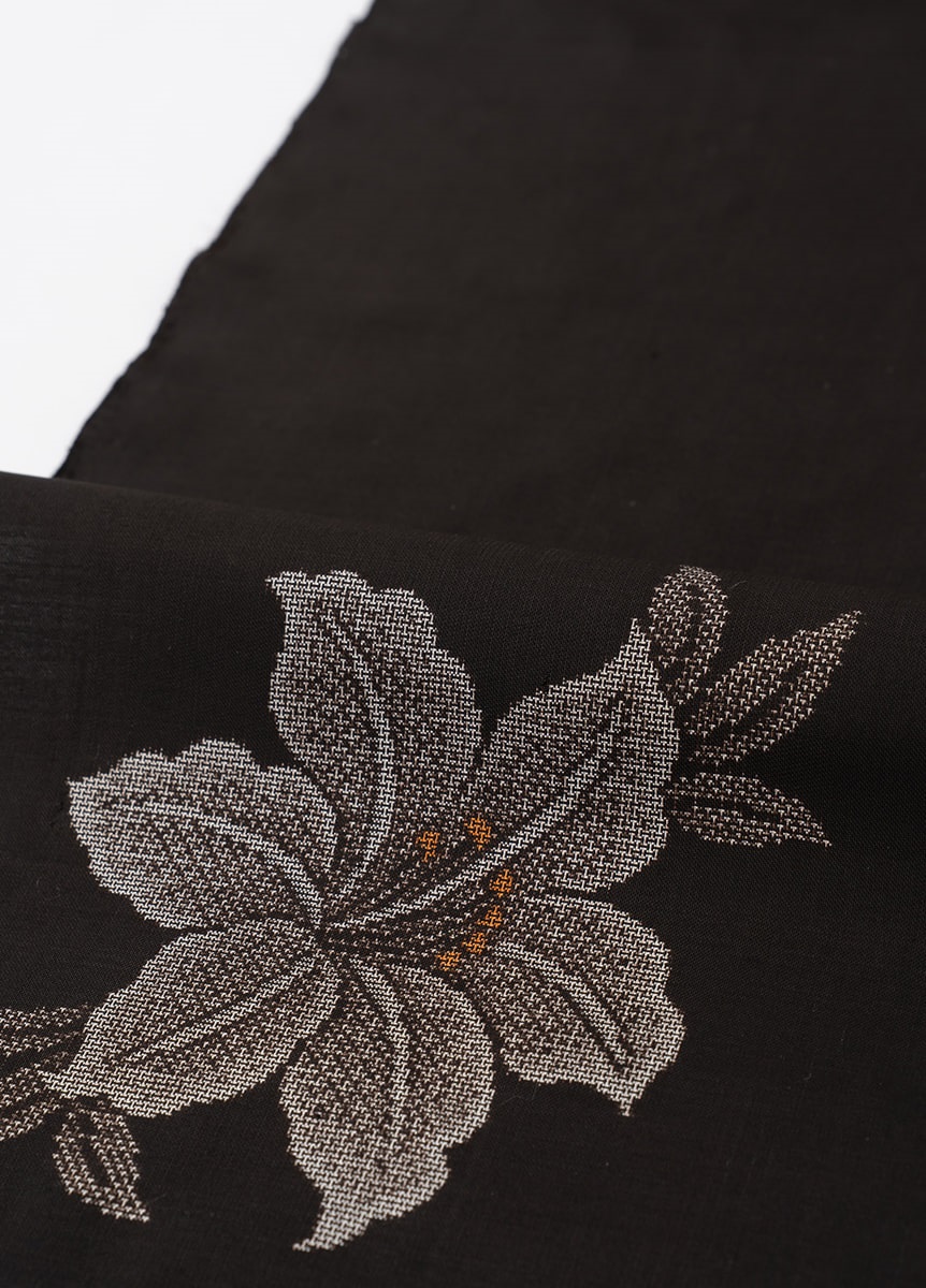 デザインは、美しい泥染の黒を背景に、奄美大島に生息するウケユリの花をデザインした一枚。花びらは表情のある変化締めを用いて織り出しました。鮮やかな黄色を挿した花のめしべが着姿のポイントになります。