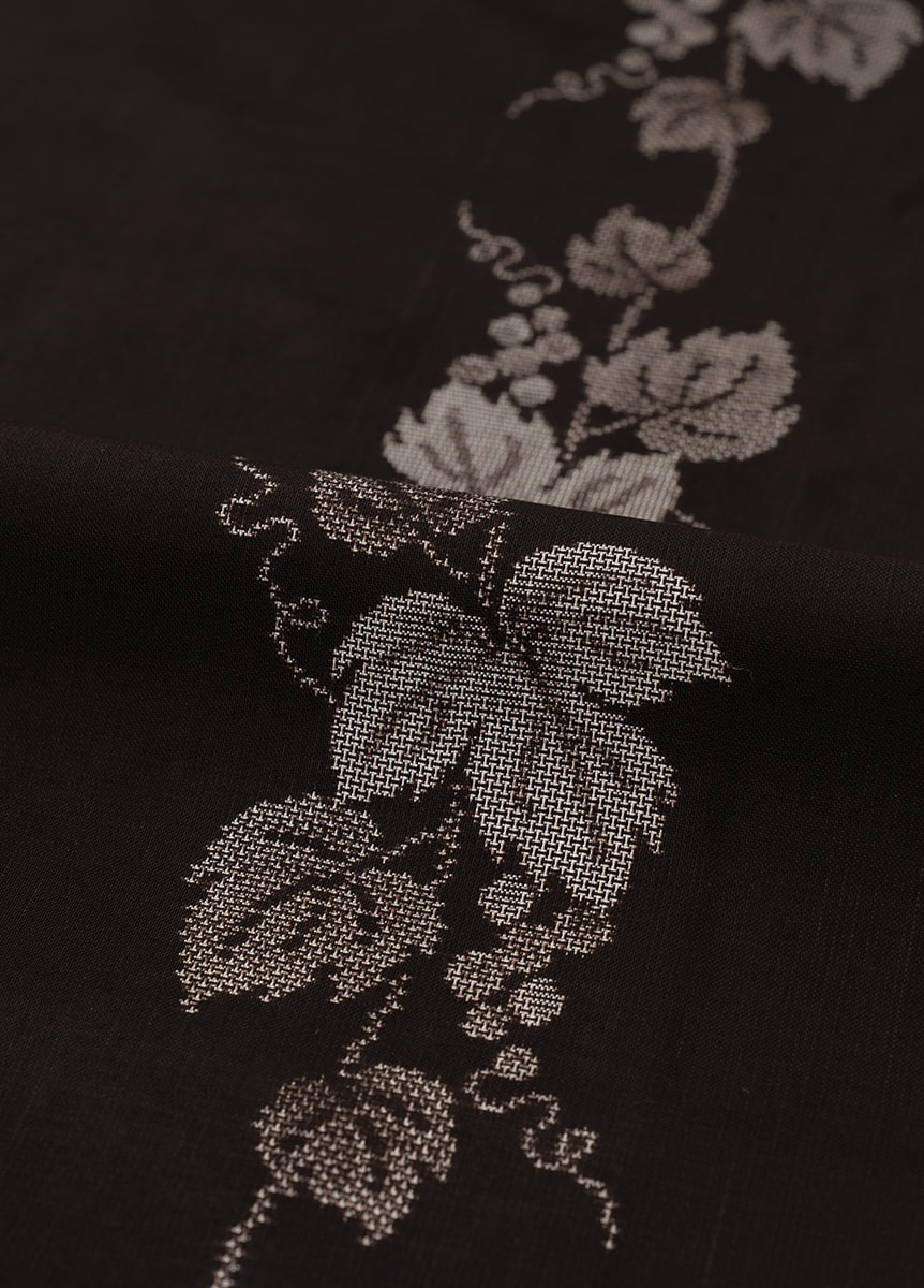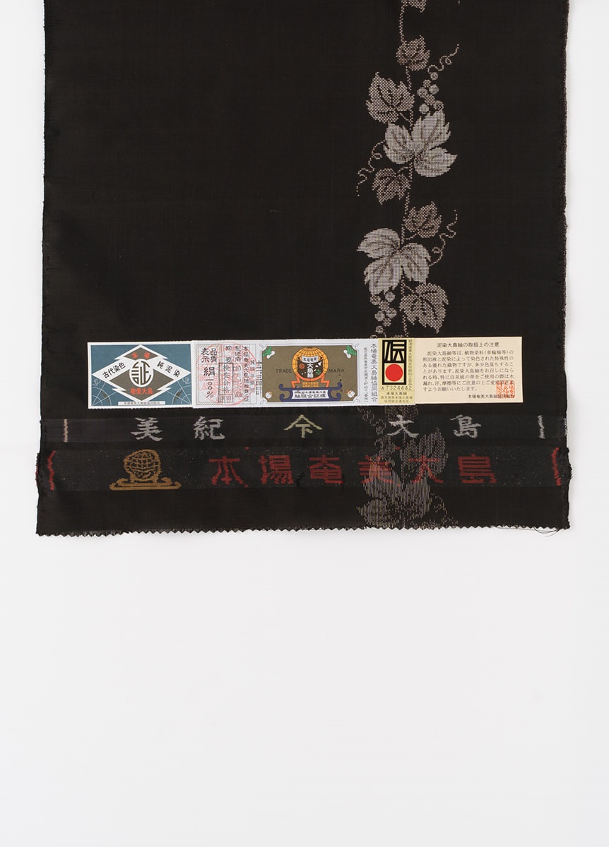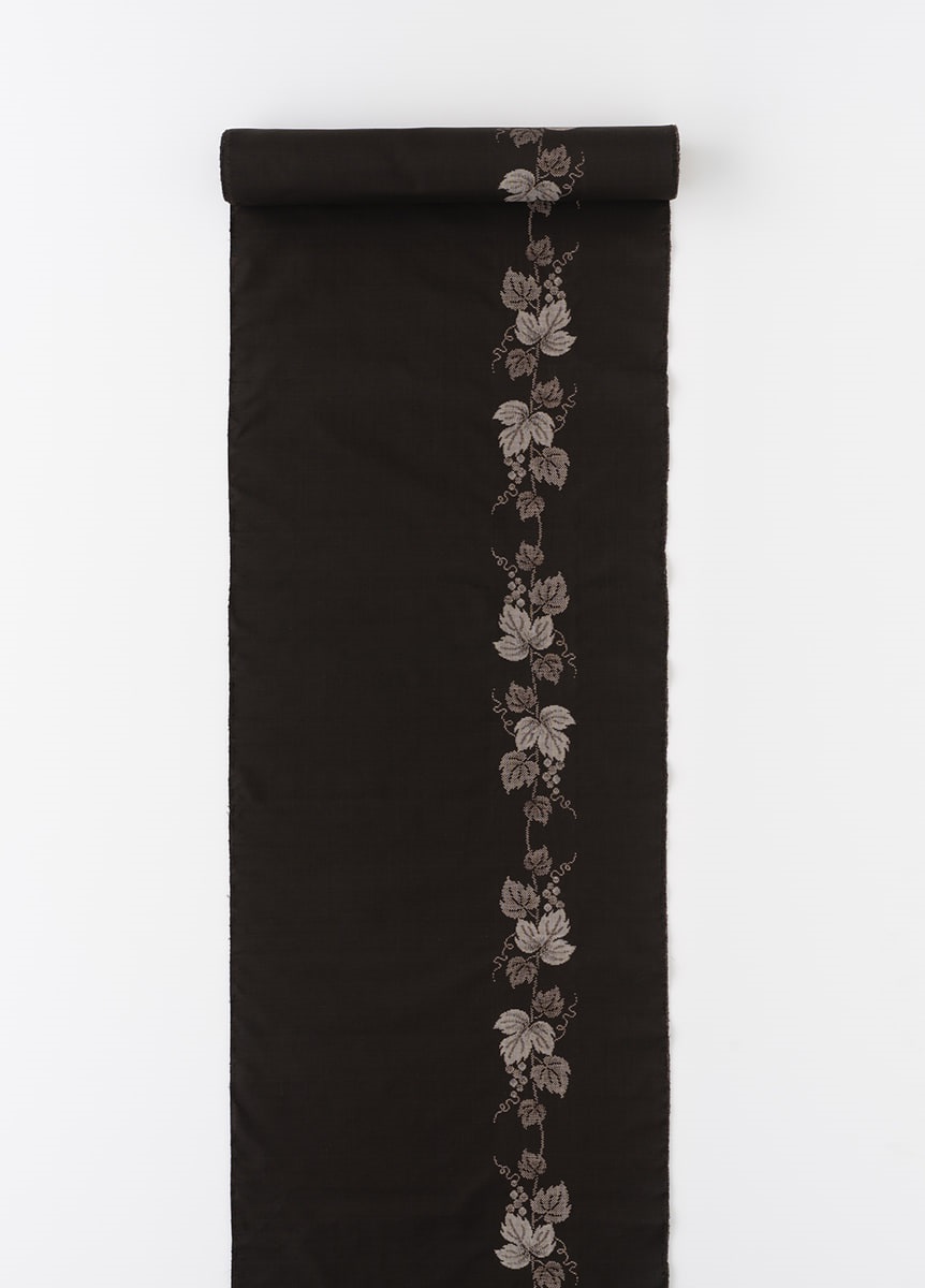 デザインは、葡萄唐草を道引柄で織り出したデザイン。泥染めの濃淡で、葉っぱの遠近感や実の立体感を表現しました。美しい泥染の黒と流れる様に配した柄行きで、すっきりと上品な着姿を演出します。