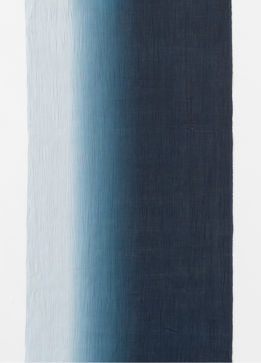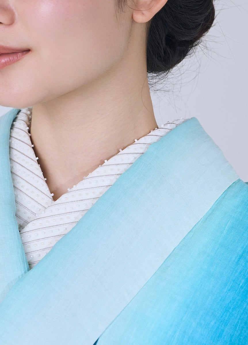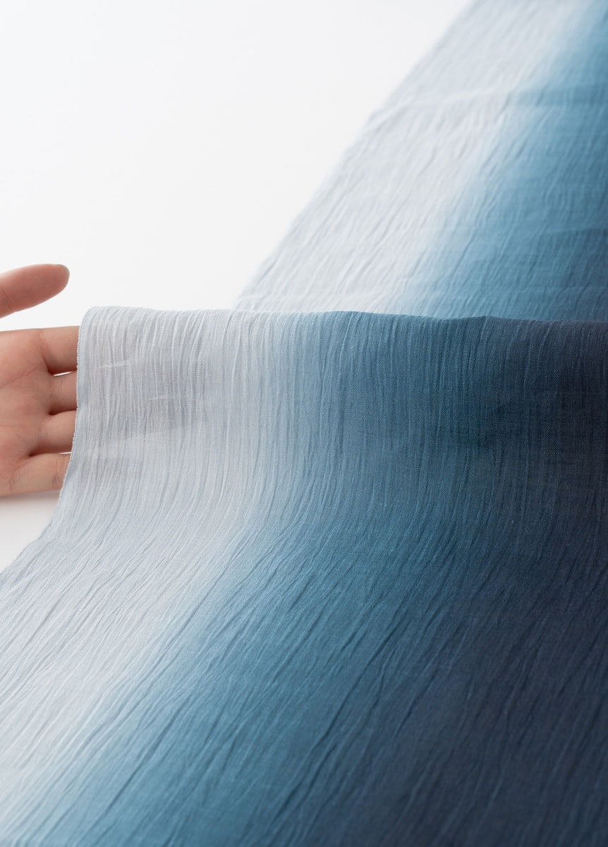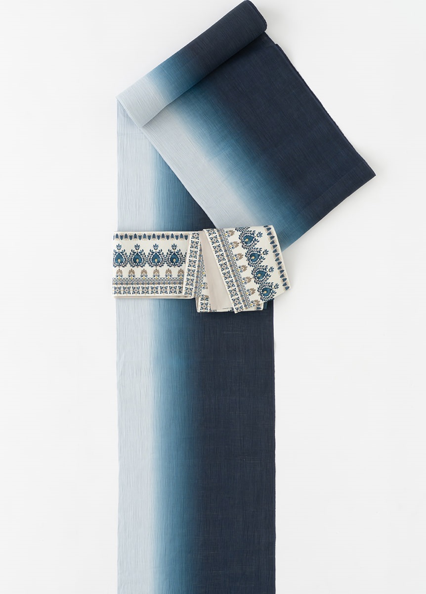 白で織りあげた近江縮に、いつか見た海の記憶を重ねるように、美しいグラデーションの染めを施しました。さらりとした近江縮の風合いに、静かな夜の海を思わせる色が重なり、涼やかな奥行きを生み出しています。たてのぼかしが、夏の着姿をすっきりと、清々しく見せます。