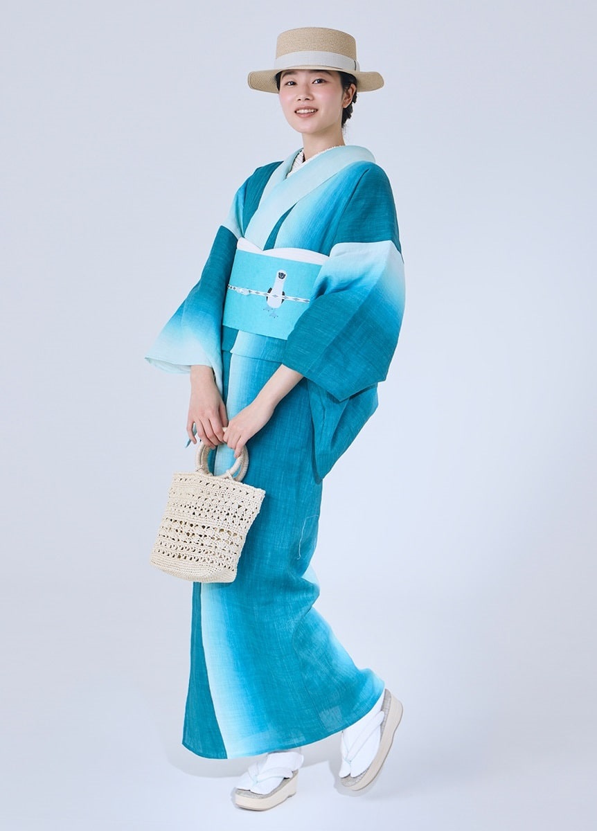 Product informationモデル着用「近江縮 ぼかし 碧のさざめき」