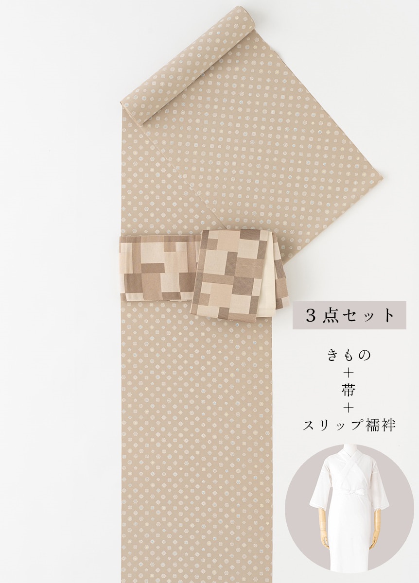 きものに憧れがあるのだけど、価格や着付け・お手入れの不安で踏み出せない方もいらっしゃいます。そんな不安を少しでも解決して、一人でも多くの方にきものを楽しんでいただきたく、「ご自宅で洗える、合繊きもの・木綿きもの」「帯結びもラクな、半幅帯・へこ帯」「着付けが簡単な、スリップじゅばん」のお得な3点セットをご用意しました。