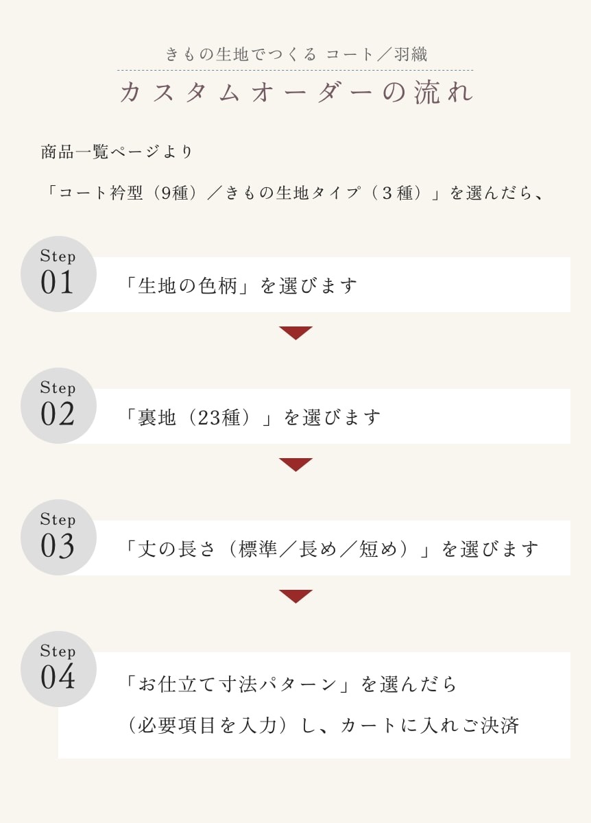 当店のお仕立て商品は、以下のパターンより国内縫製にて1点1点丁寧にお仕立ていたします。