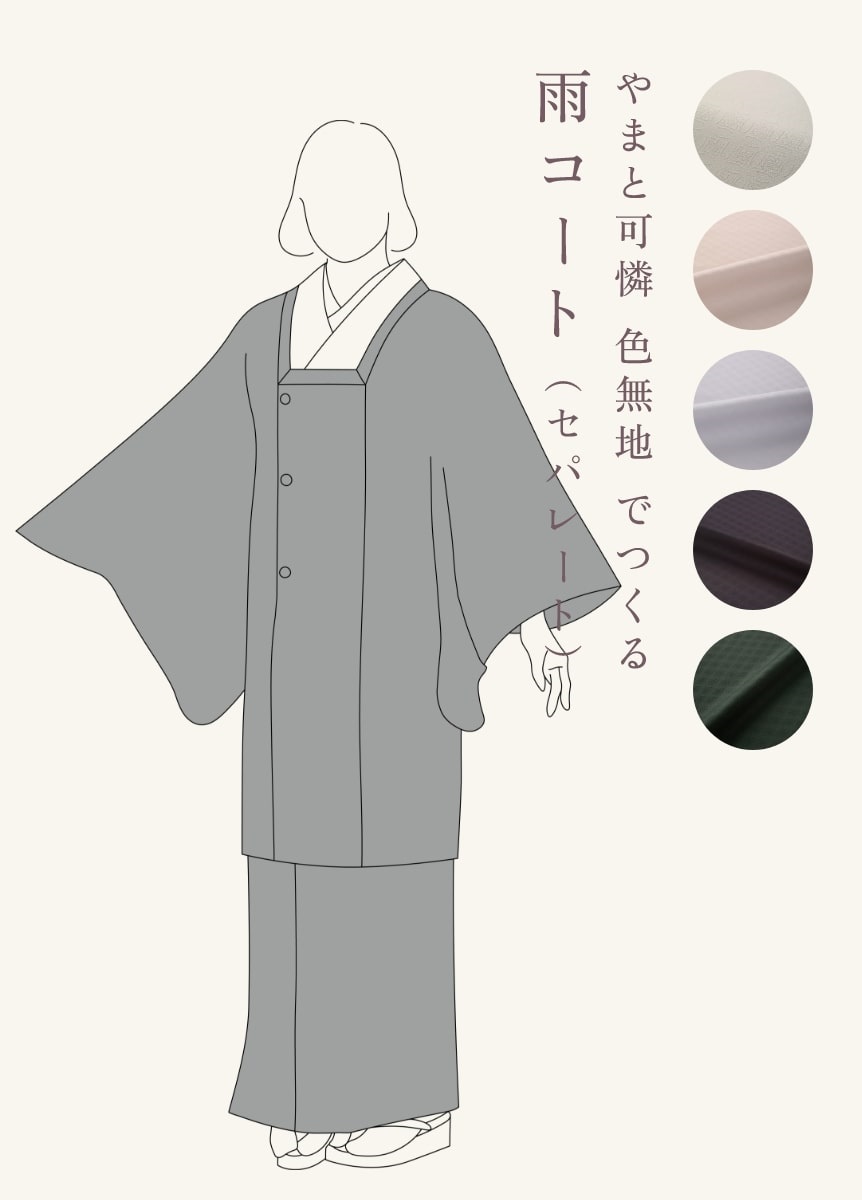 上下に分かれていて、長さの調整が可能な雨コートです。単衣仕立のため、年間を通してご着用いただけます。お天気が崩れそうな日に、道行衿コートとして上だけ着て、下を持ち歩くことで安心してお出かけいただけます。