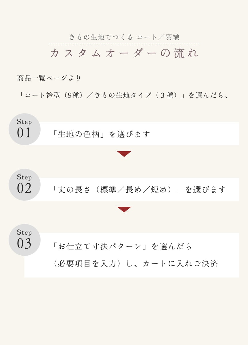 カート内「自由記入欄」に①身長 ②バスト ③ヒップ ④裄(首の付け根に当たる部分から、肩を通って袖口までの長さ)をご記入ください。
