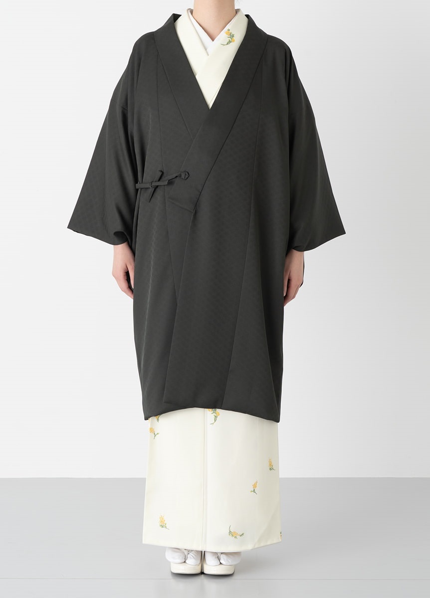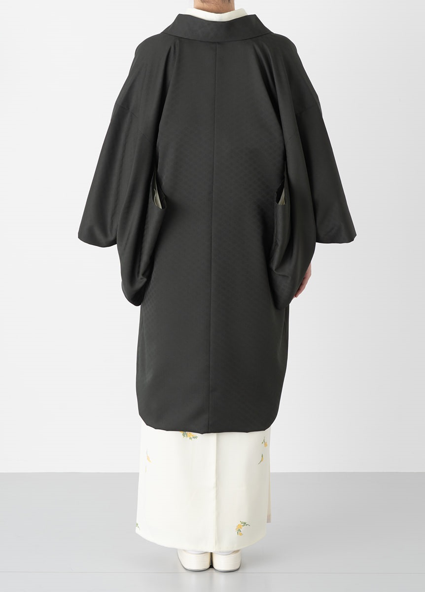 深みのある緑色は洒落感と上品さを両立した絶妙なカラー。 地紋には有職文様である七宝を織り上げました。シンプルな無地のためフォーマルな装いにも合わせやすいコートです。