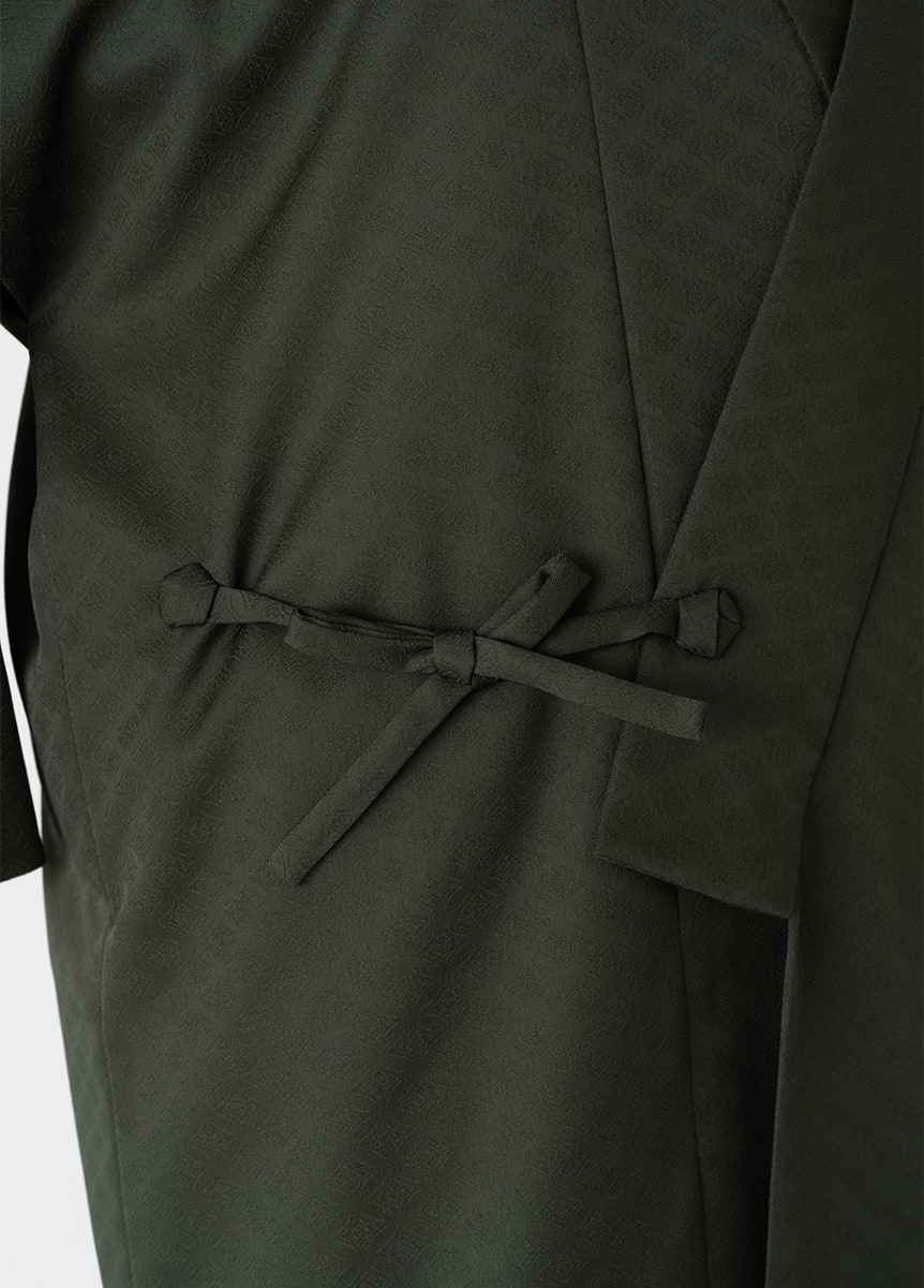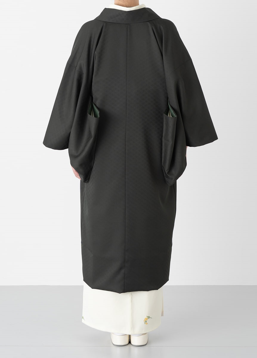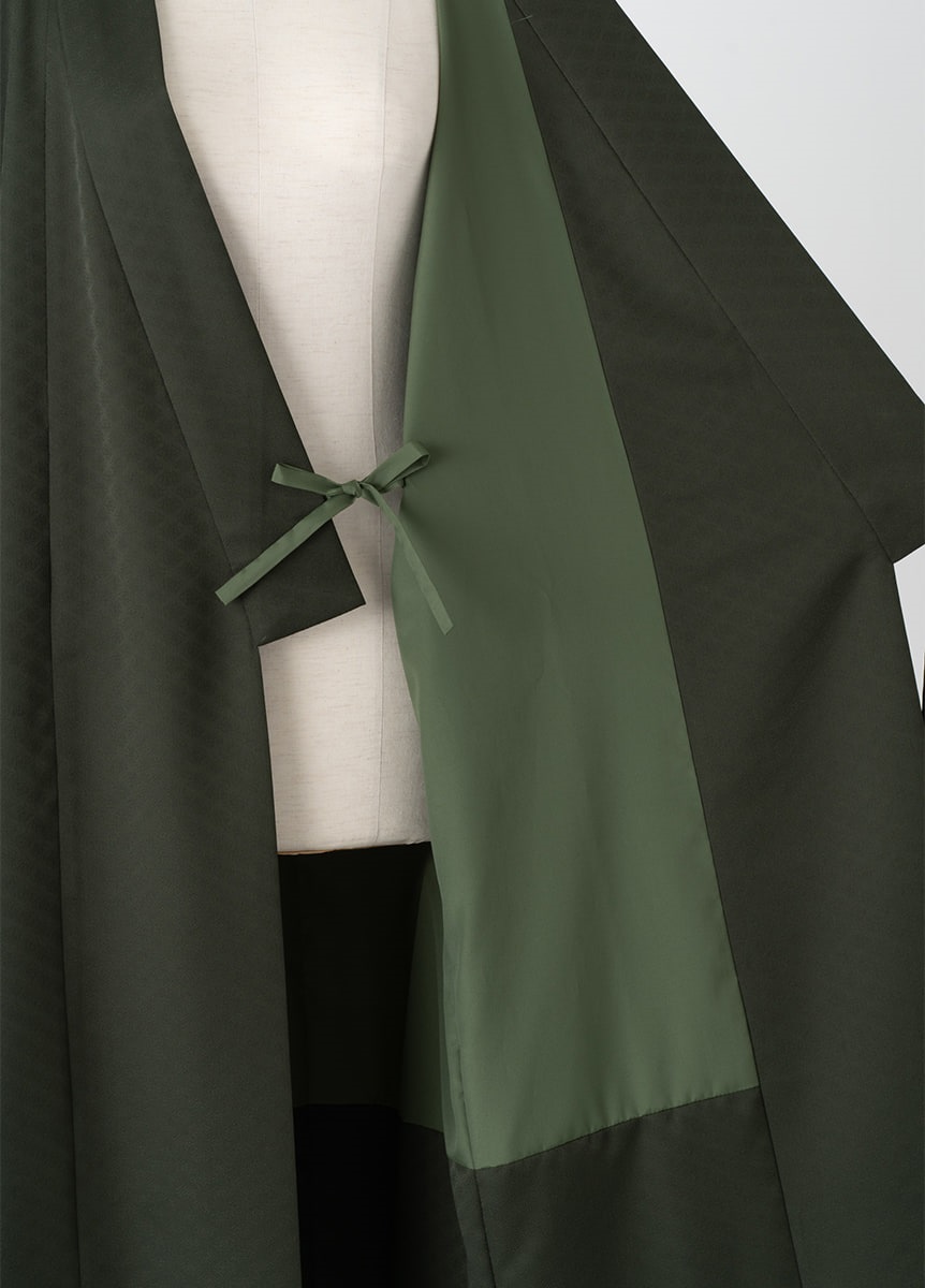深みのある緑色は洒落感と上品さを両立した絶妙なカラー。 地紋には有職文様である七宝を織り上げました。シンプルな無地のためフォーマルな装いにも合わせやすいコートです。