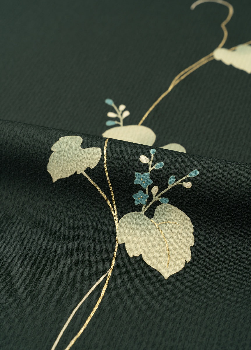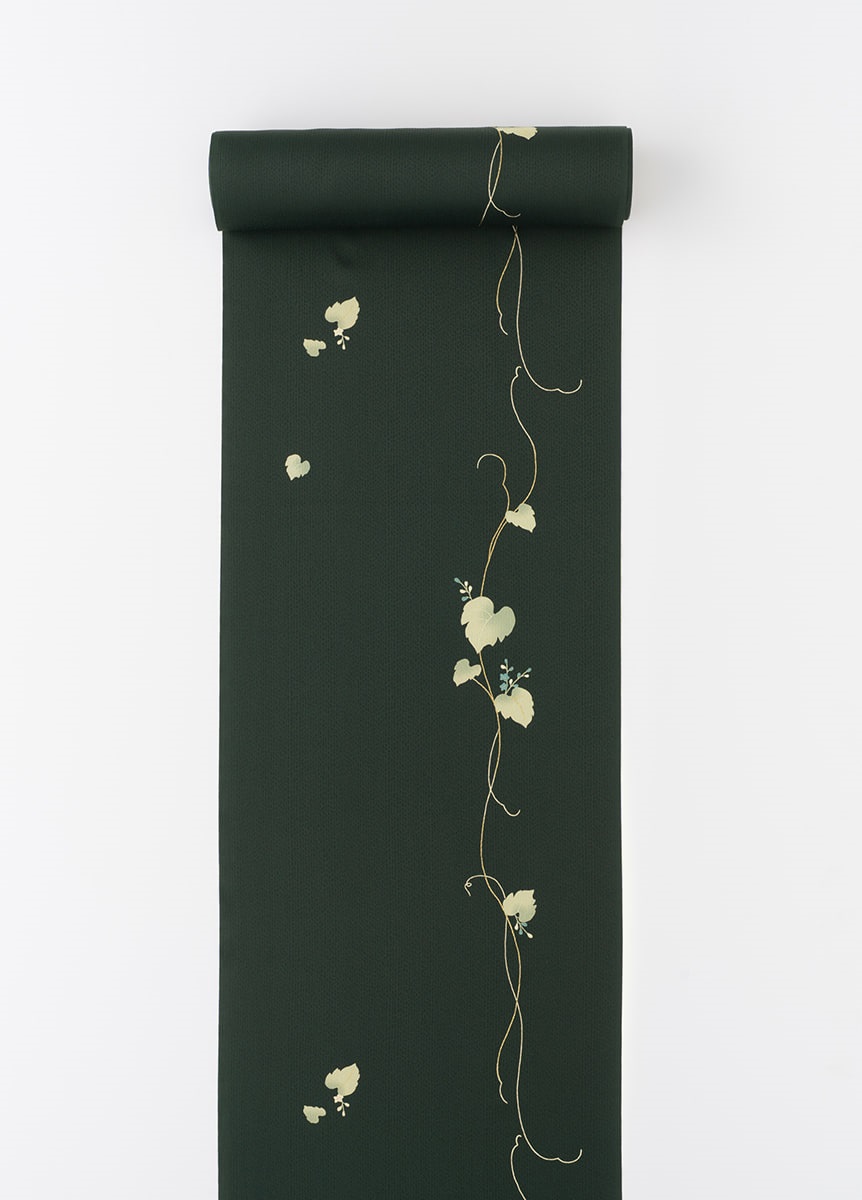 ゆらぎのある桐の葉が美しいデザインです。ラインを片側に寄せることで程よく無地部分が現れ、バランスの取れた着姿に。蔓部分には金彩・銀彩を絡ませるように施し、繊細な表情を出しました。深い緑色は秋のはじまりにぴったりのカラーに、金彩が明るさと華やかさを添えます。