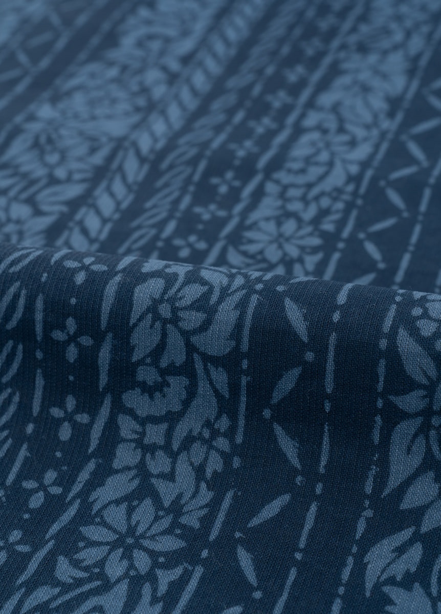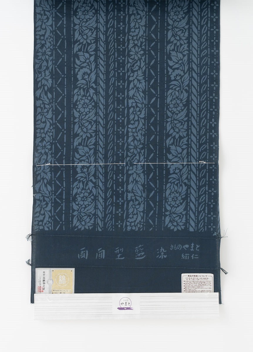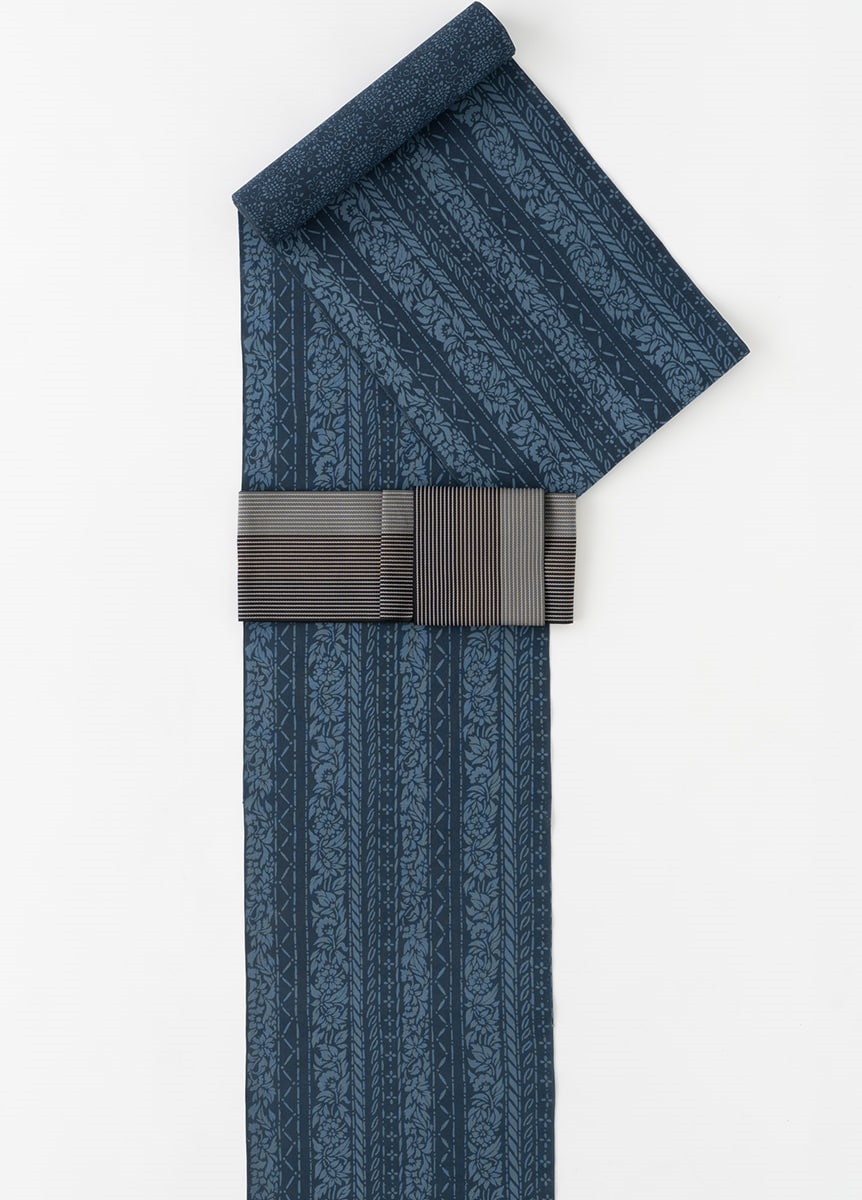 生地は260年以上の歴史を持つ紺仁工房で生まれ、太さの違う3種類の糸を独自の配列で織り上げた片貝木綿。「用の美」を背景に生まれ、「着心地の良さ」「しわになりにくく美しい着姿」「家で洗濯できる扱いやすさ」をかね備えた生地です。正絹に比べ、特別な日に限らず気軽に着ることができるので、気合を入れ過ぎず自然体でお召しいただけます。きちんと感を出すには名古屋帯、気軽に色々な結び方を楽しむには半幅帯がおすすめ。洋服が一般化した現在でも、特別な日常着として好印象を与えることができるでしょう。