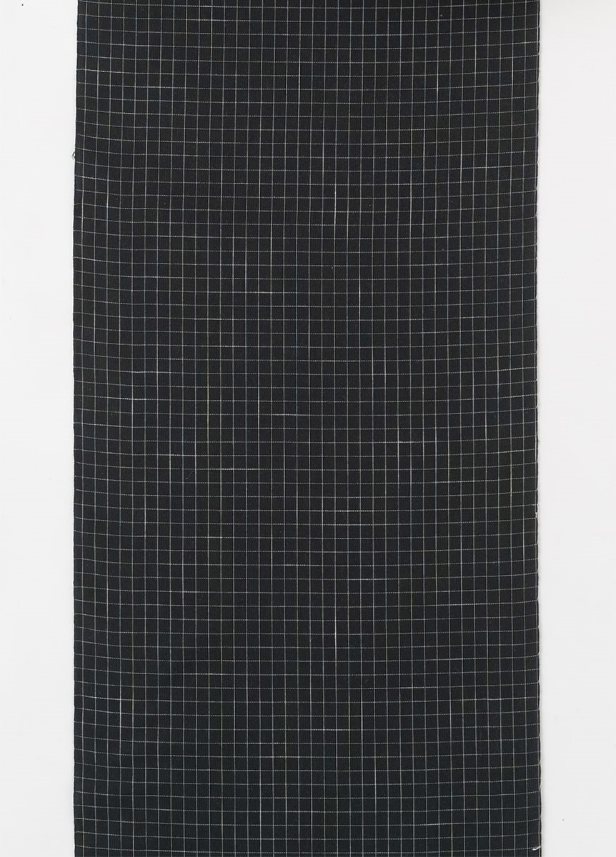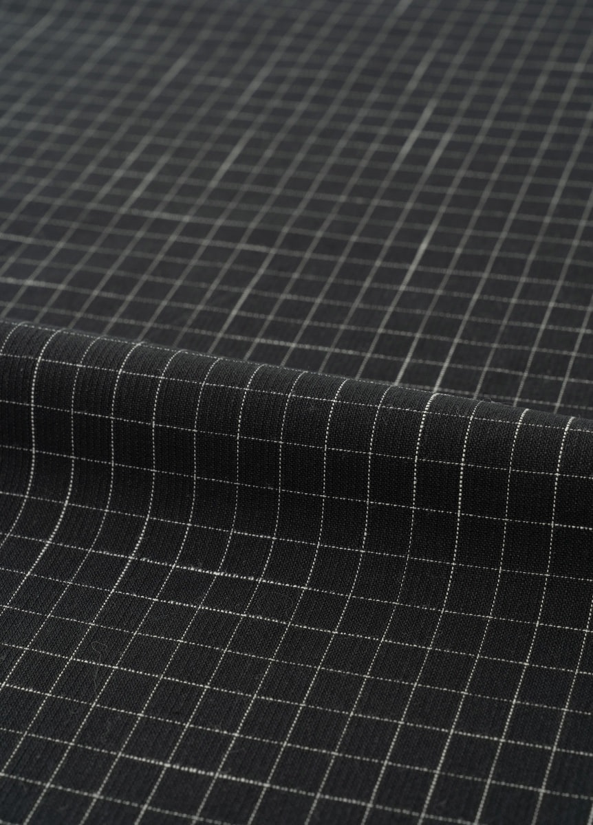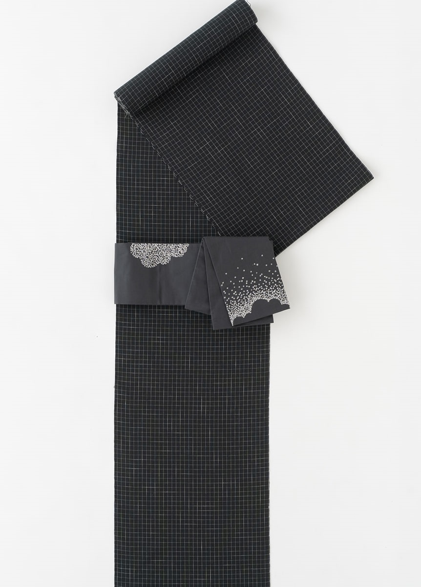 碁盤の目のように小さな格子柄は、カジュアルすぎず大人な印象に。黒地に白の経緯(たてよこ)がすっきりと、凛とした着姿を演出します。白地のセミフォーマル感のある名古屋帯と合わせれば、都会的なスタイリングに仕上がります。