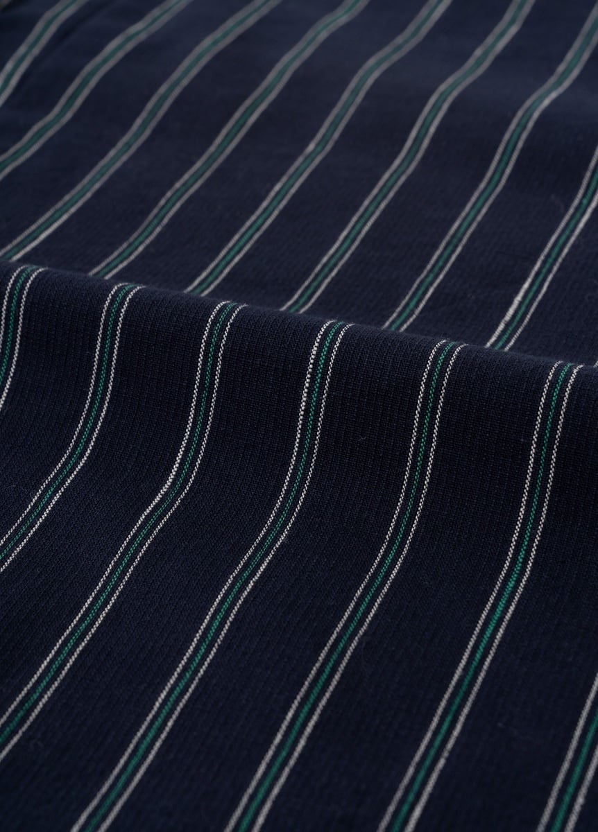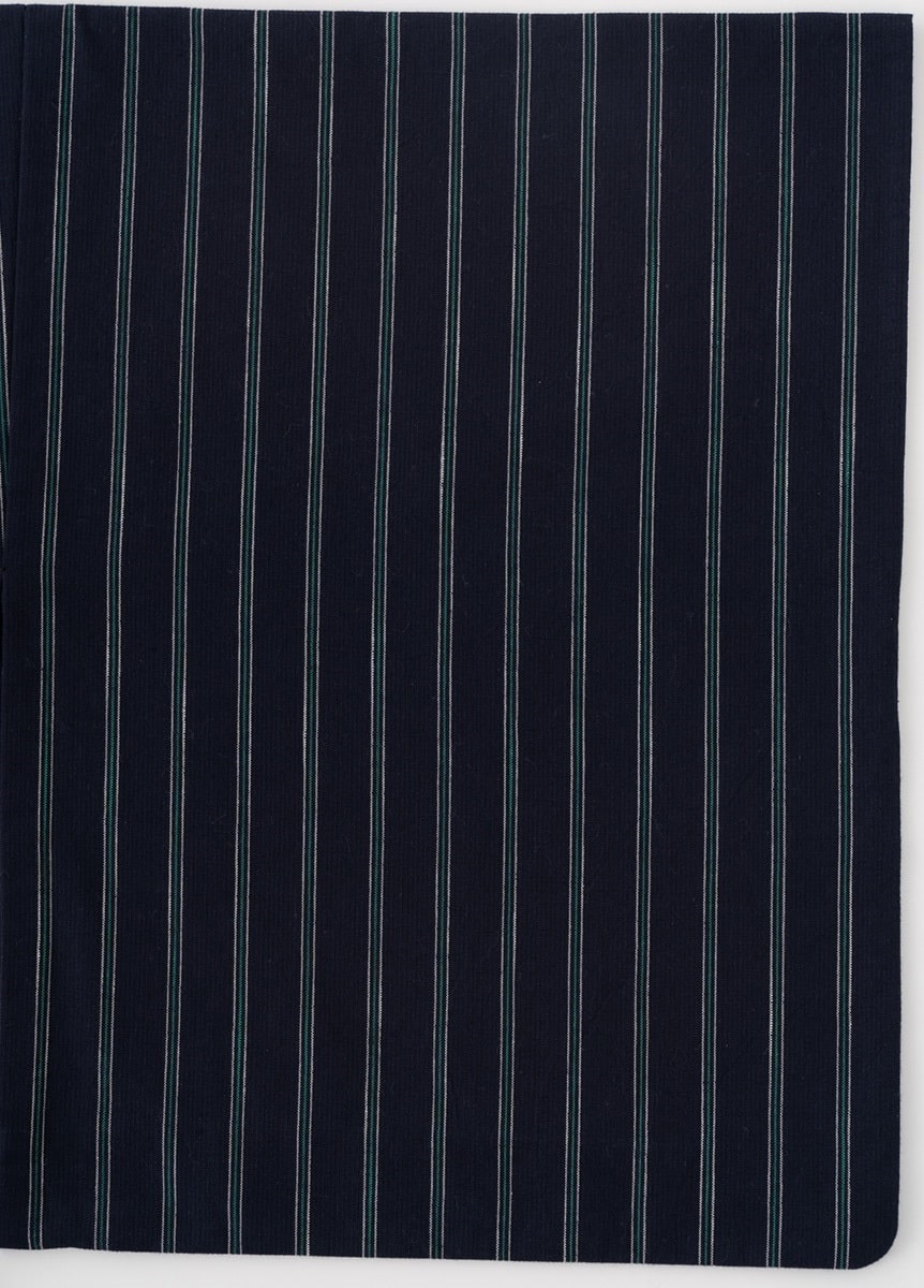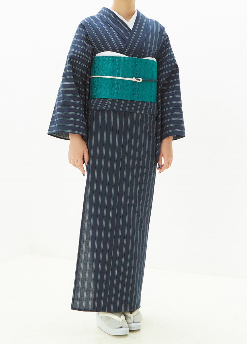 ベーシックな紺地に、ビビッドな緑の縞を合わせました。現代的で着やすい色柄で、コーディネートのしやすさもポイントです。インナーで温度調節いただける木綿のきものは、長い期間お楽しみいただけます。