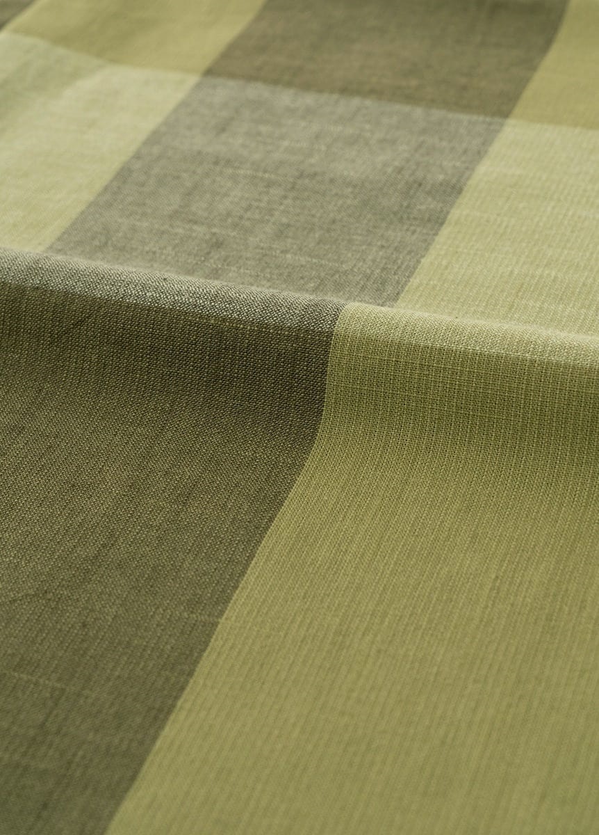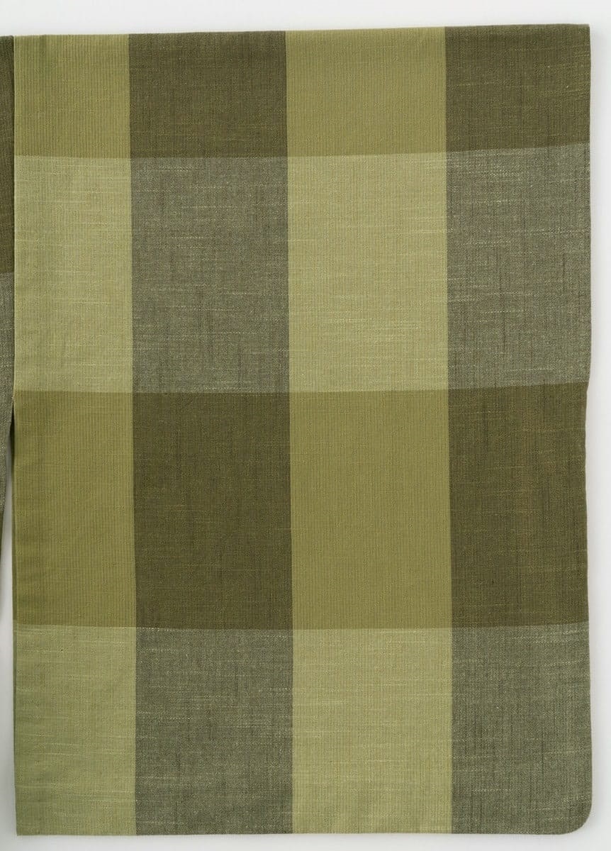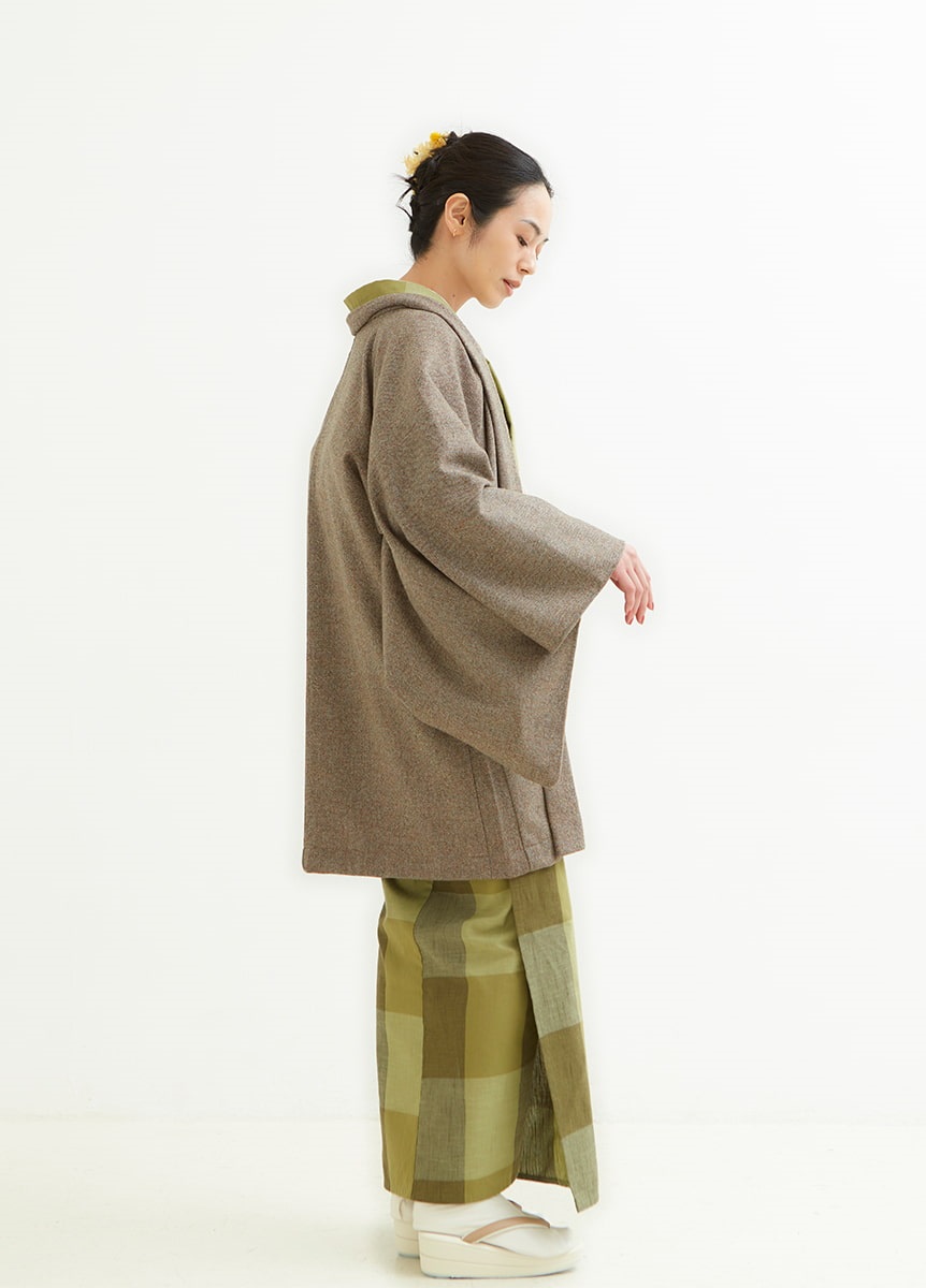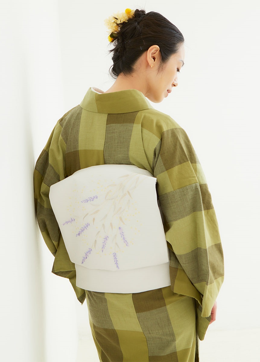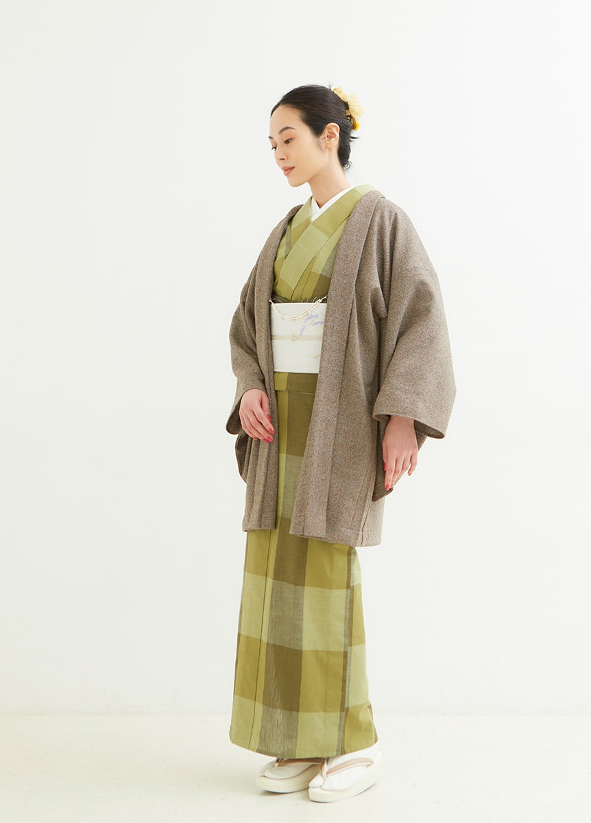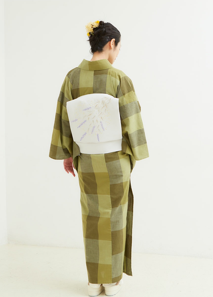 日本人に馴染み深く、美しいと感じるバランスがあります。それが白銀比と呼ばれるもの。身近なものでは文庫本など。そんな美しくなじみ深い比率で格子柄のきものをつくりました。格子の魅力は色の重なりです。自然風景の中で、森をイメージし緑の濃淡を重ねています。