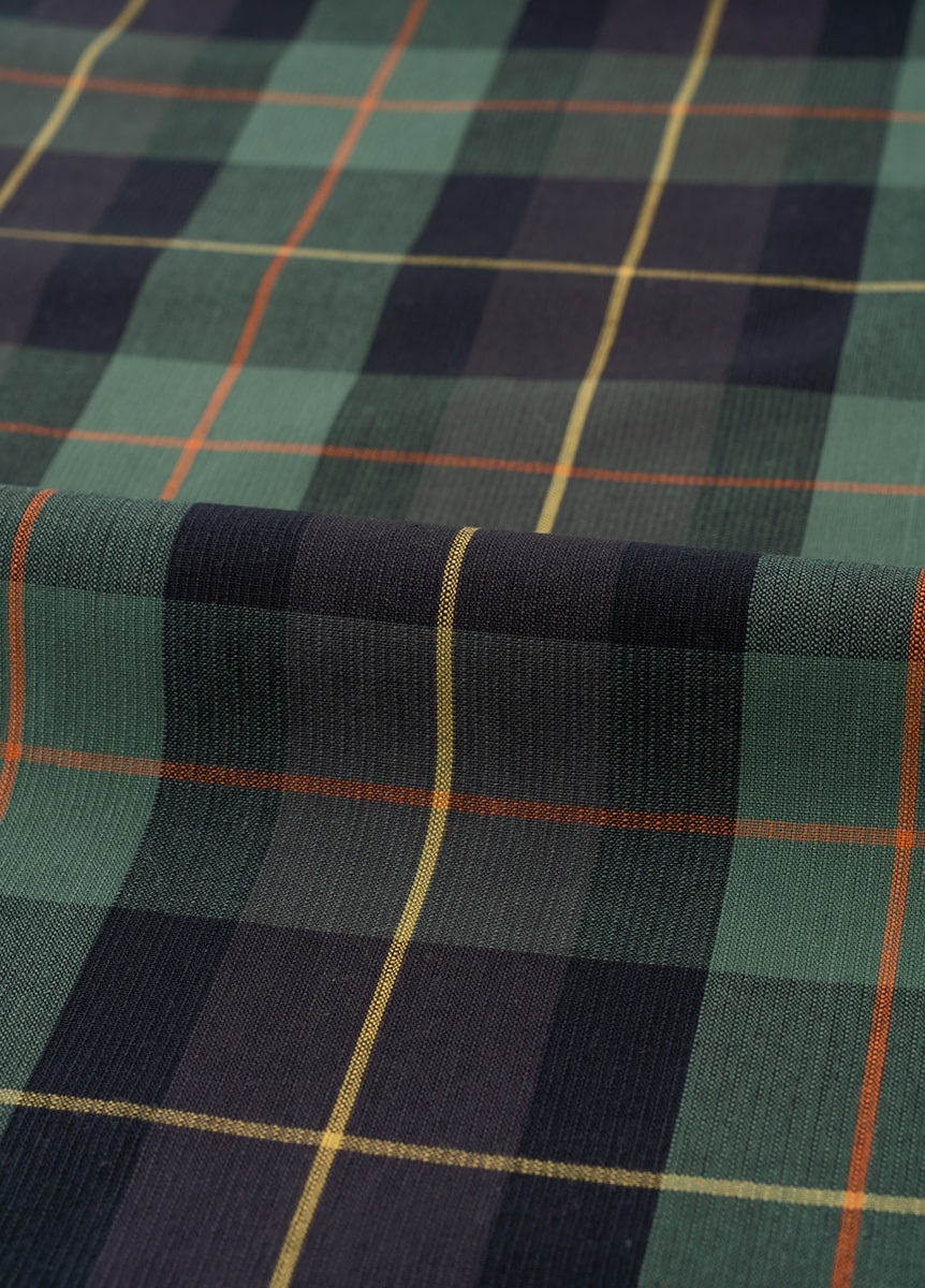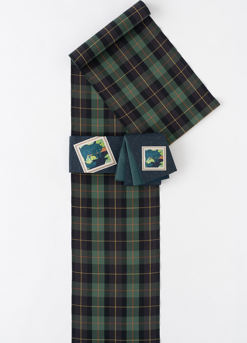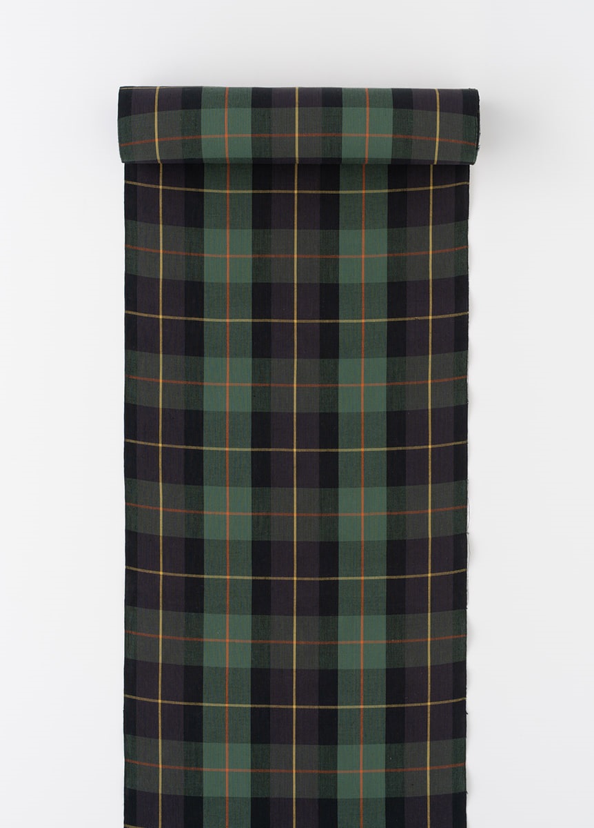 秋らしい組み合わせのタータンチェック柄。細いラインの橙とからし色を交互に入れることで、果実のような可愛らしさを加えました。半幅帯を合わせたカジュアルな着こなしがおすすめです。