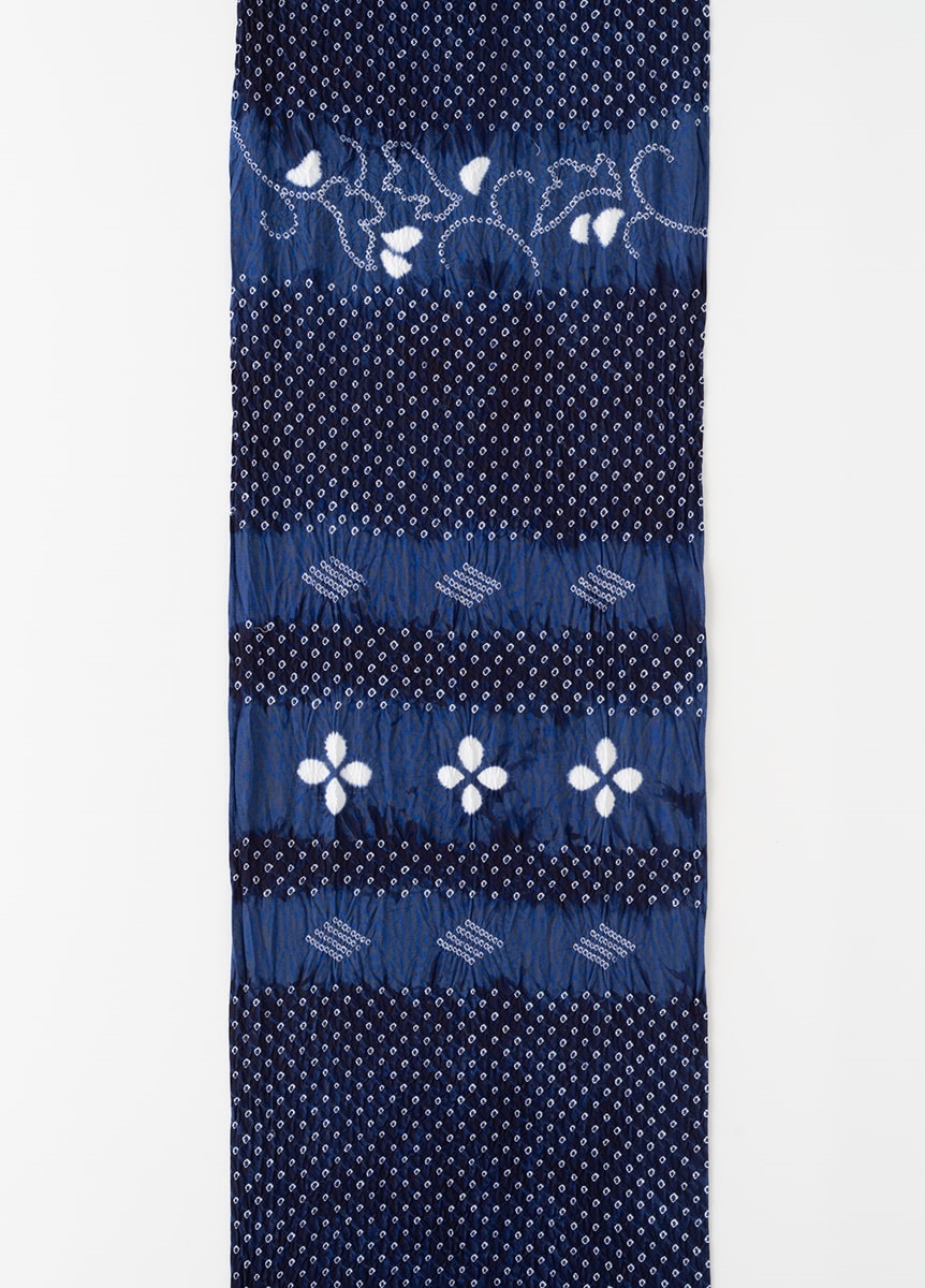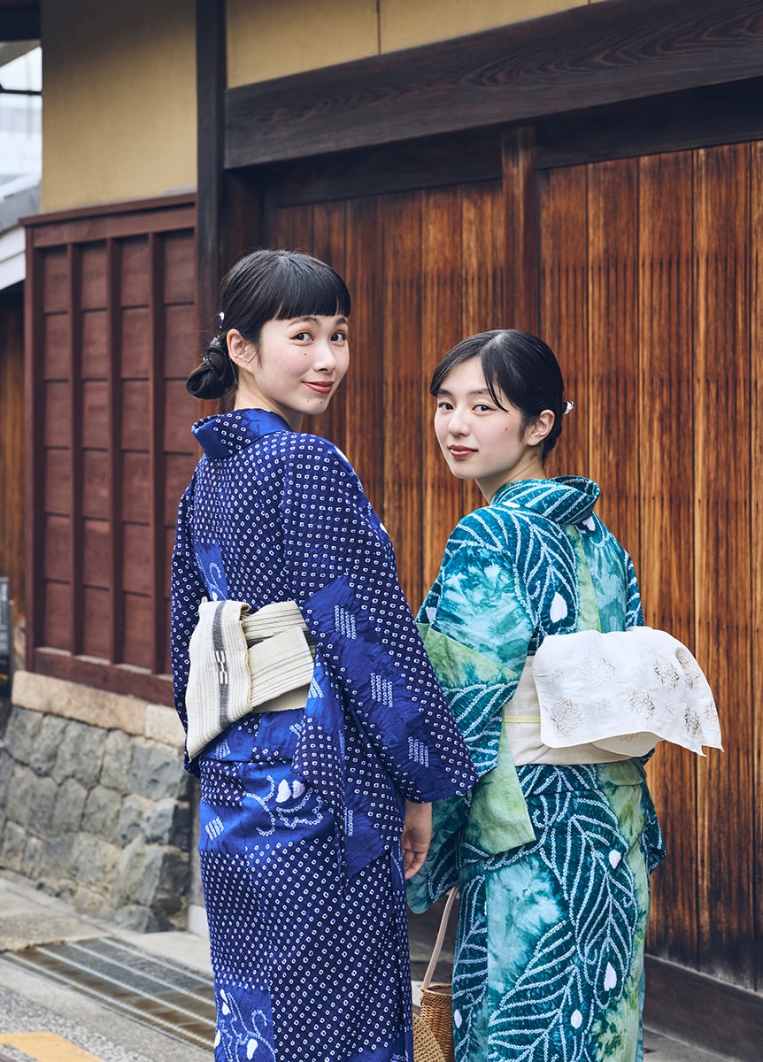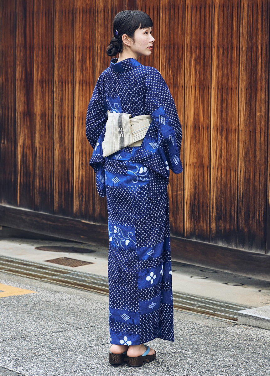 夏の庭に咲く草花をイメージした横段のデザインです。すっきりとした構図と配色に一目絞りと小帽子絞りの白がきりりと映え、上品で愛らしい印象に。同系配色の横段柄なのでカジュアルになりすぎず、絞りゆかたらしいあたたかみを感じる一枚です。