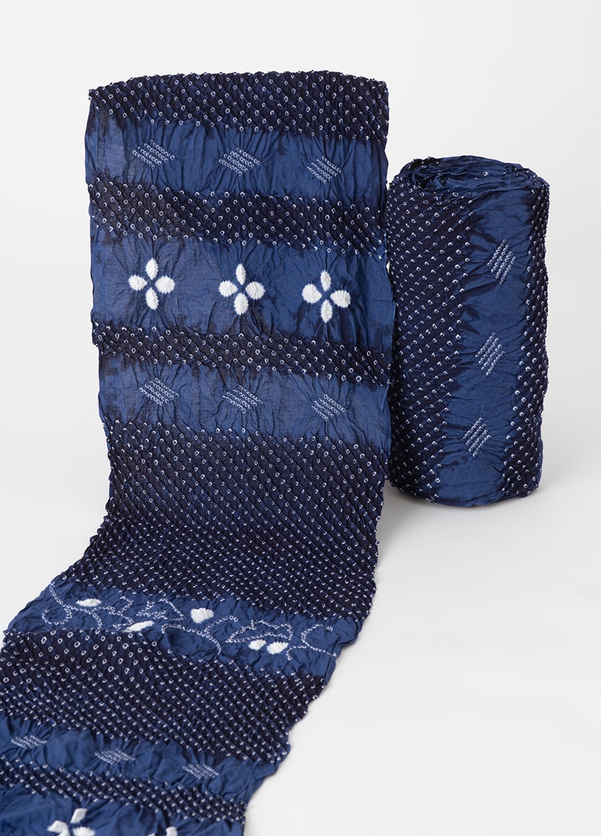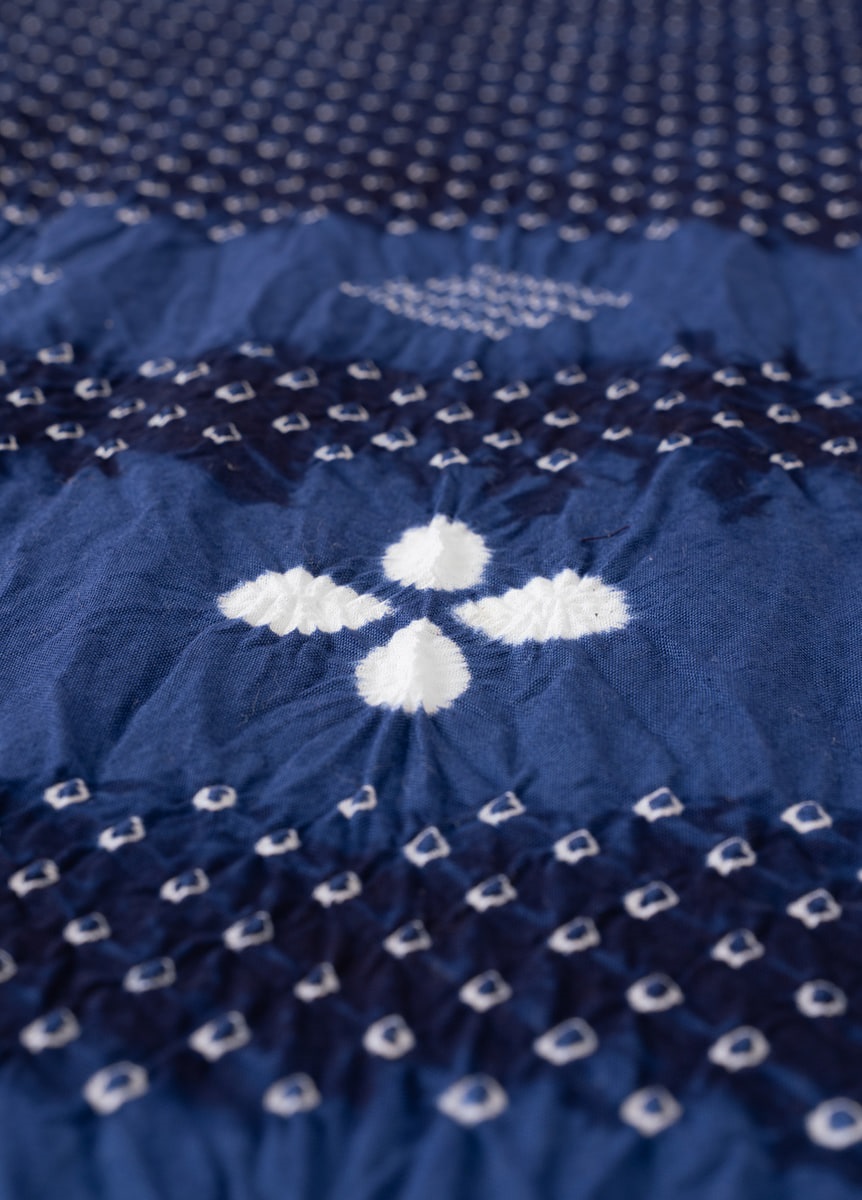 有松鳴海絞りは綿100%の生地に、様々な絞り技法を組み合わせて柄を表現しています。絞りを施すことにより、生地に凹凸が生まれます。そのため、肌との接地面が少なく清涼感へ繋がります。また、綿の柔らかな素材が肌当たり優しく肌心地の良い素材です。