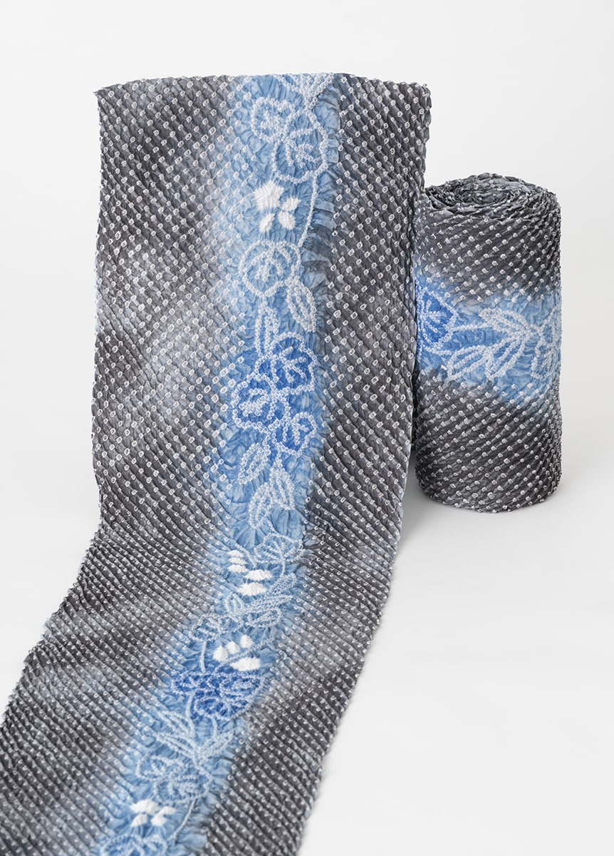 有松鳴海絞りは綿100%の生地に、様々な絞り技法を組み合わせて柄を表現しています。絞りを施すことにより、生地に凹凸が生まれます。そのため、肌との接地面が少なく清涼感へ繋がります。また、綿の柔らかな素材が肌当たり優しく肌心地の良い素材です。