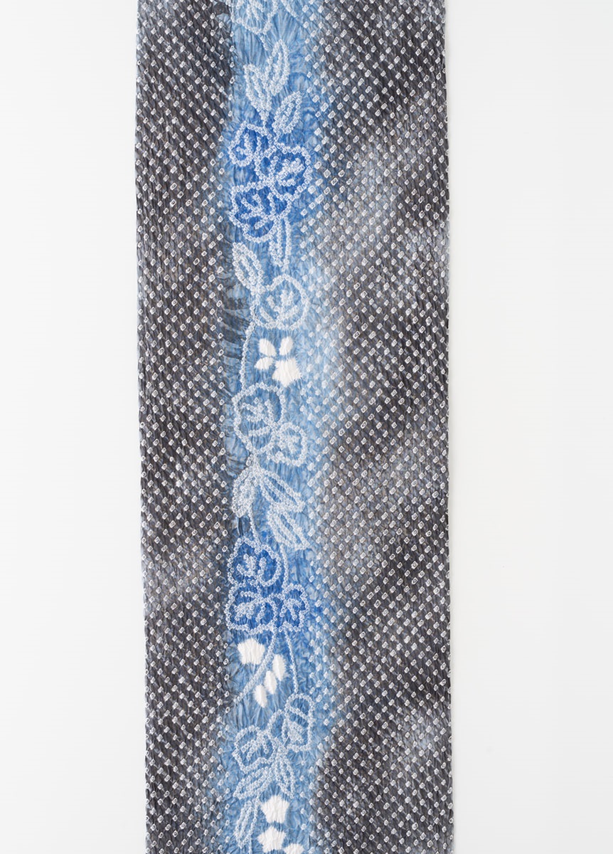 夏の光を受けて上へ上へと伸びる蔦をモチーフにしたデザインです。一目絞の繊細な蔦の流れと、小帽子絞りの小さな実や葉のコントラストが魅力。流し染めにより背景に自然な濃淡・色の移ろいが生まれ、透明感のある涼しげな着姿になります。