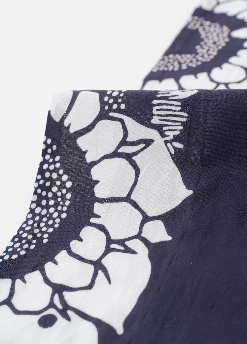反物の中心にひまわりを連ねて表現した、大胆で夏らしい一枚。紺と白のコントラストが効いた配色で、華やかに装うデザインです。
