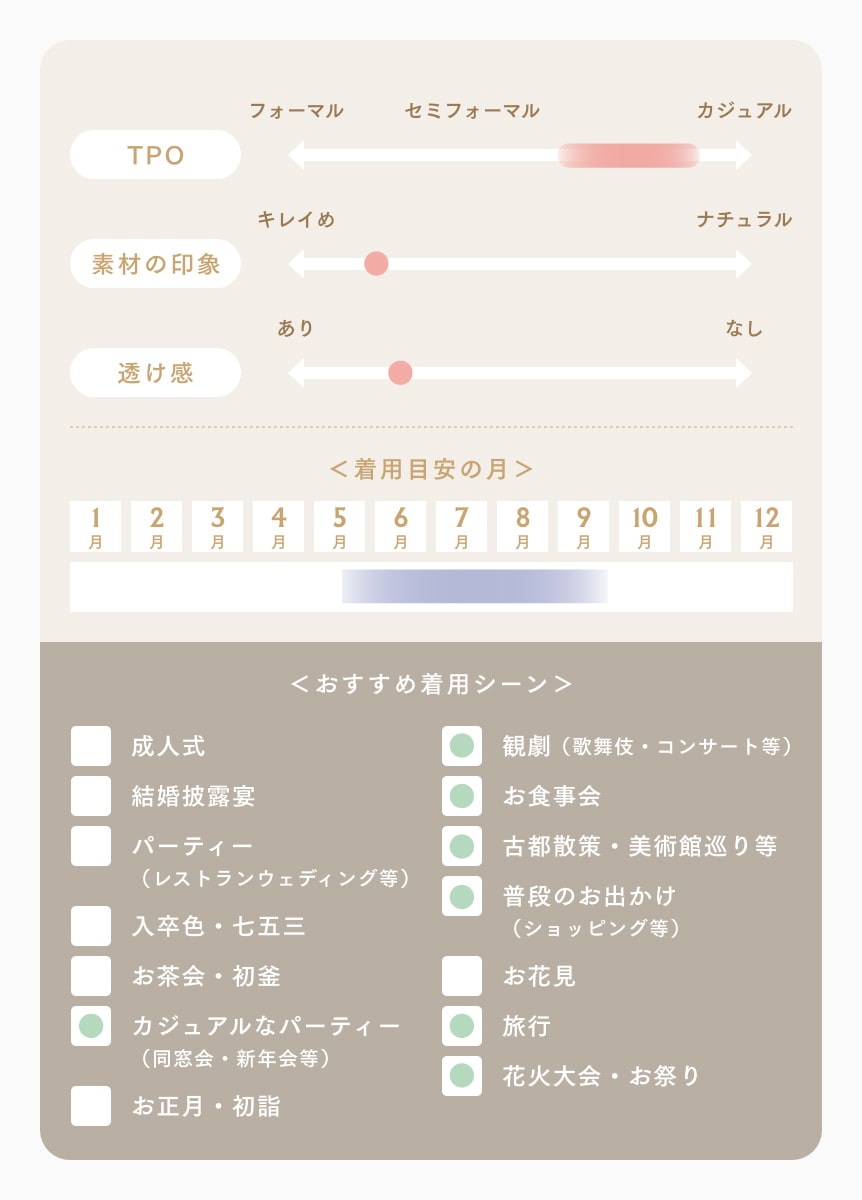 「やまと可憐ゆかた」で使用していた東レアルファートのセオα楊柳を使用しました。シボ感のある楊柳生地は、肌との接地面が小さく、さらさらとした肌触りが特長です。吸水性・速乾性に優れた機能性素材で、夏も快適にご着用いただけます。長襦袢や羽織を合わせた夏きもの風のきこなしもおすすめです。
