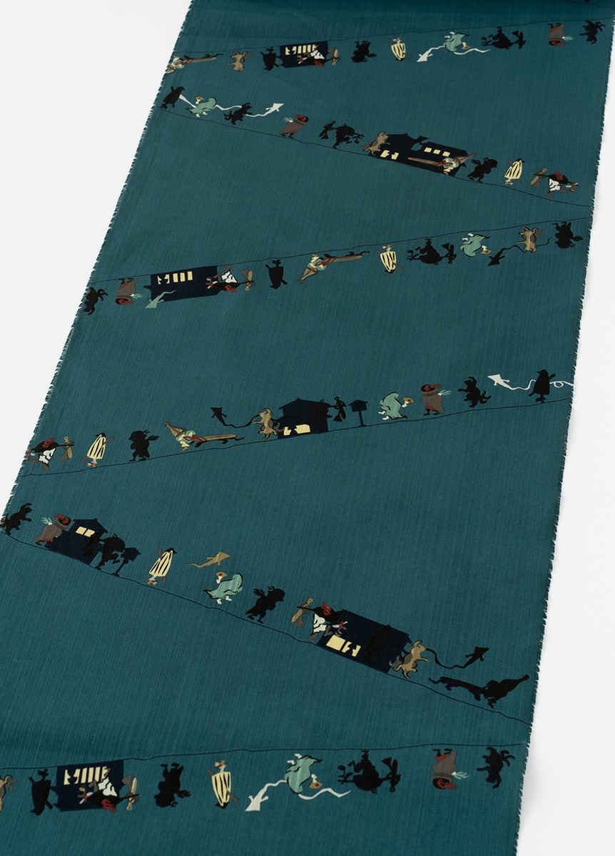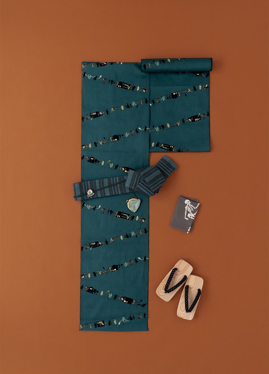 夜にひそむ妖怪たちが、どこかユーモラスに行き交う百鬼夜行を描いた一着。様々な浮世絵で見られる妖怪をゆかたの柄としてデザインしました。中には、長い年月を経て妖怪になる付喪神も交えて、個性豊かに描きました。江戸の遊び心と粋な笑いをまとえる、夏ならではのゆかたです。