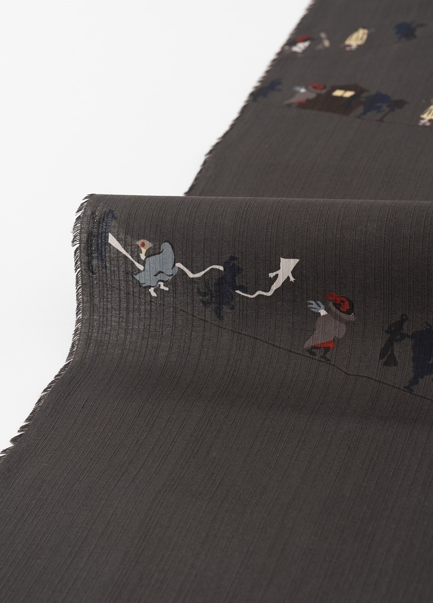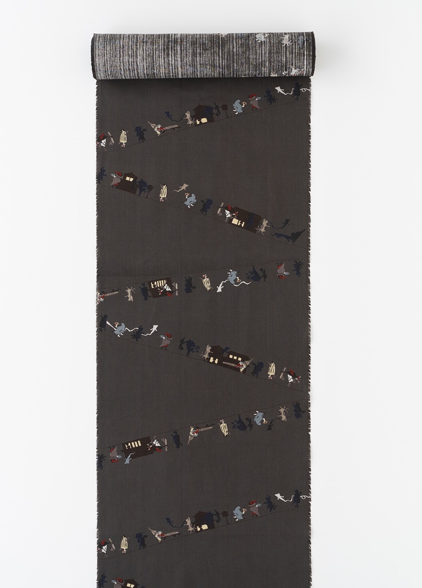 日の光や、あかりが苦手な妖怪たち。火を消した木炭のような色のイメージから、消炭色と名付けました。暗い夜道を妖怪たちが歩いているようにも見える配色です。遊びのある柄をシックな配色で表現しました。