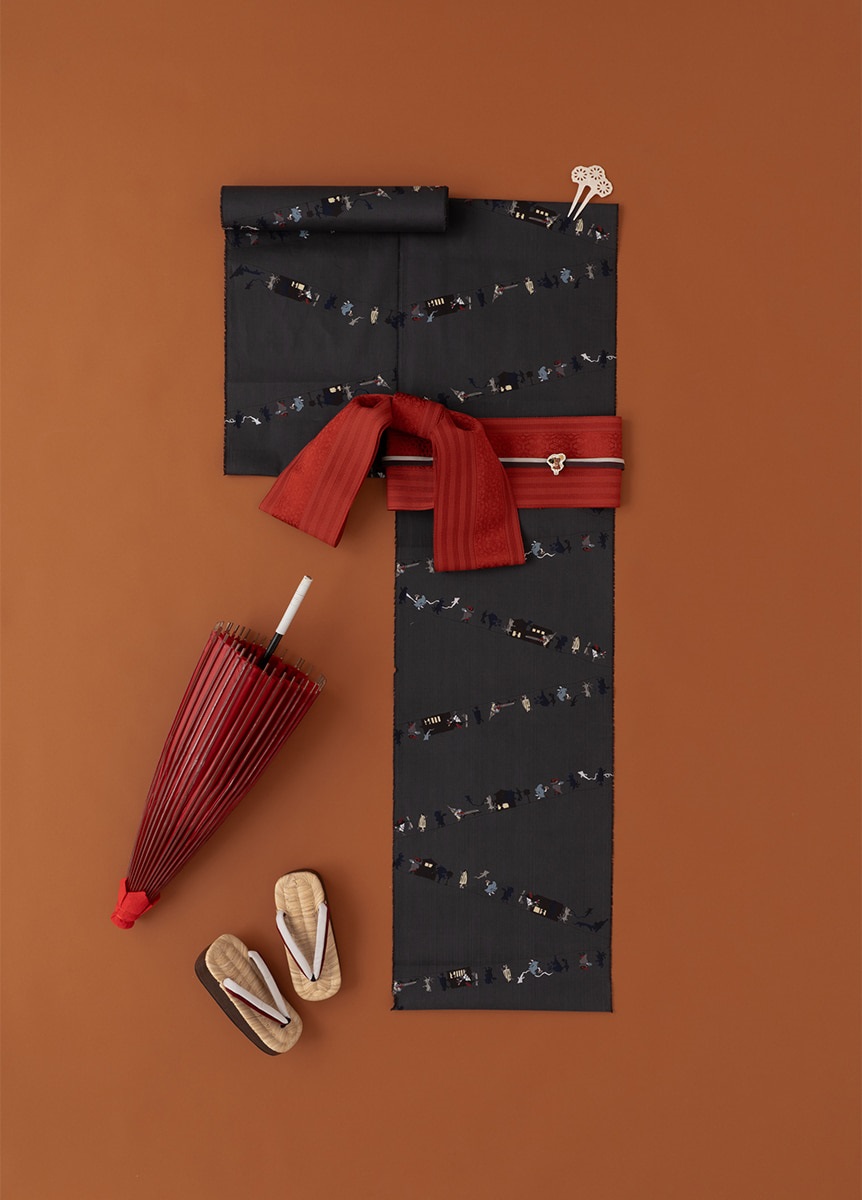 夜にひそむ妖怪たちが、どこかユーモラスに行き交う百鬼夜行を描いた一着。様々な浮世絵で見られる妖怪をゆかたの柄としてデザインしました。中には、長い年月を経て妖怪になる付喪神も交えて、個性豊かに描きました。江戸の遊び心と粋な笑いをまとえる、夏ならではのゆかたです。