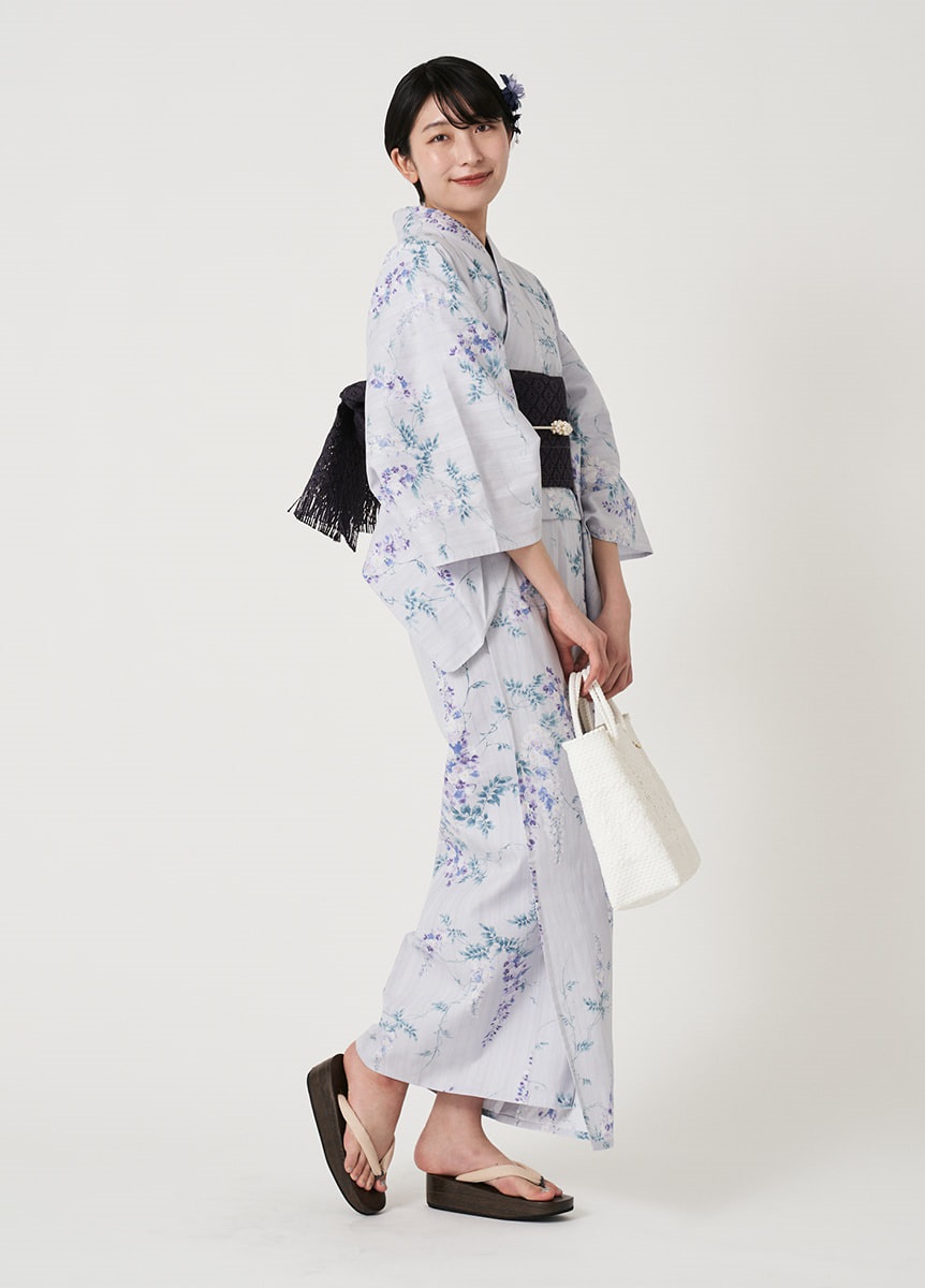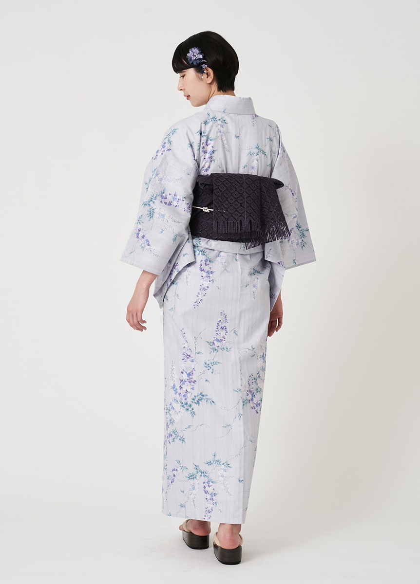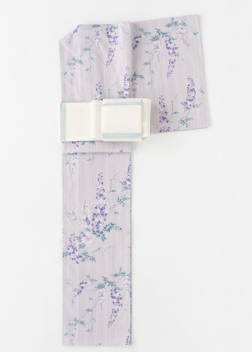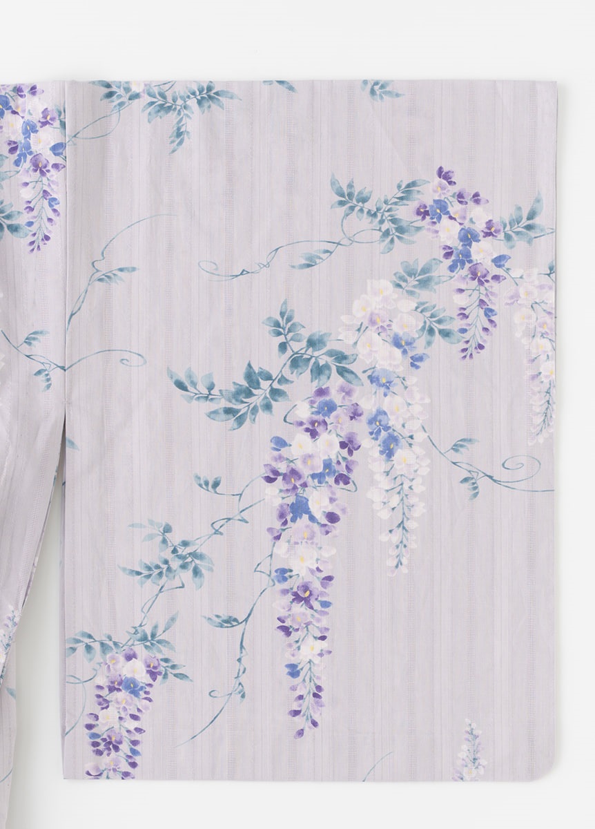 人気の下り藤デザインは、よりにおい立つような藤野雰囲気が楽しめるよう、地色にこだわりました。藤色はふんわりとした甘い香りがしそうな、やわらかな色合い。世代をとわず着られる万能カラーです。