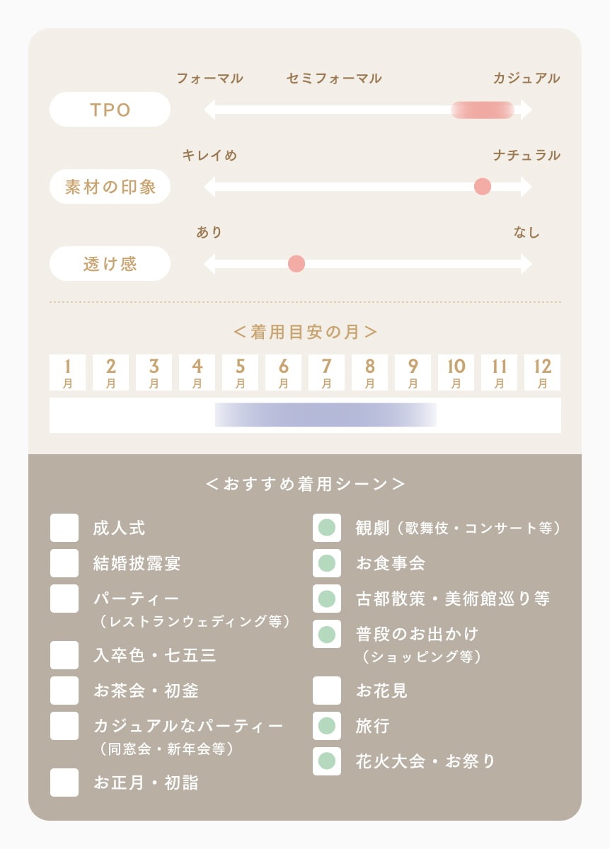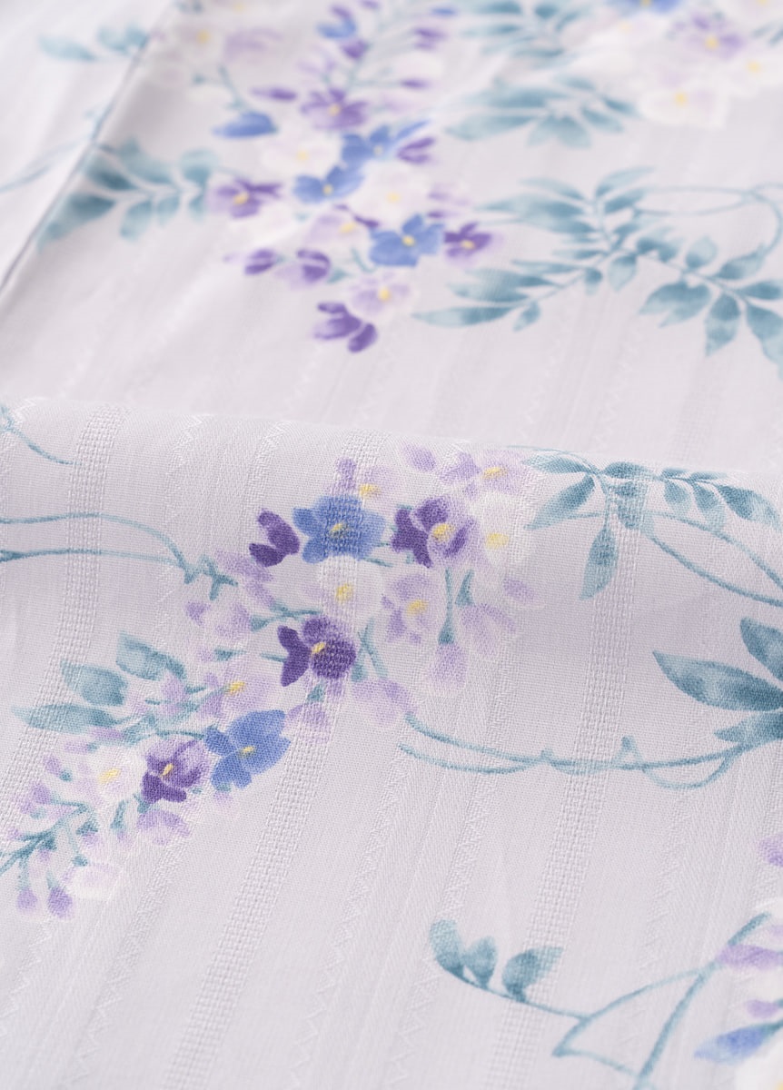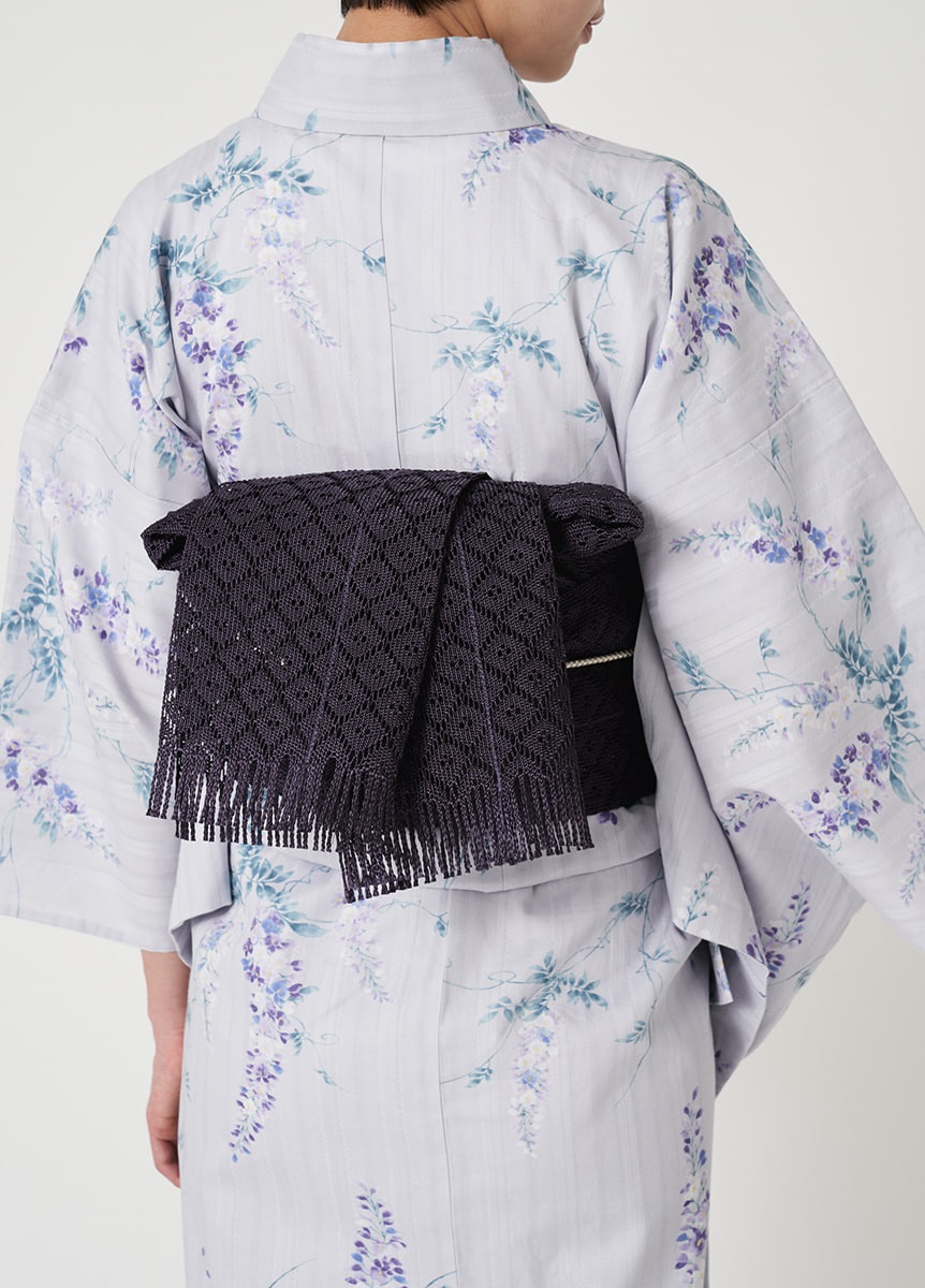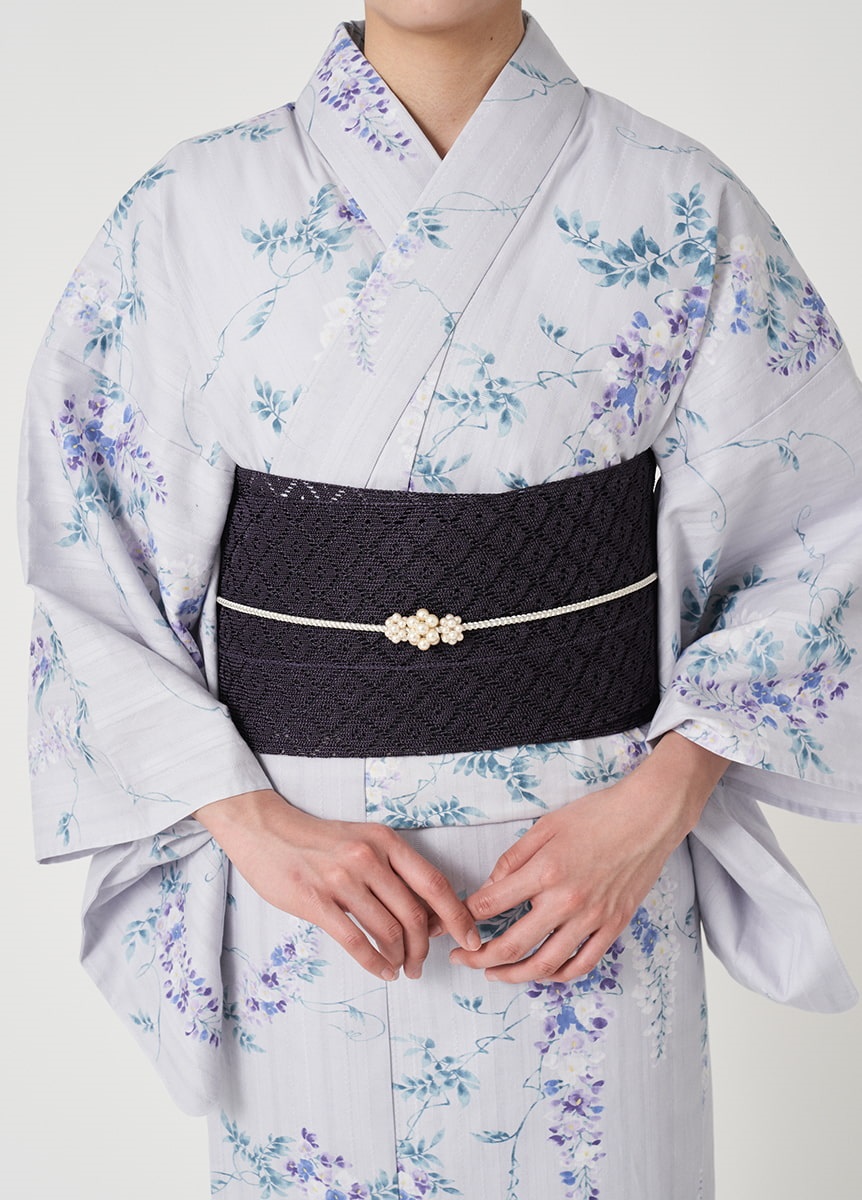 人気の下り藤デザインは、よりにおい立つような藤野雰囲気が楽しめるよう、地色にこだわりました。藤色はふんわりとした甘い香りがしそうな、やわらかな色合い。世代をとわず着られる万能カラーです。