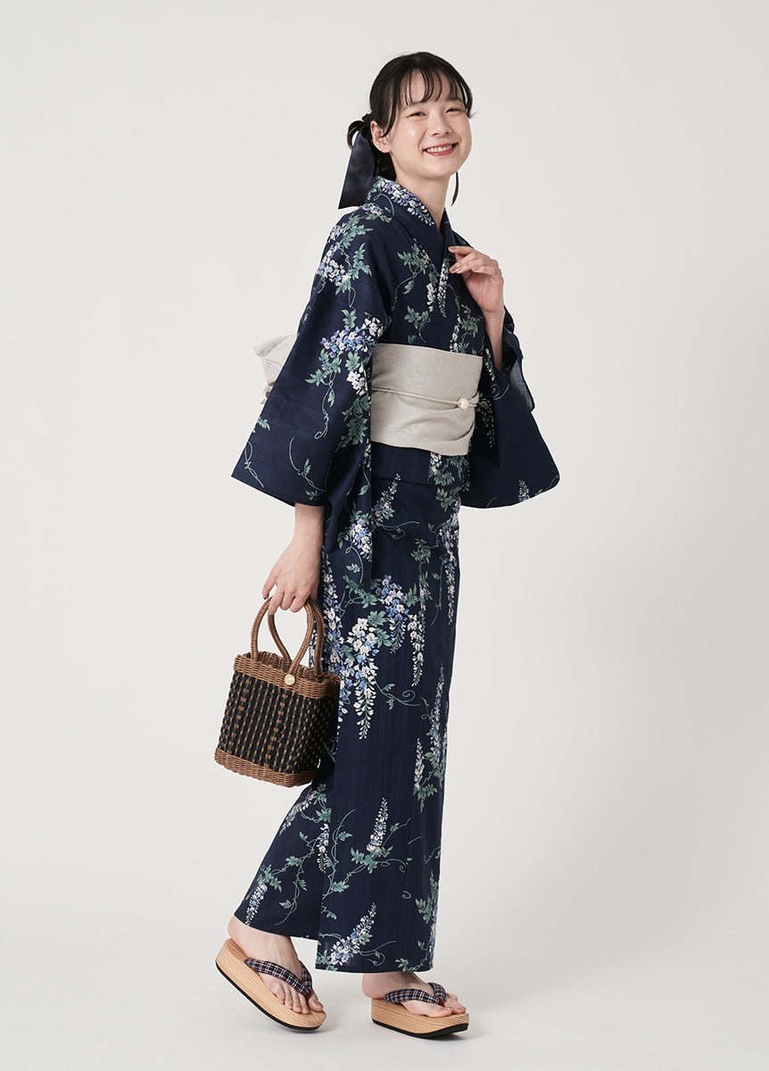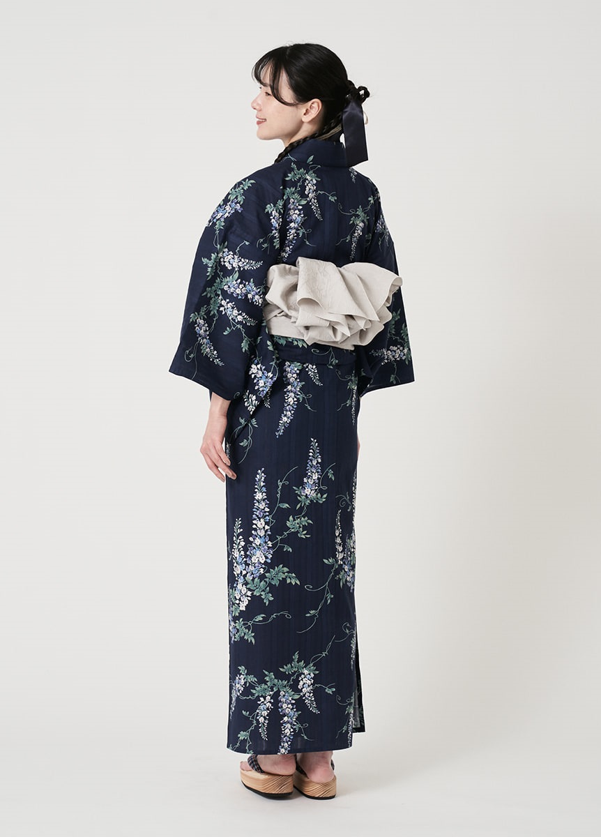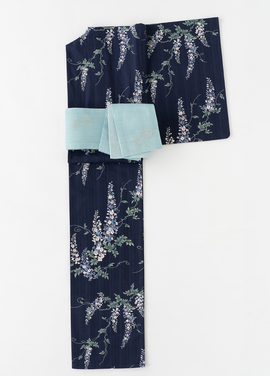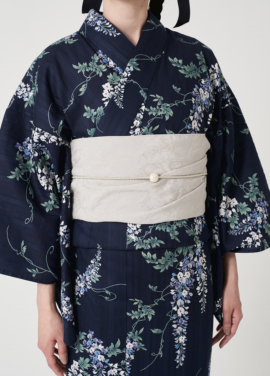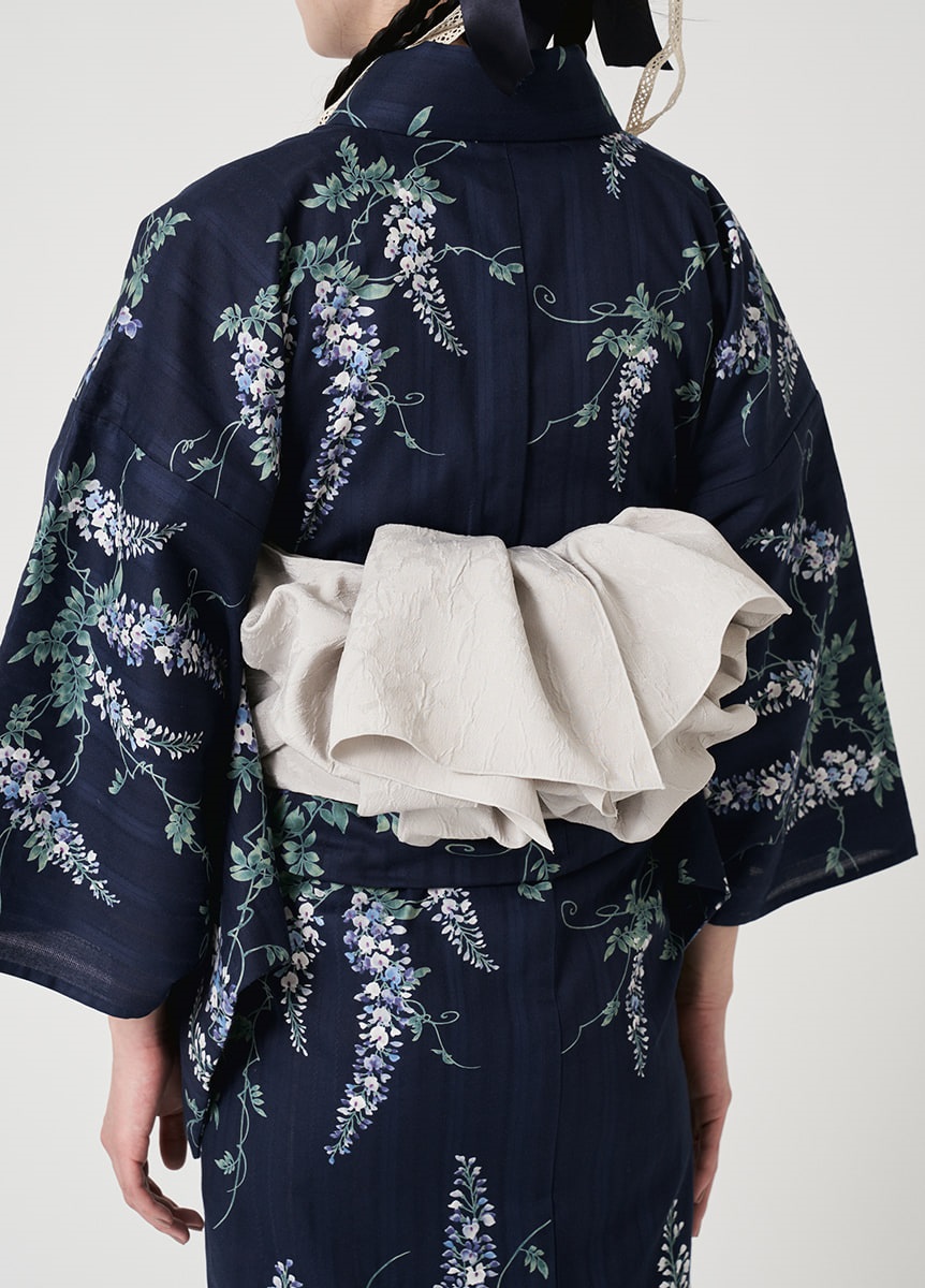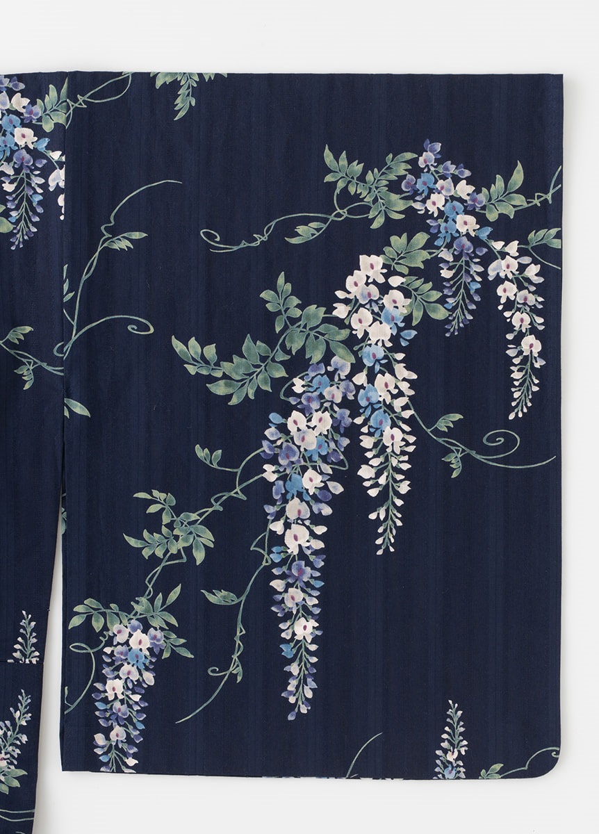 人気の下り藤デザインは、よりにおい立つような藤野雰囲気が楽しめるよう、地色にこだわりました。夜風にそよぐような藤が涼し気で、大人の上品な雰囲気が漂います。