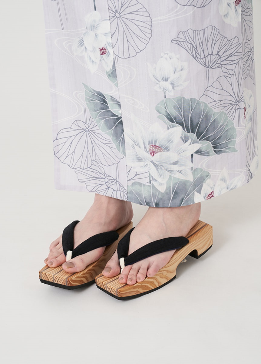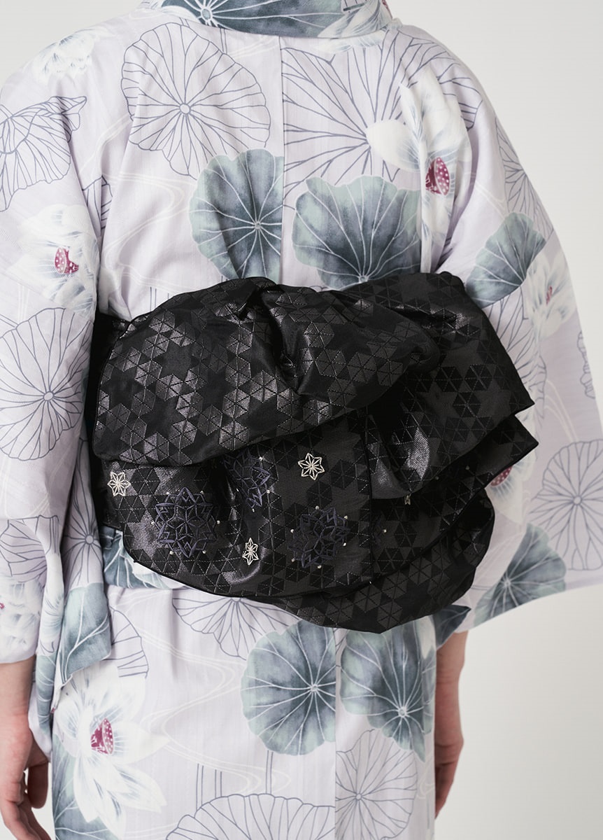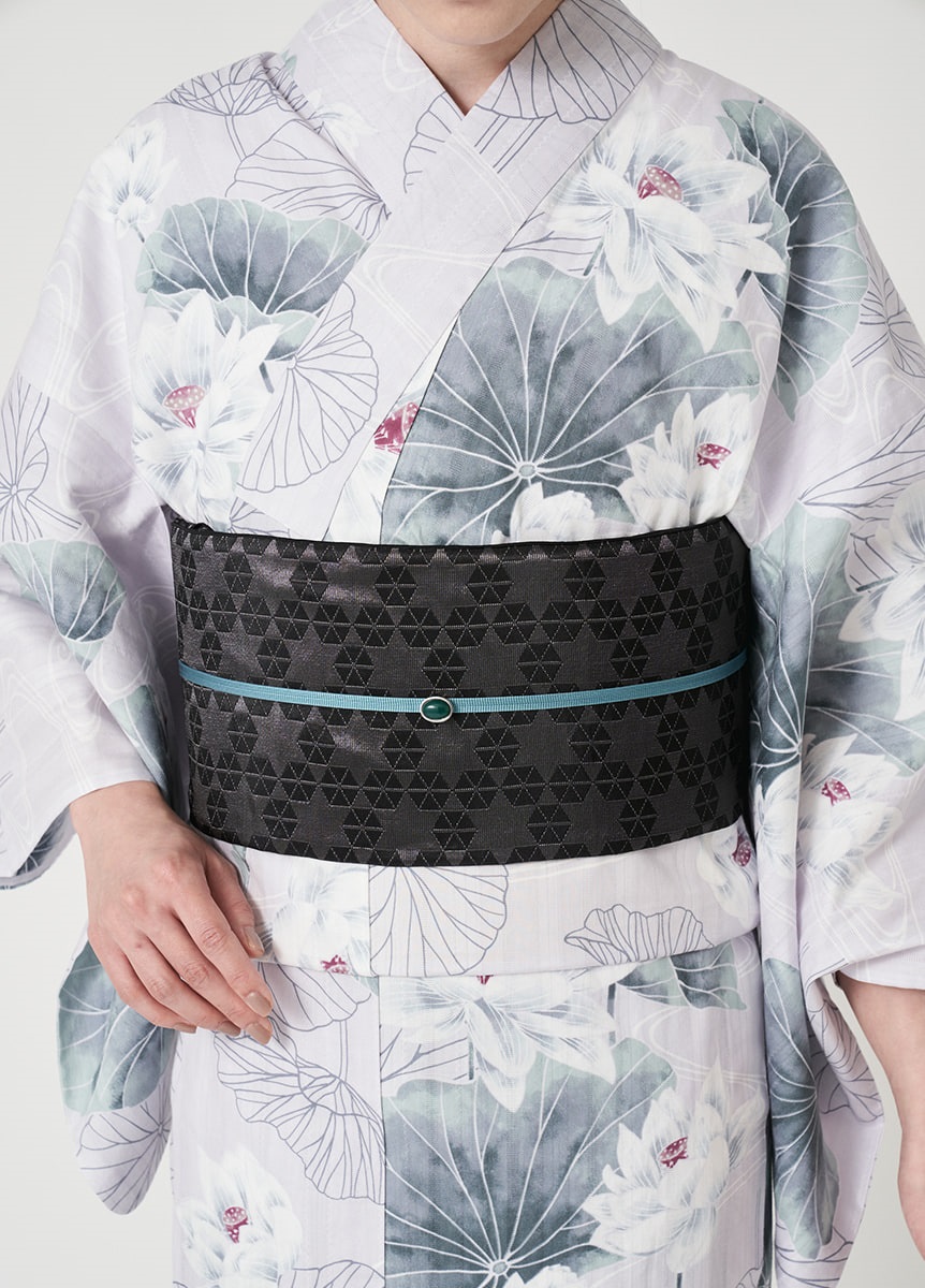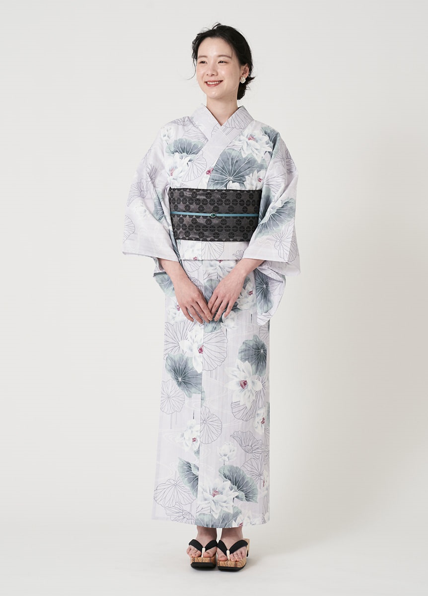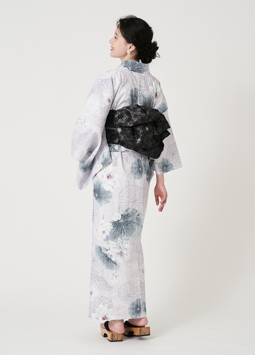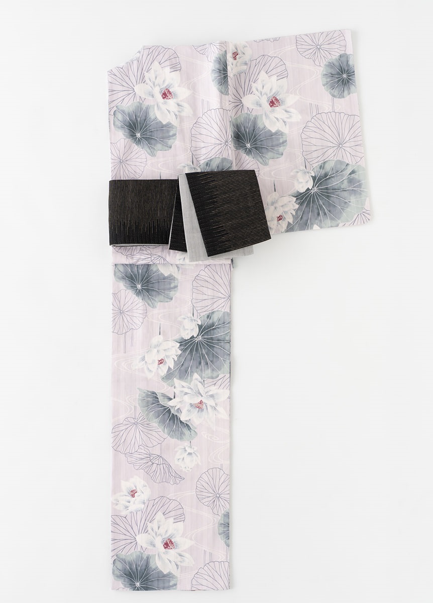 ごく淡い藤色が大人な雰囲気の流水に蓮。水辺を連想させるような瑞々しいタッチで、花芯には赤紫のワンポイントを添えました。