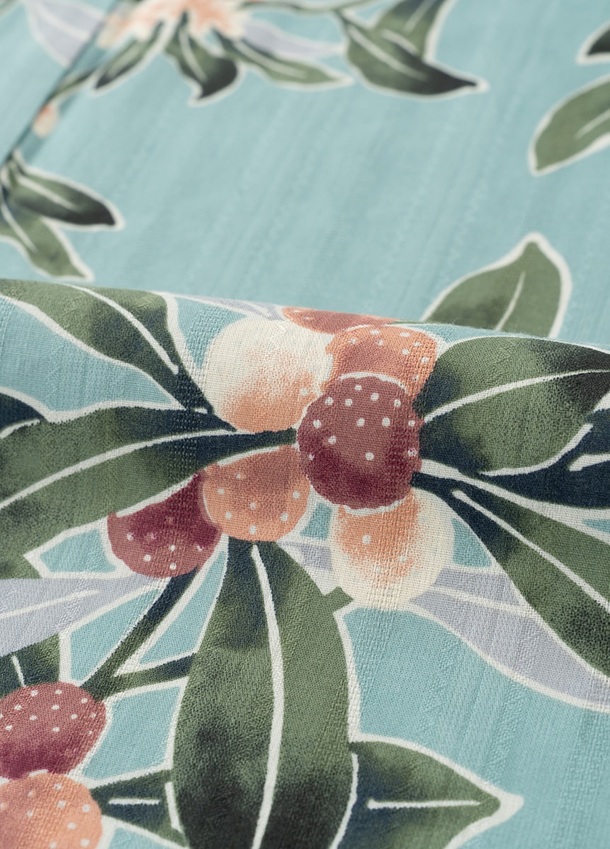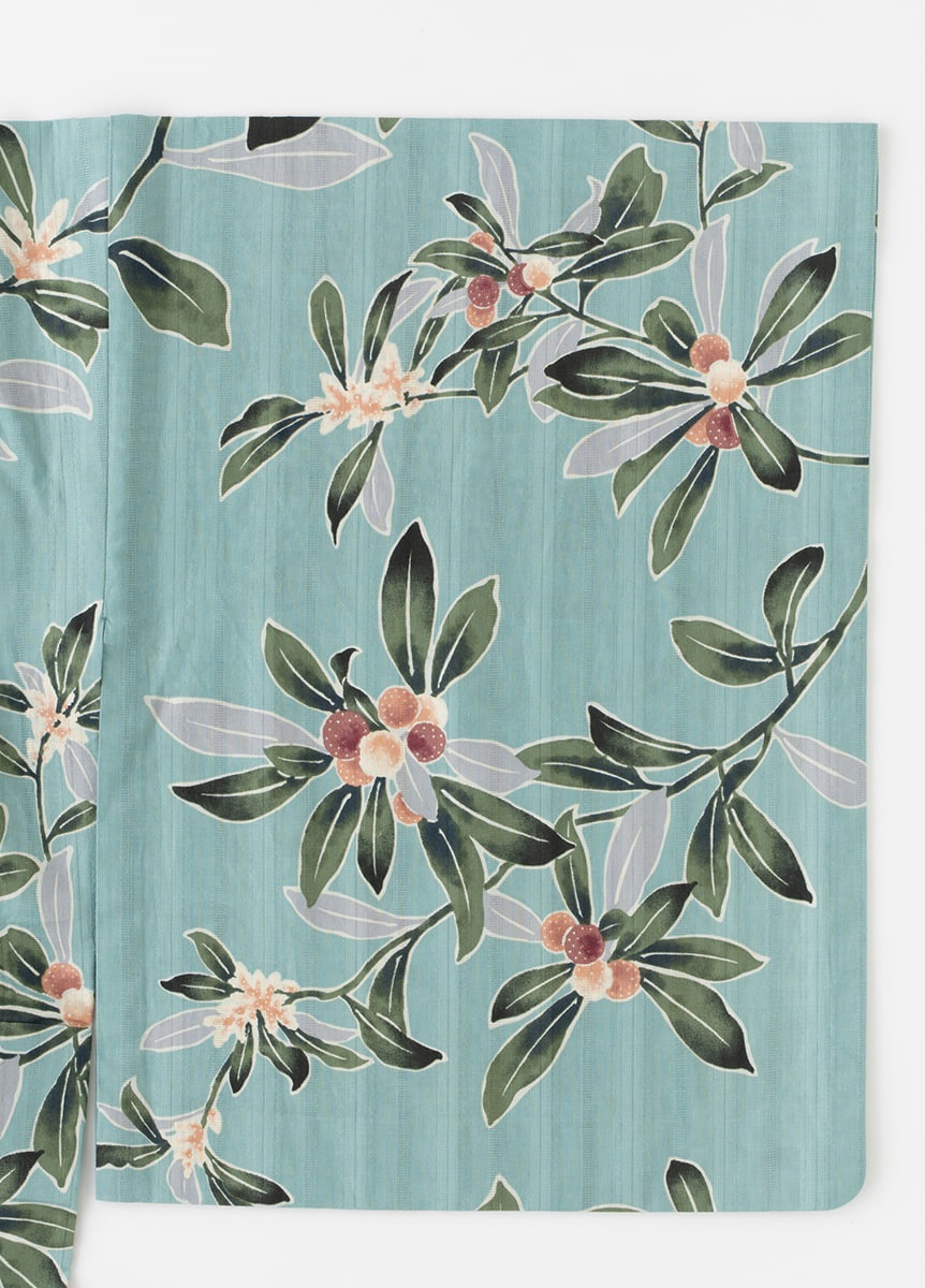 甘酸っぱい山桃が夏空に広がる様子を表現しました。葉を濃淡のぼかしで大胆に、果実や花の粒粒感は繊細に描くことで、コントラストをつけています。フルーティーな香りが漂うような、かわいらしいデザインです。