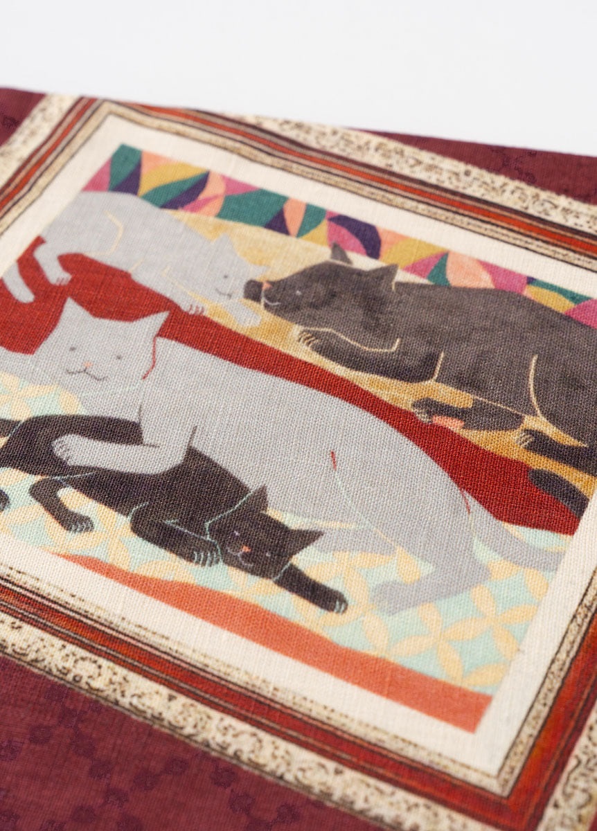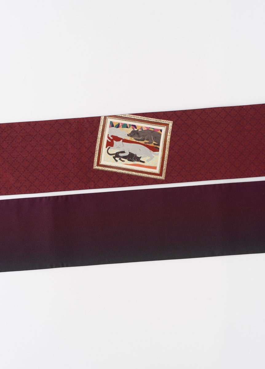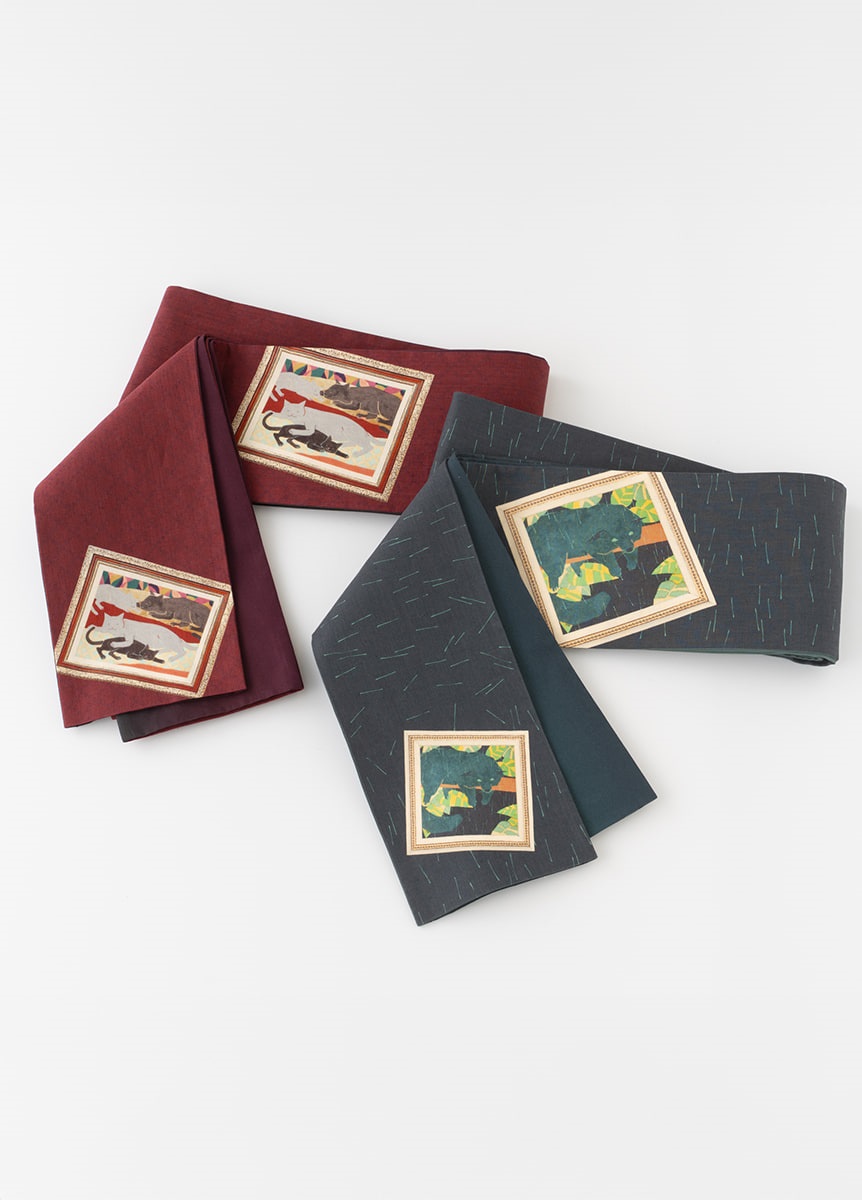 日本画家である中條亜耶氏が描くカラフルでポップな動物たちの作品を、半巾帯の中にデザインとして落とし込みました。のんびりと過ごす動物たちの表情が、見る人の心も穏やかにします。