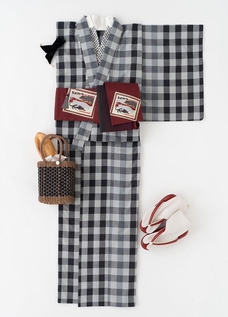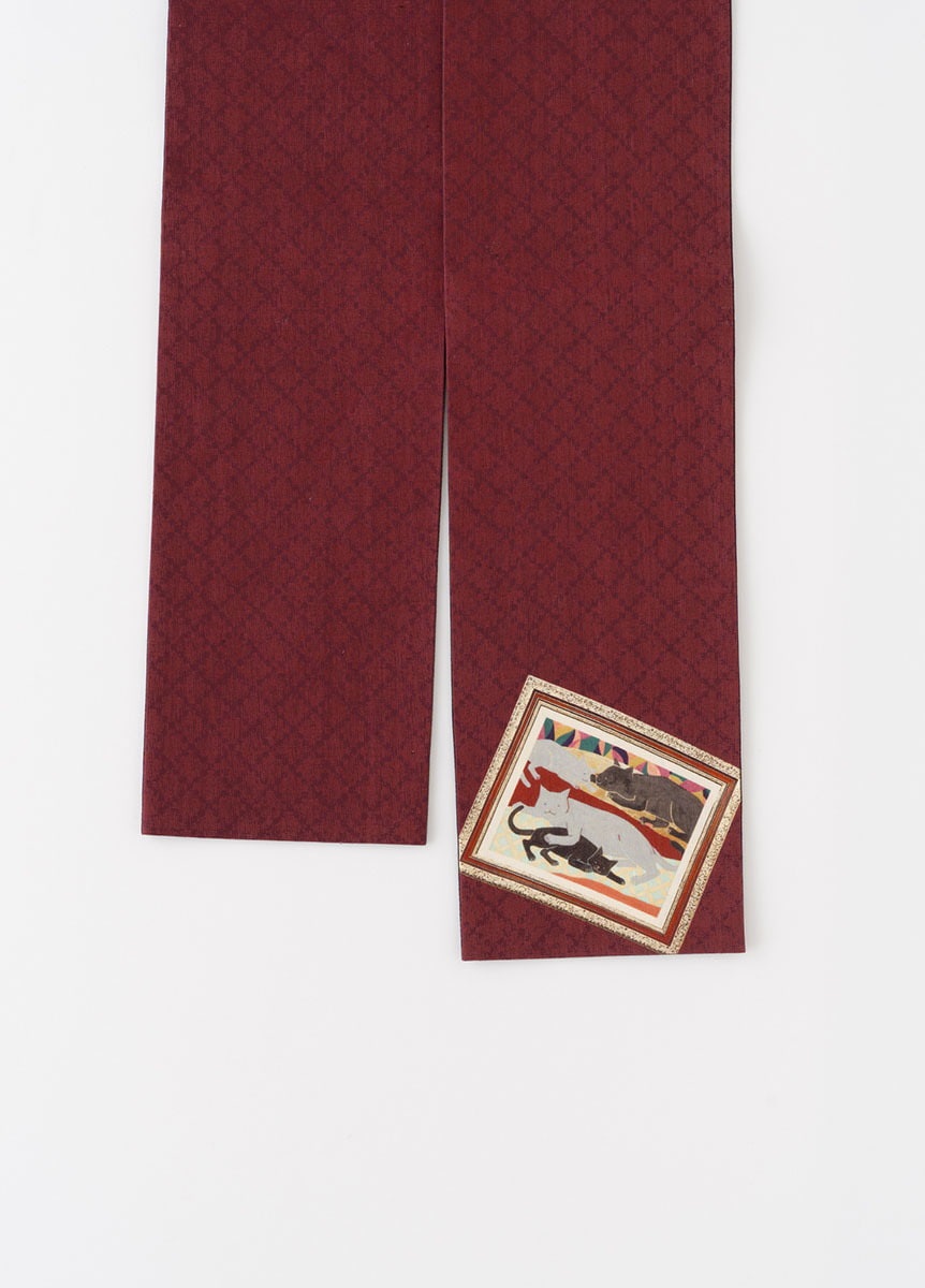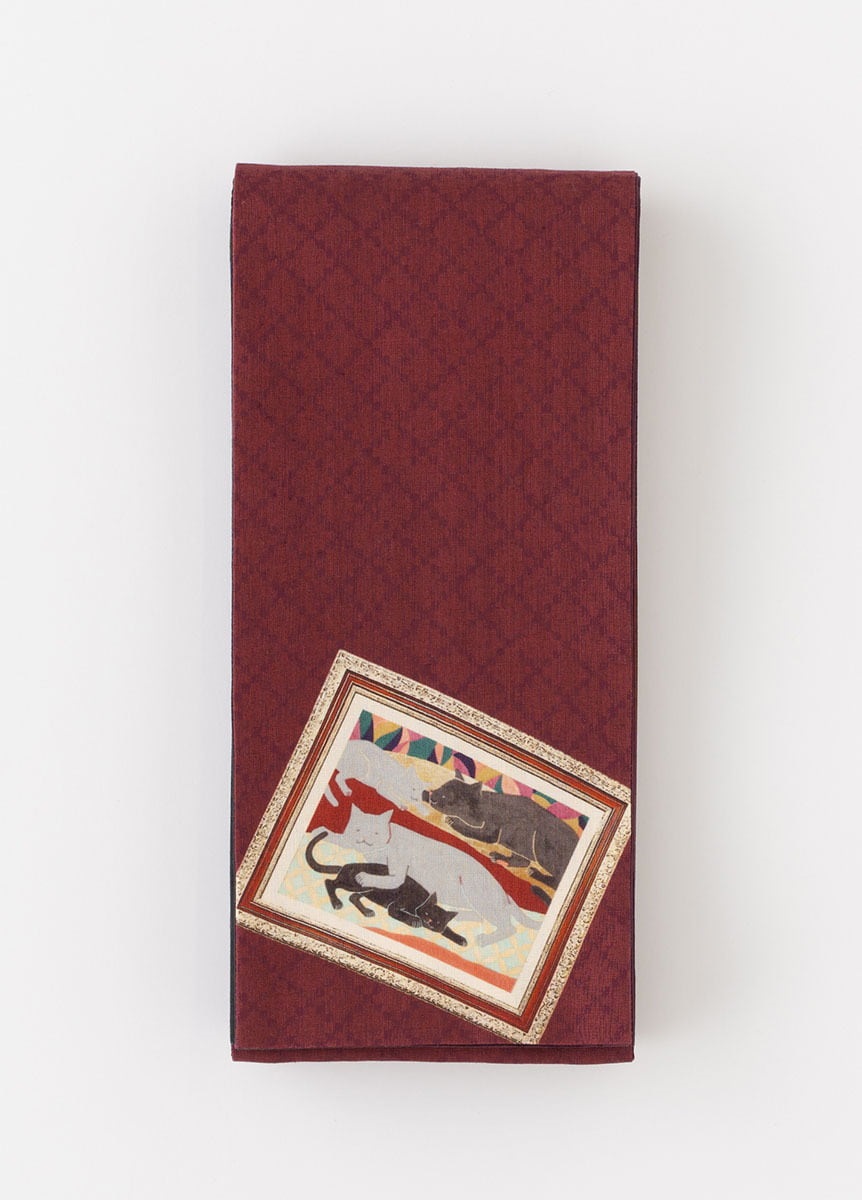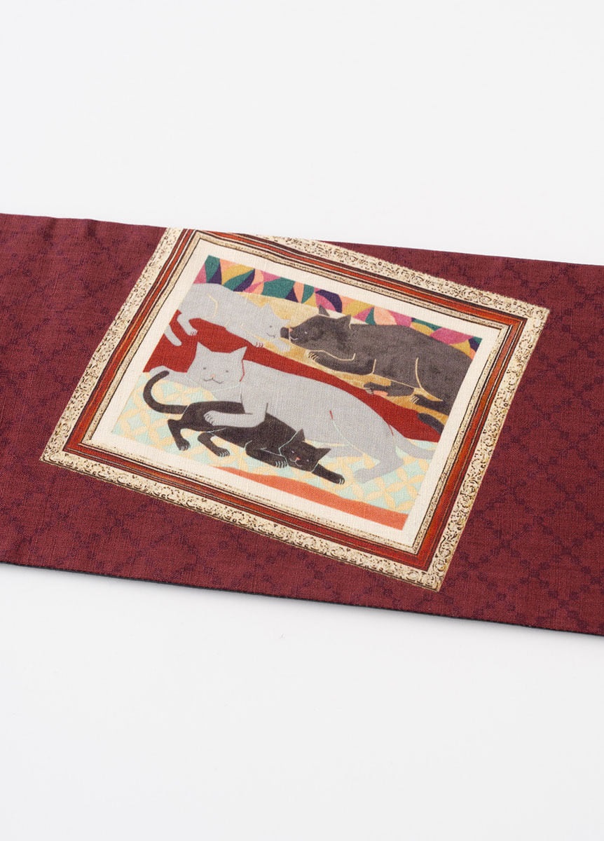 日本画家である中條亜耶氏が描くカラフルでポップな動物たちの作品を、半巾帯の中にデザインとして落とし込みました。のんびりと過ごす動物たちの表情が、見る人の心も穏やかにします。