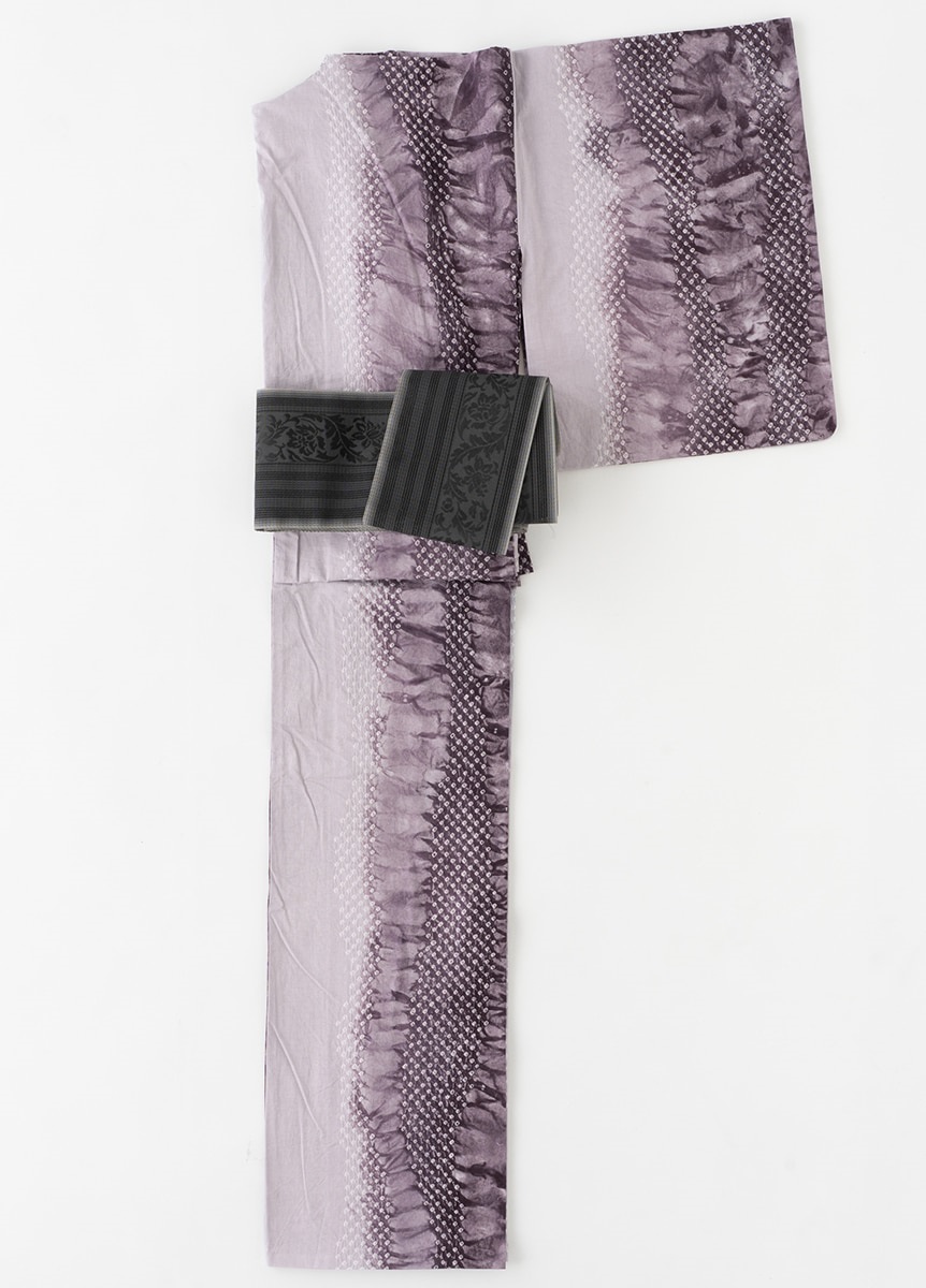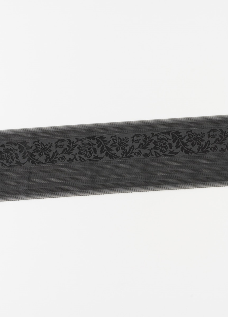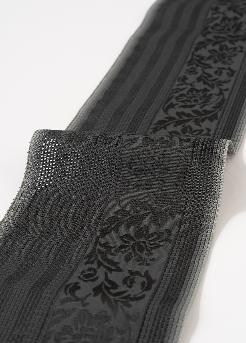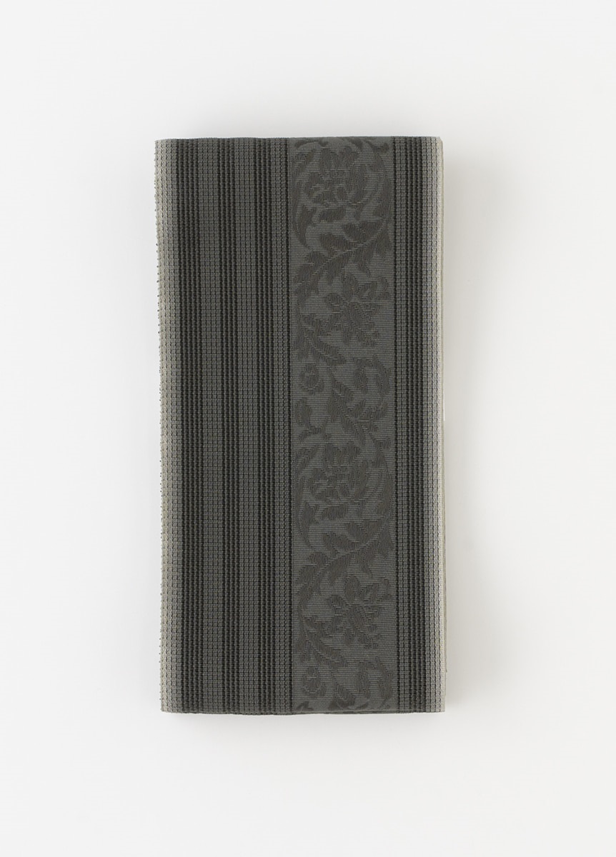 花唐草の上品さを際立たせる、ほんのりとしたぼかしが特長です。帯幅の両端に向かって糸色を変化させているため、結びによる帯の重なりは輪郭がはっきりと表れ、美しい着姿に。重厚感がありながらも、粗い目の織生地が絶妙な軽やかさを与えてくれます。灰色のぼかしでやわらかな印象に。墨黒の重たさを軽減しています。