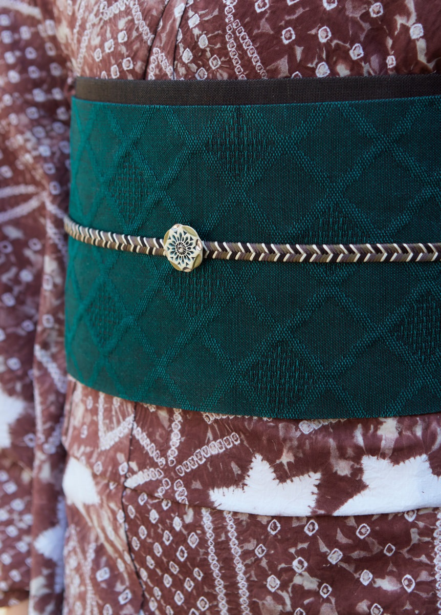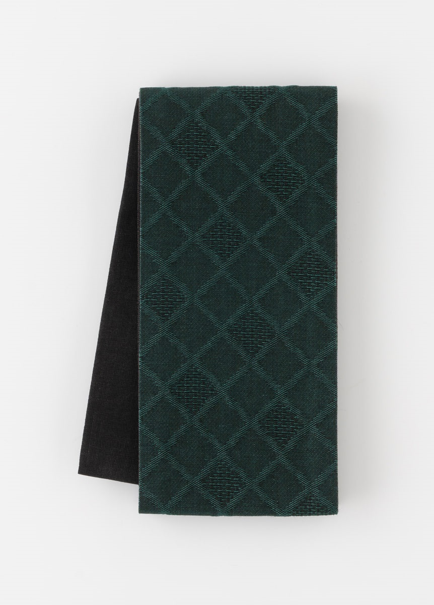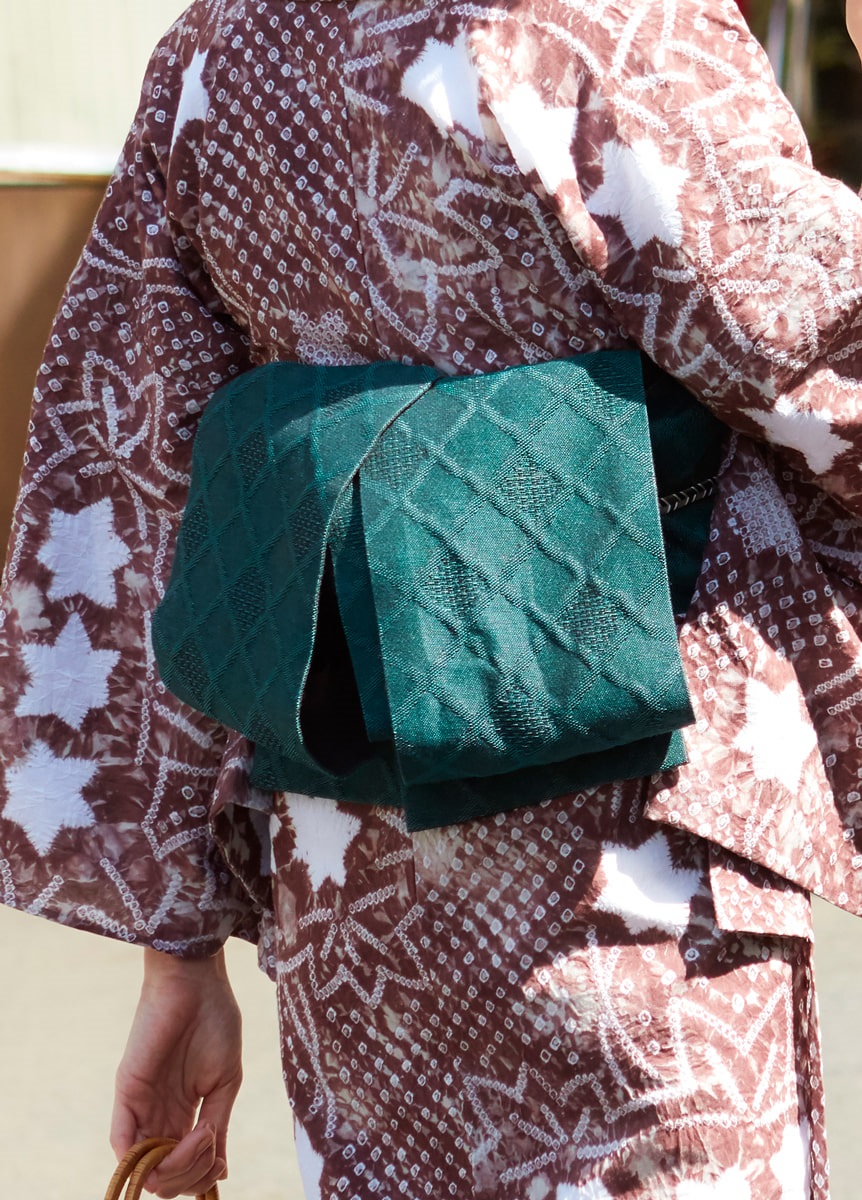 熱を加えて “ふくれ” と呼ばれる状態をつくり、菱柄を浮き出させています。部分的に菱柄の中を擬紗組織(粗い織模様)で織り上げ、涼しげな表情に仕上げました。しっかりとした生地感のため、木綿などカジュアルな着物に合わせて初春・初秋といった季節もお使いいただけます。