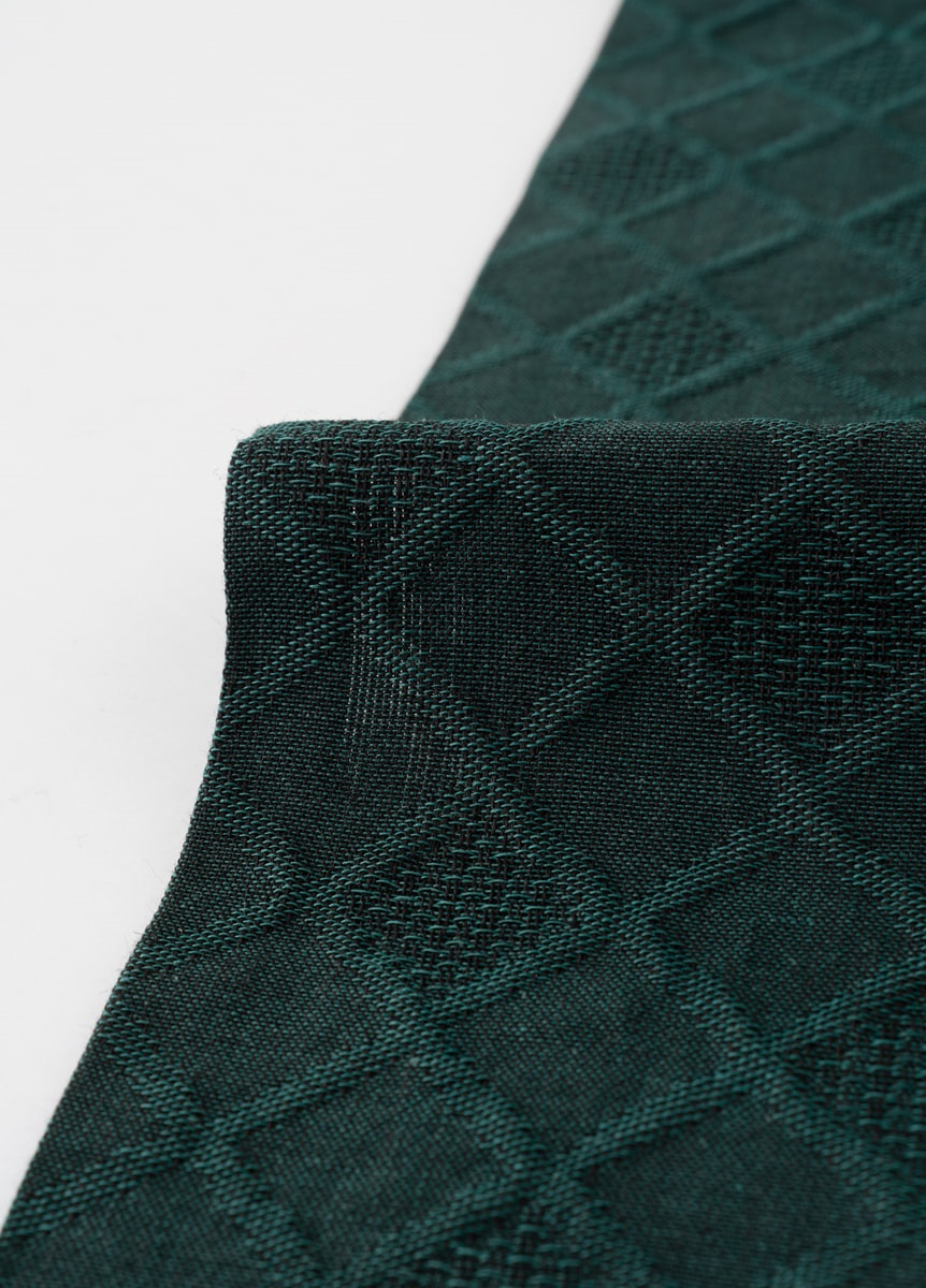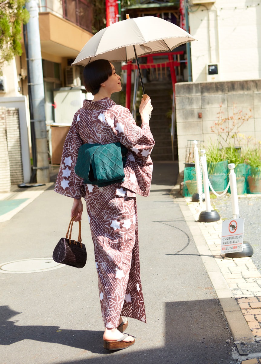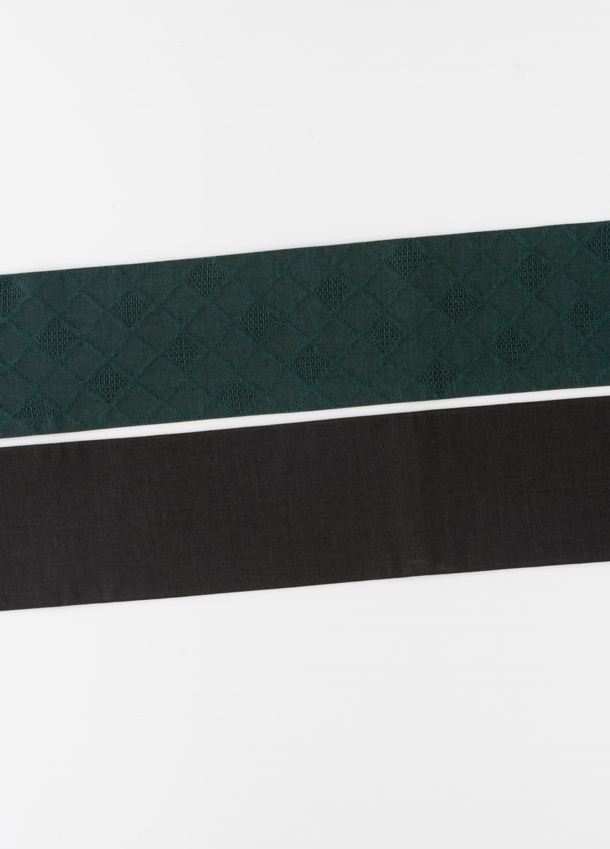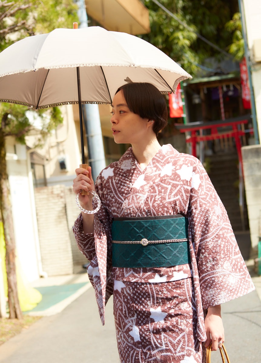 熱を加えて “ふくれ” と呼ばれる状態をつくり、菱柄を浮き出させています。部分的に菱柄の中を擬紗組織(粗い織模様)で織り上げ、涼しげな表情に仕上げました。しっかりとした生地感のため、木綿などカジュアルな着物に合わせて初春・初秋といった季節もお使いいただけます。