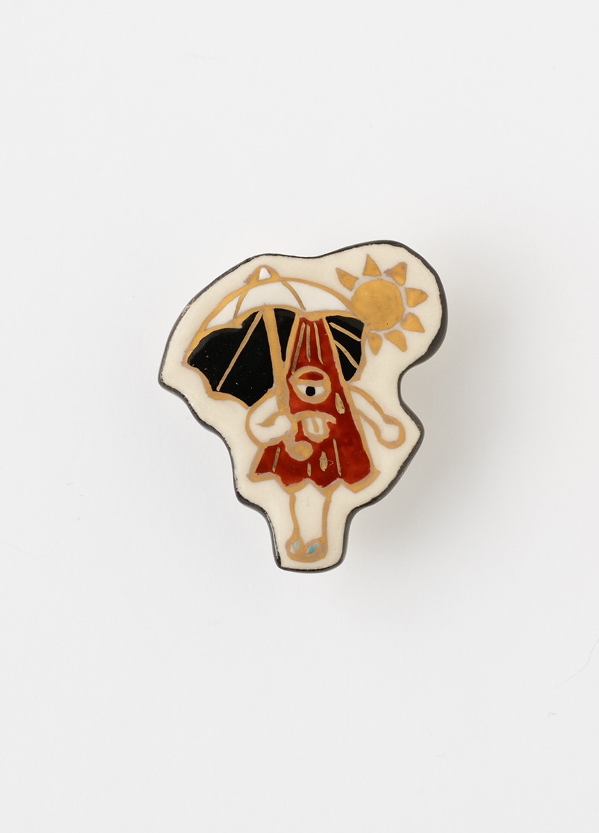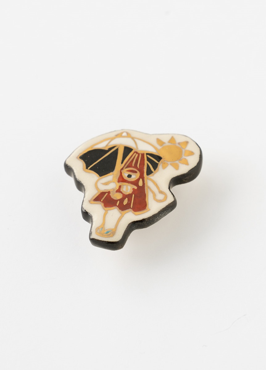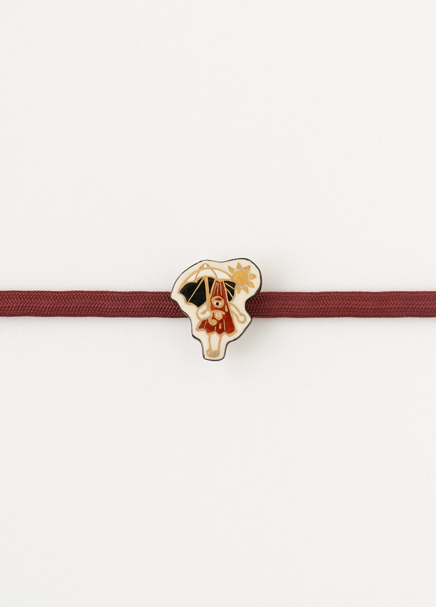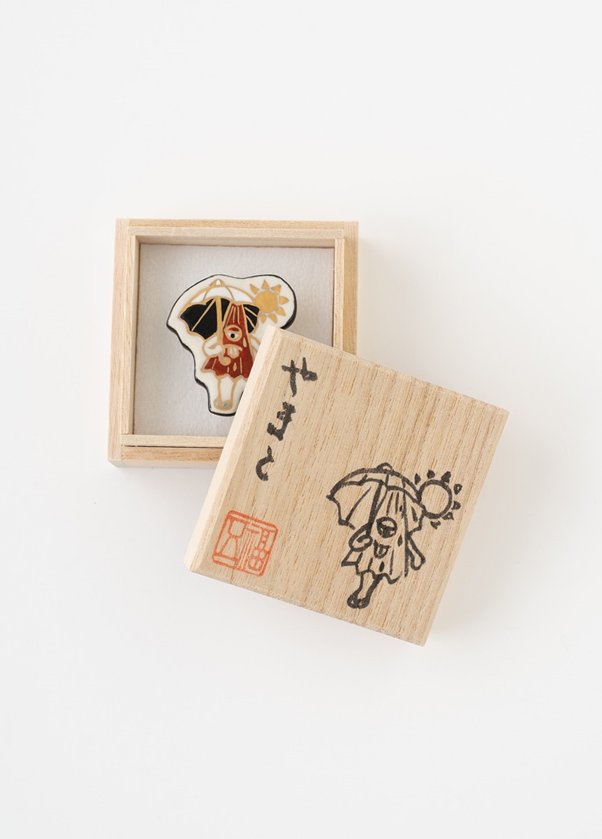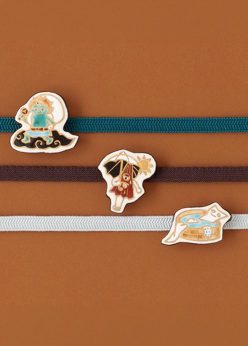 妖怪たちが暑い夏の中涼んでいる様子を、親しみやすくカラフルに描いた“涼怪”帯留です。かわいらしい絵付が特徴の、陶芸家五福香菜子氏が、一つ一つ手作りで仕上げています。涼怪たちが一箱ずつ丁寧に描かれた、オリジナル桐箱入りです。