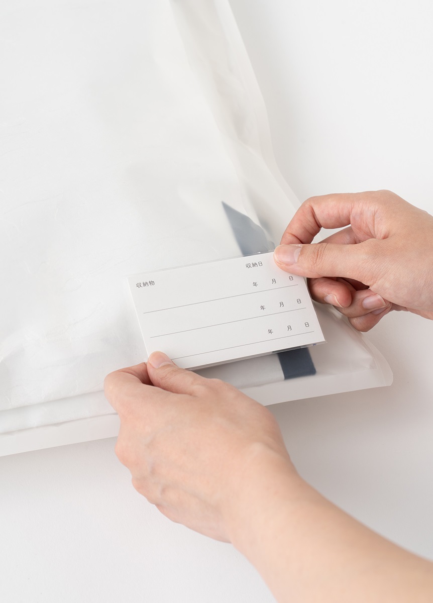 ③ 付属のカードに収納物と収納日を記入し、「スマートポケット」 に入れて「きもの安心保管袋」に貼ります。