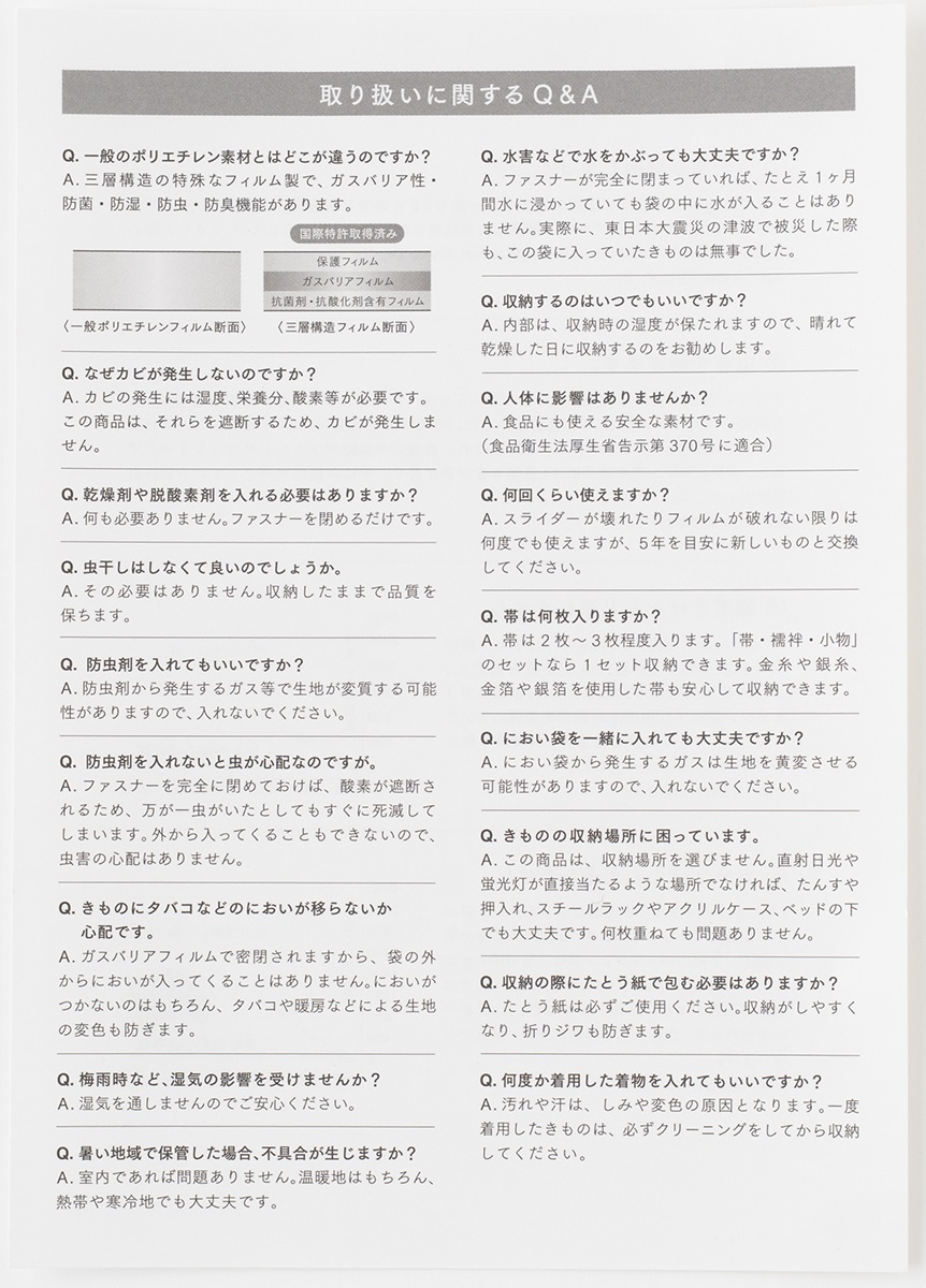 A.たとう紙は必ずご使用ください。収納しやすくなり、折りジワも防ぎます。