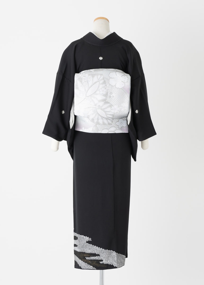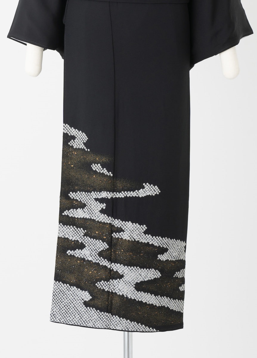 鹿の子絞りで流水を表現した黒留袖です。鹿の子絞りは子鹿の斑点に由来し子孫繁栄の意味合いを持ち、流水柄は清らかさや魔除けを意味します。シンプルながら縁起の良いデザインです。